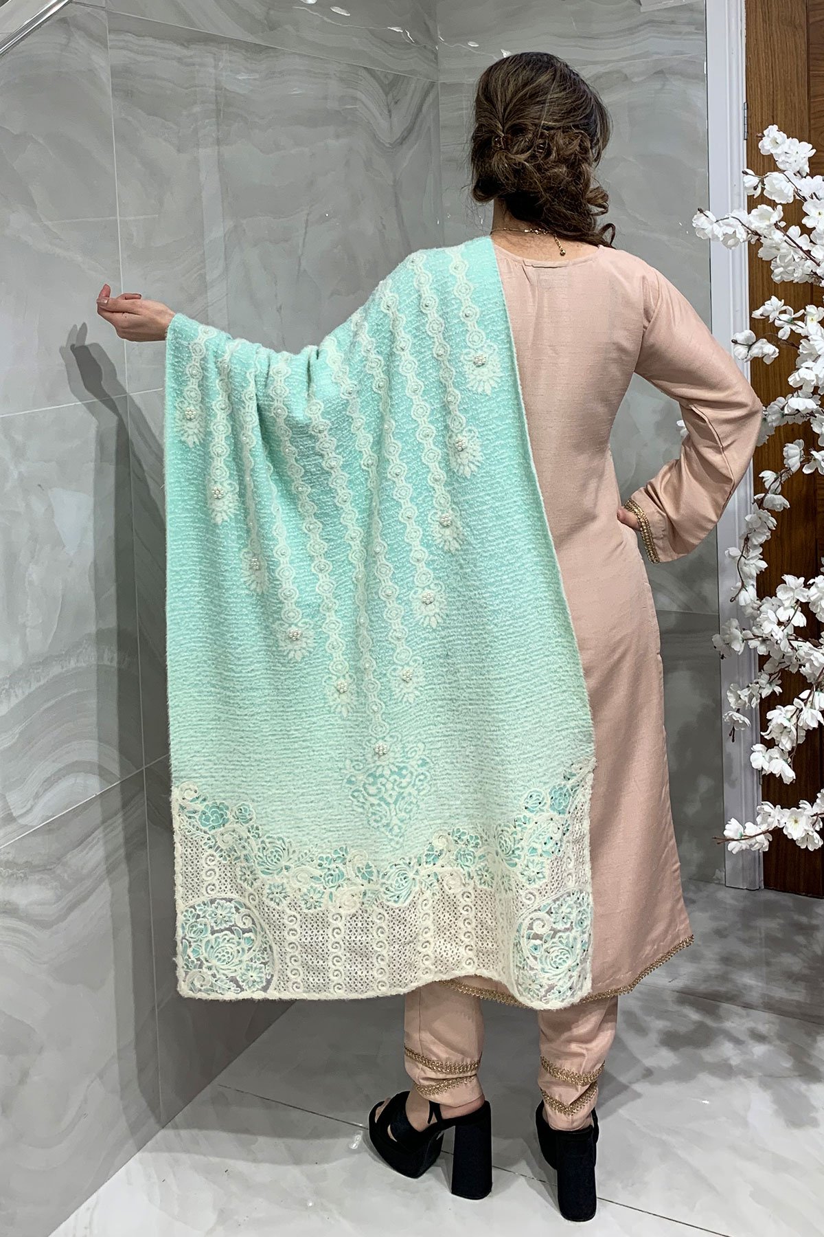 Add a touch of elegance to your wardrobe with this exquisite piece of beautifully hued printed shawl. Swathed with pretty cream coloured thread work weaving along the middle, finished with pearl embellishments in the middle. This classic stunner is a must in your ethnic collection.