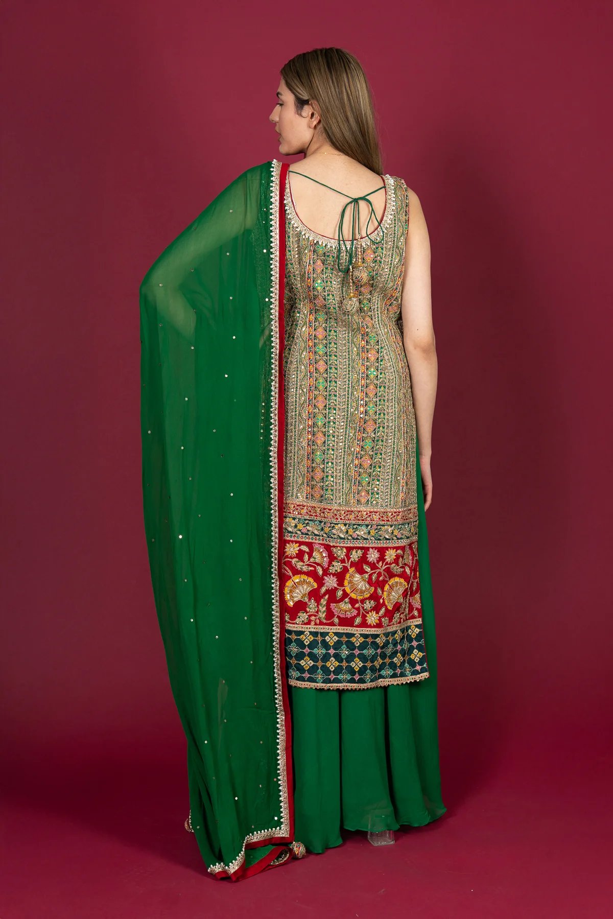 This beautiful 3 piece long shirt collection features a crepe long shirt adorned with intricate threadwork all over. It includes extra detachable material to cover the back neckline for added versatility. Paired with a plain georgette sharara and a net dupatta with lace borders, this ensemble is a perfect blend of elegance and sophistication for special occasions.