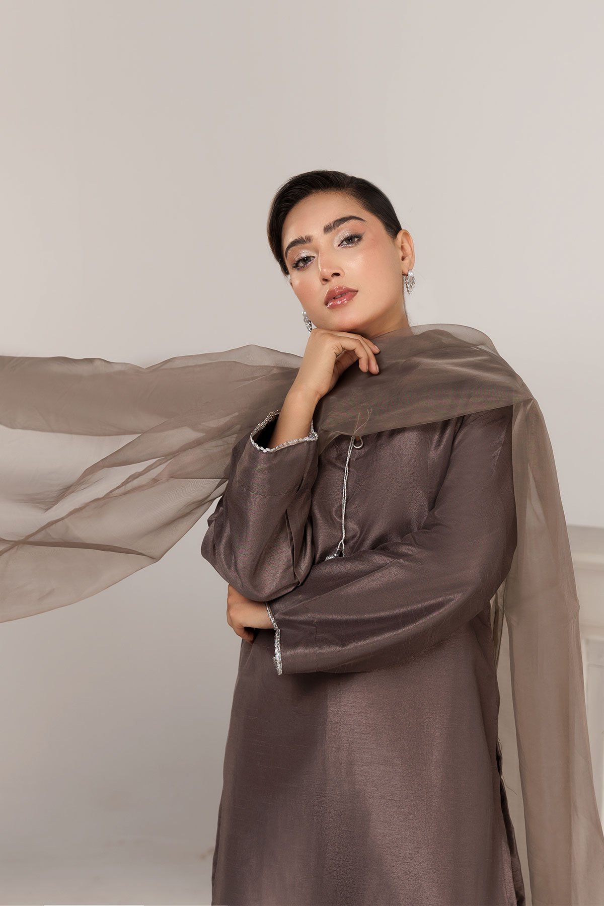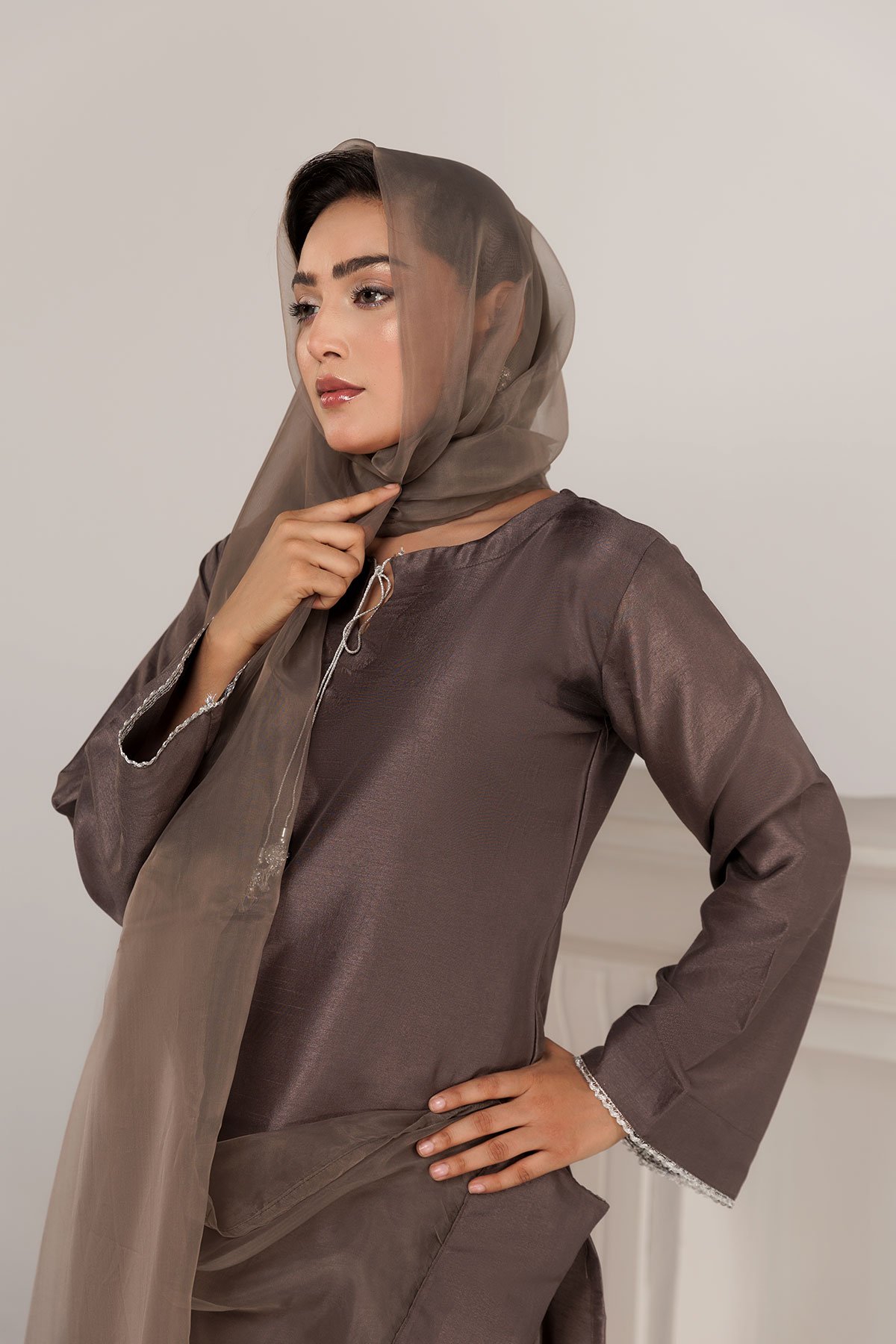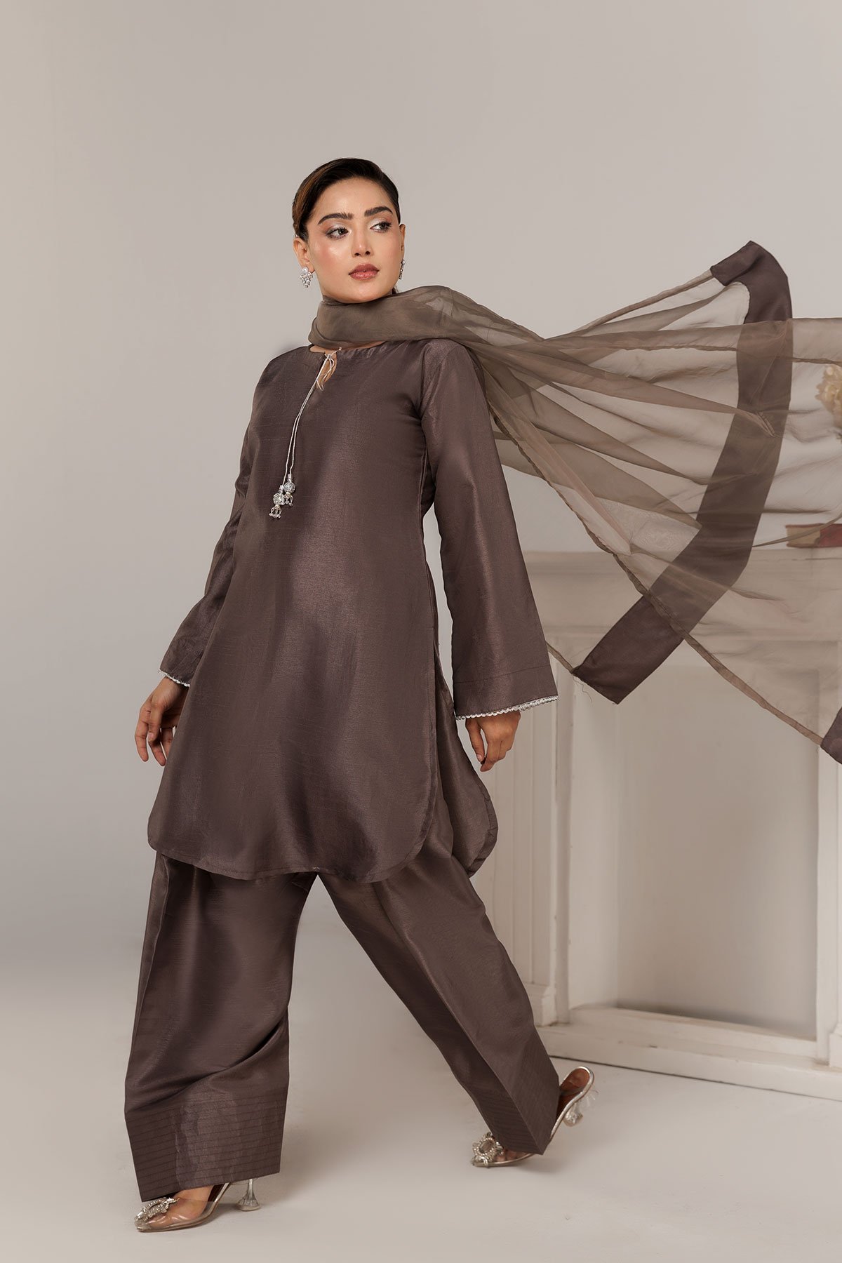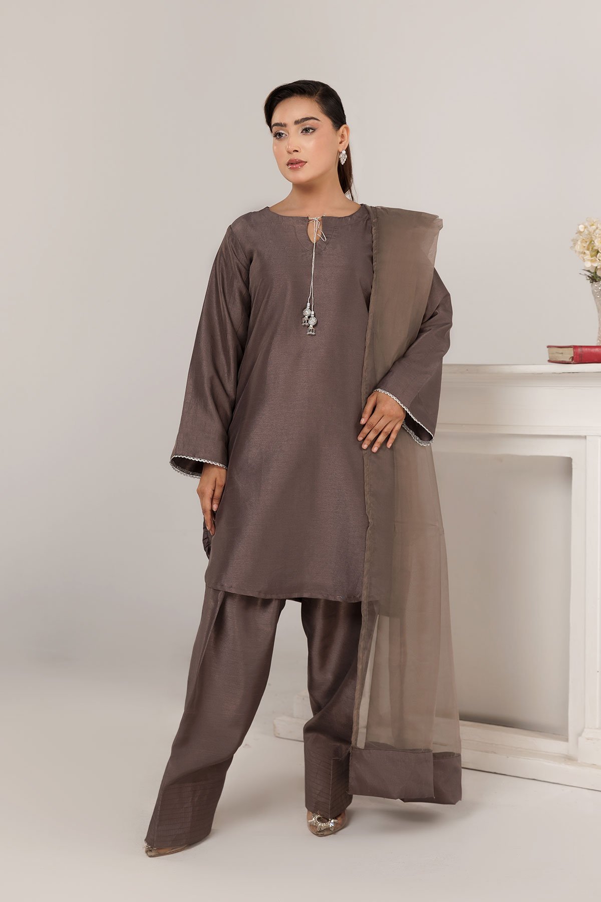 This beautiful Shiffonz 3-piece set is designed for effortless elegance, featuring a flowy straight-cut silhouette in rich silk. The kameez has delicate tassel embellishment along the neckline, finished with full length plain sleeves. Paired with a classic silk shalwar for comfort and a lightweight organza dupatta. Easy to wear and perfect for Eid.