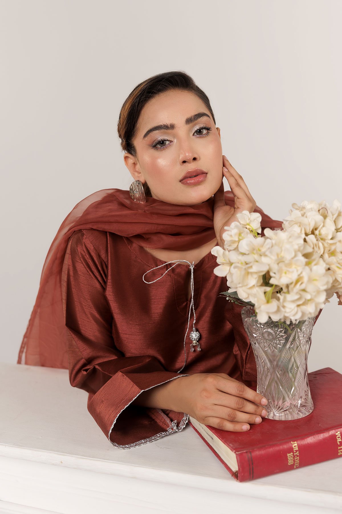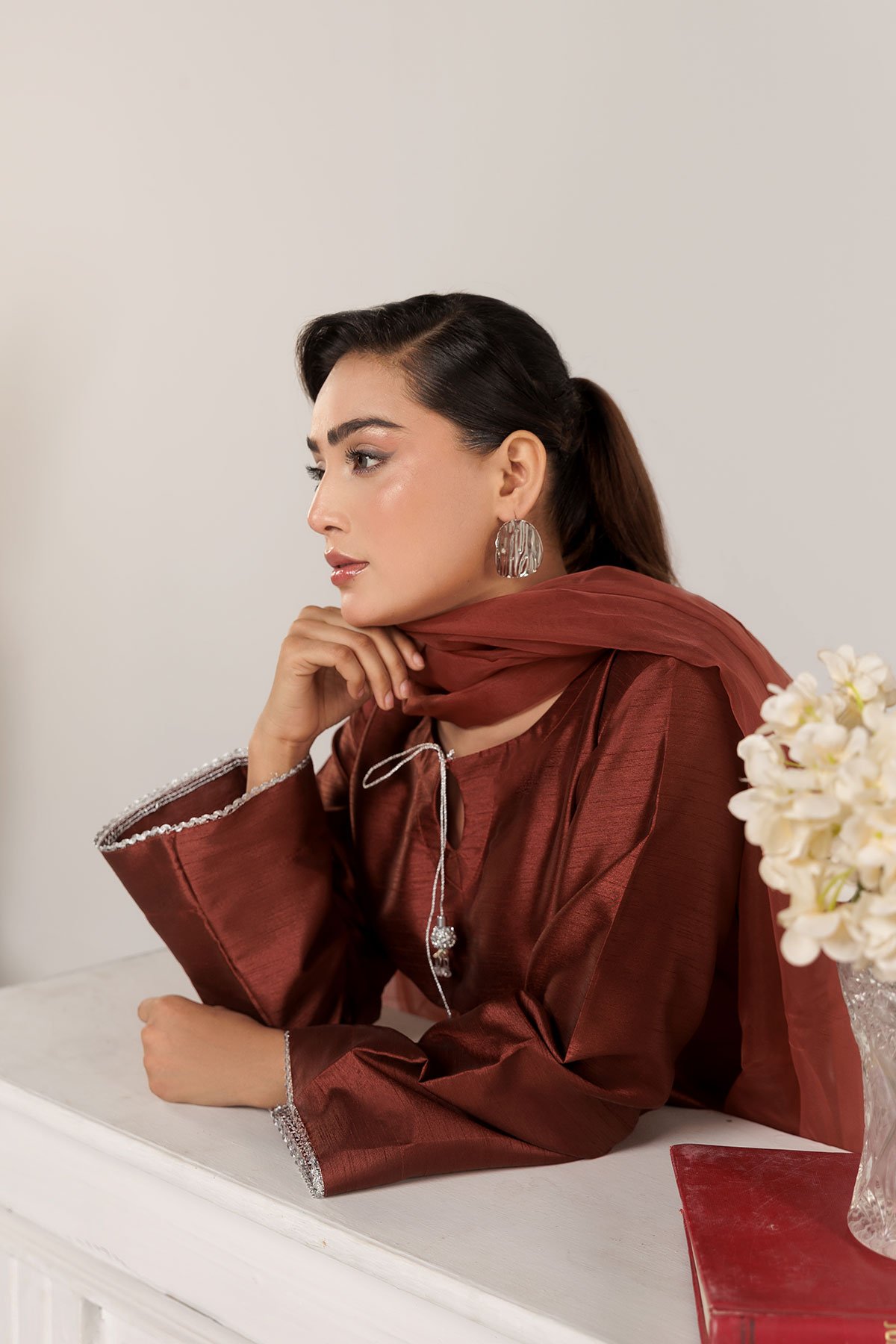 This beautiful Shiffonz 3-piece set is designed for effortless elegance, featuring a flowy straight-cut silhouette in rich silk. The kameez has delicate tassel embellishment along the neckline, finished with full length plain sleeves. Paired with a classic silk shalwar for comfort and a lightweight organza dupatta. Easy to wear and perfect for Eid.