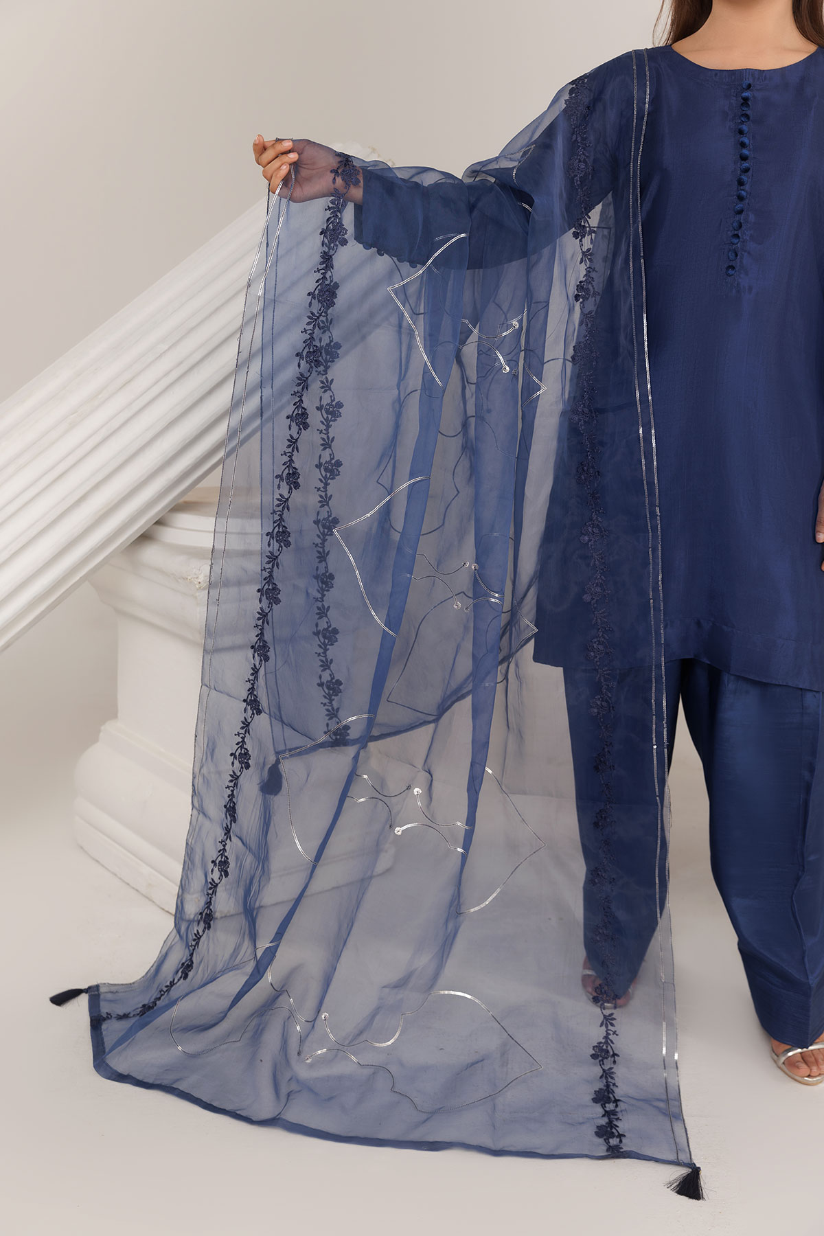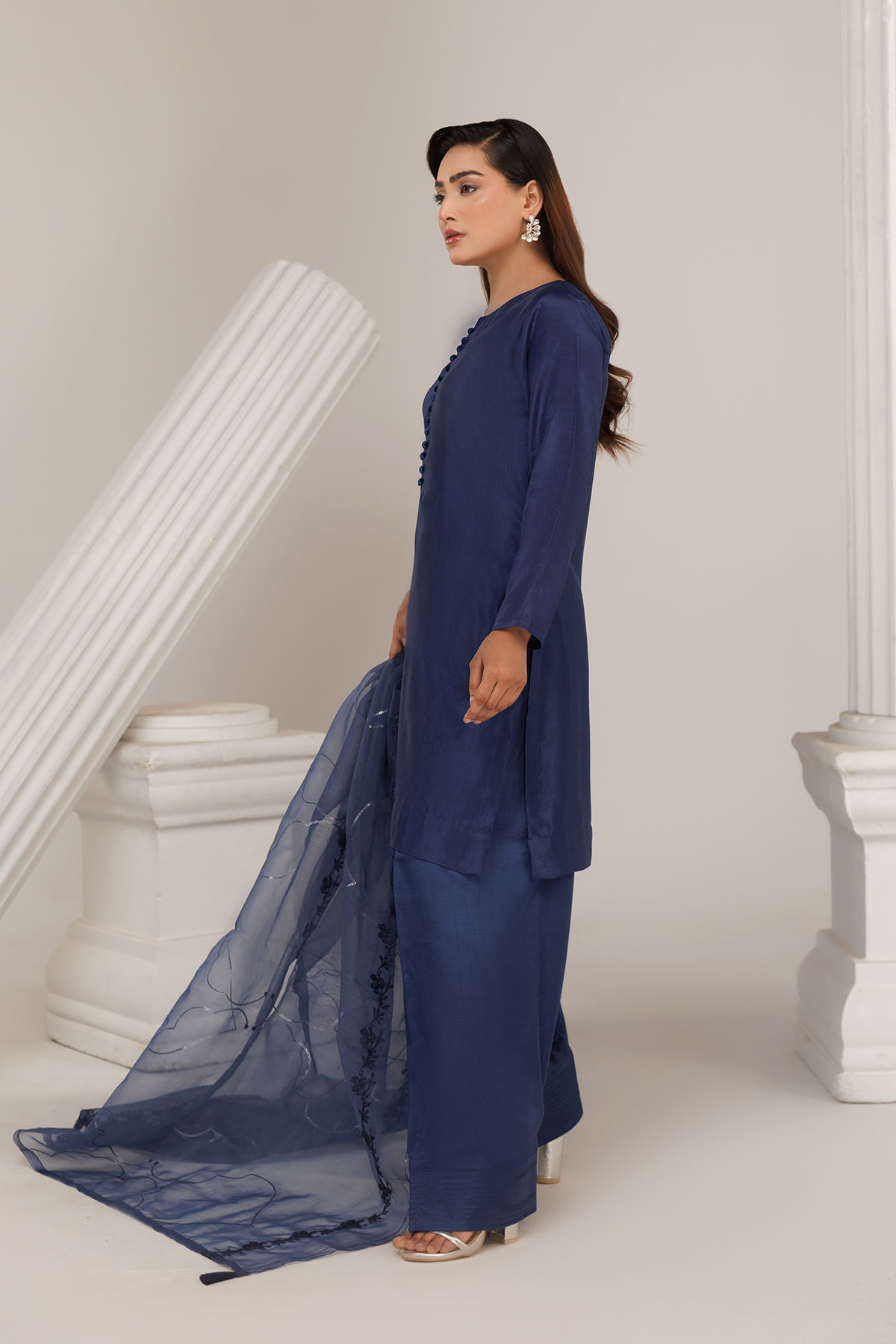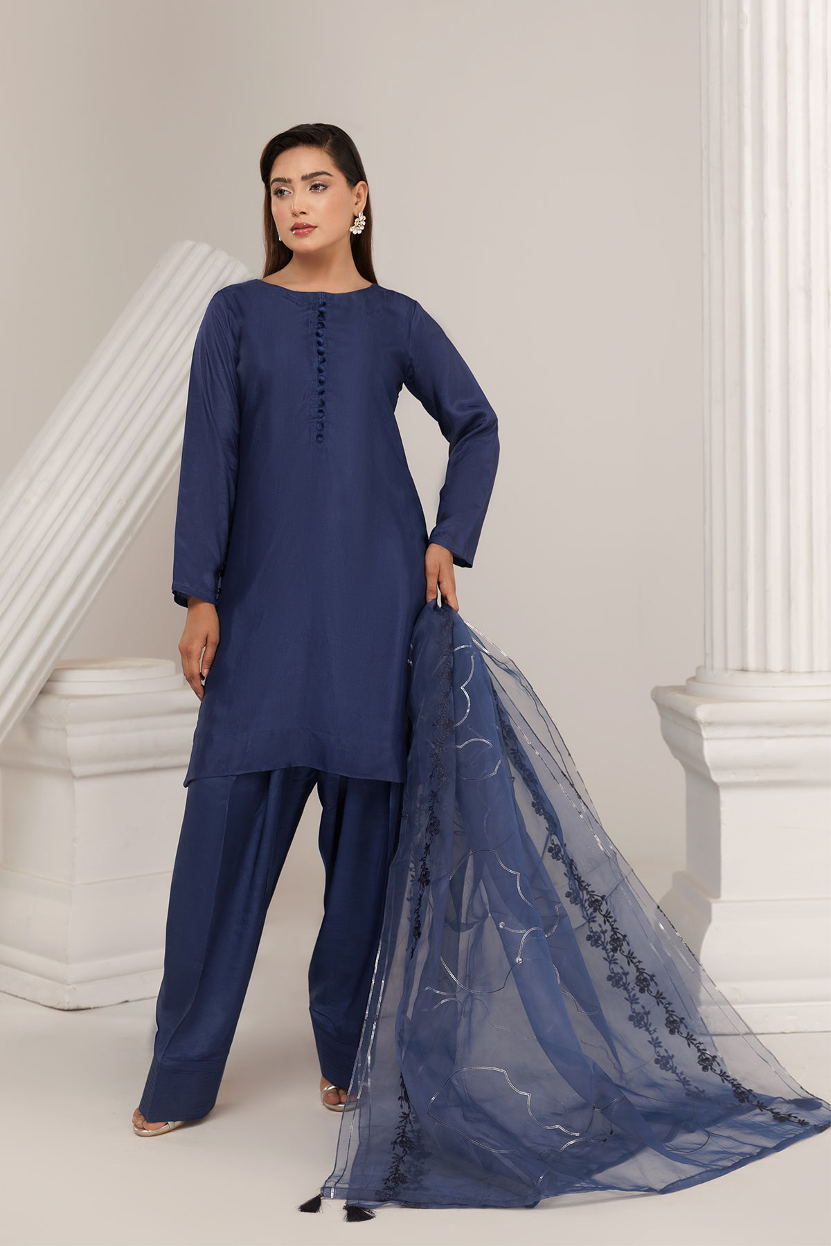 This beautiful Shiffonz 3-piece set is designed for effortless elegance, featuring a flowy straight-cut silhouette in rich silk. The kameez has delicate fabric-covered buttons along the neckline, finished with full length plain sleeves. Paired with a classic silk shalwar for comfort and a lightweight organza dupatta. Easy to wear and perfect for Eid.