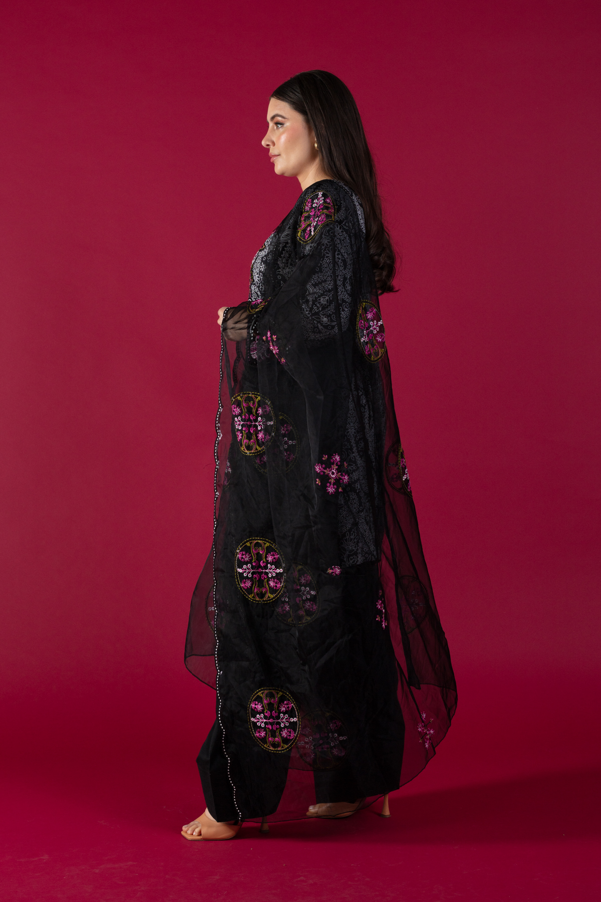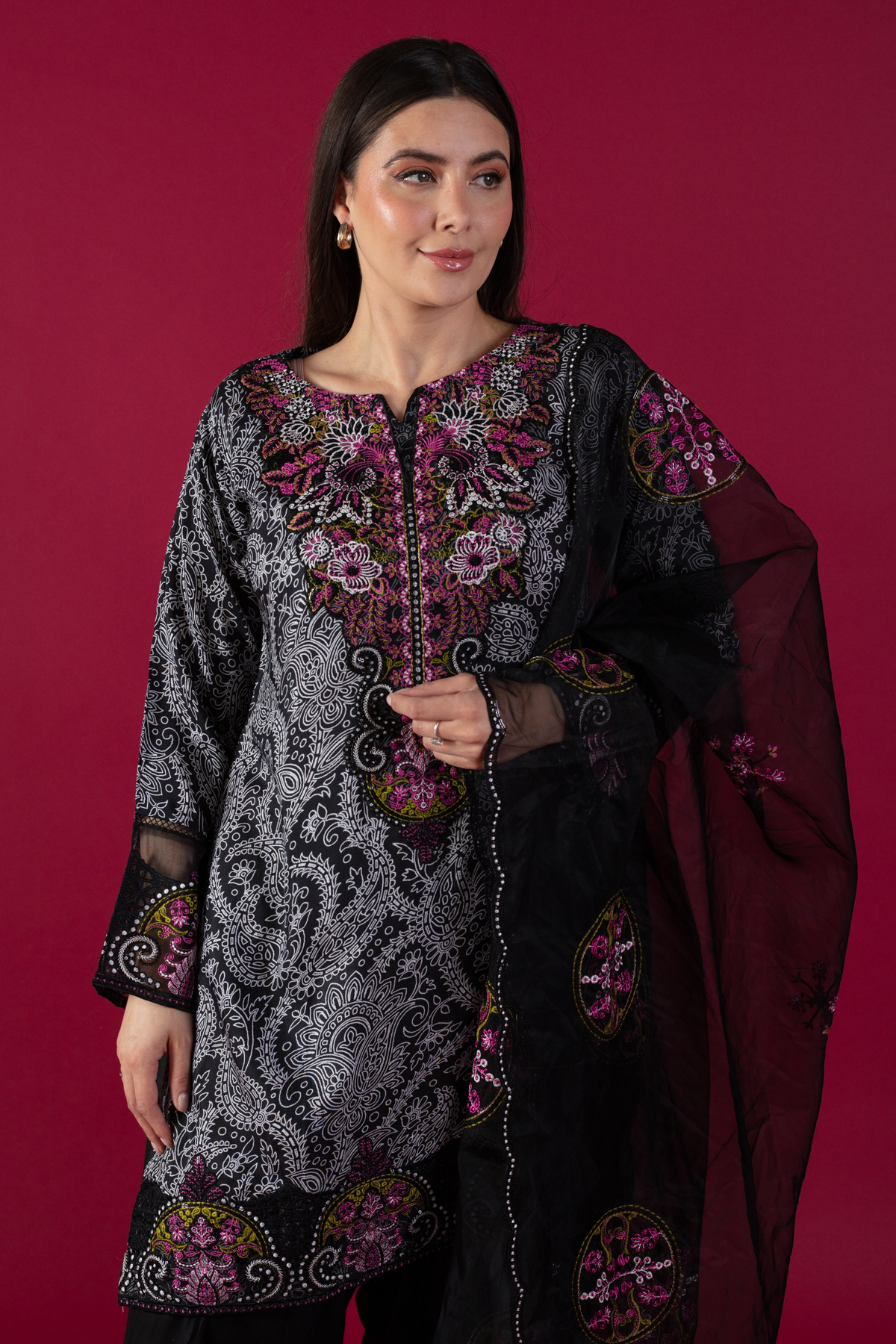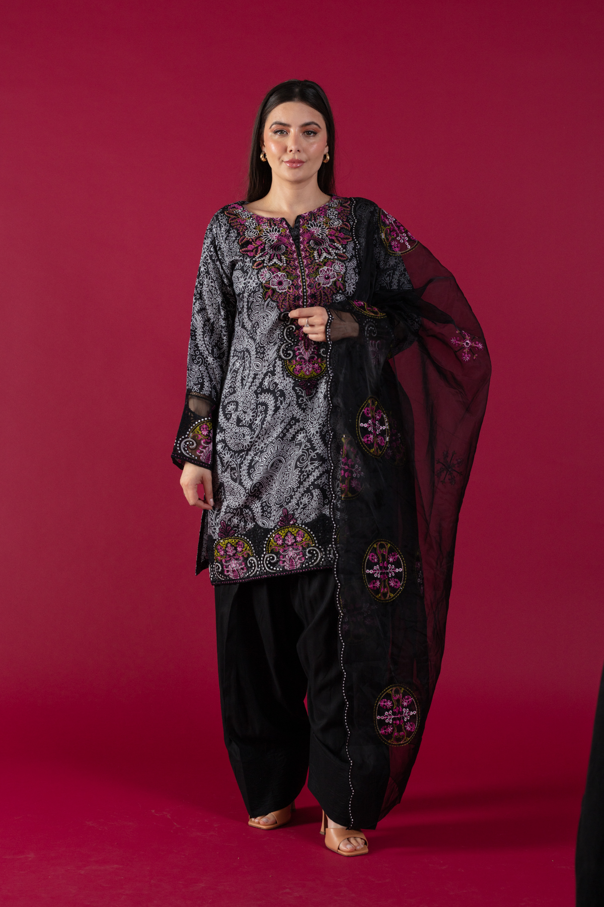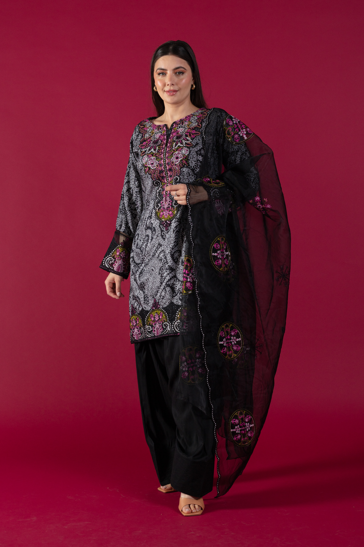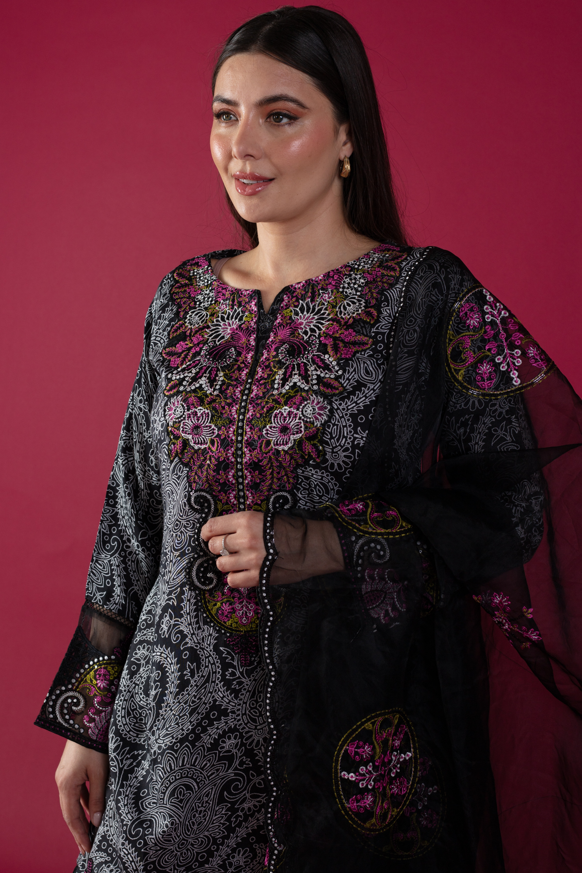 This beautiful 3 piece suit features a straight printed shirt with luxury thread work embroidery throughout the front with full length embroidered sleeves. Paired with a plain farshi shalwar and the look is finished with an embroidered organza dupatta.