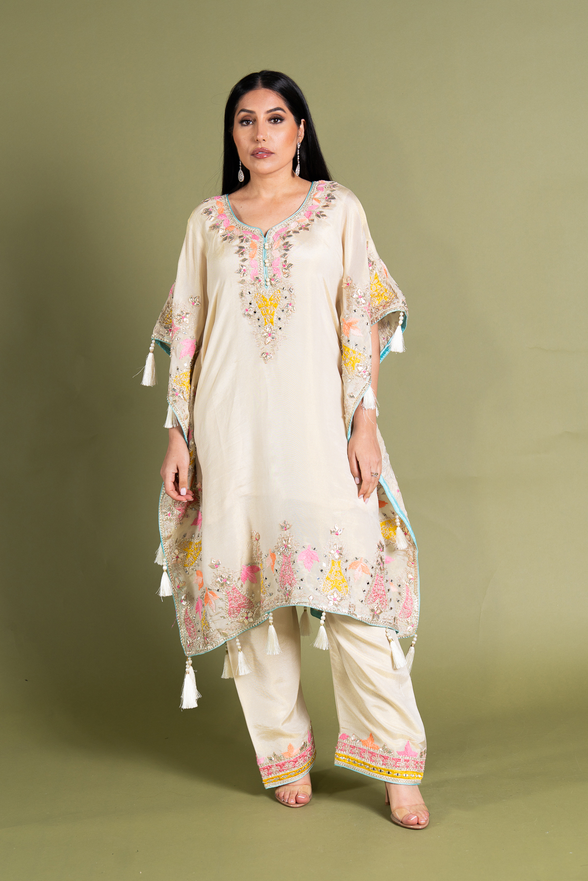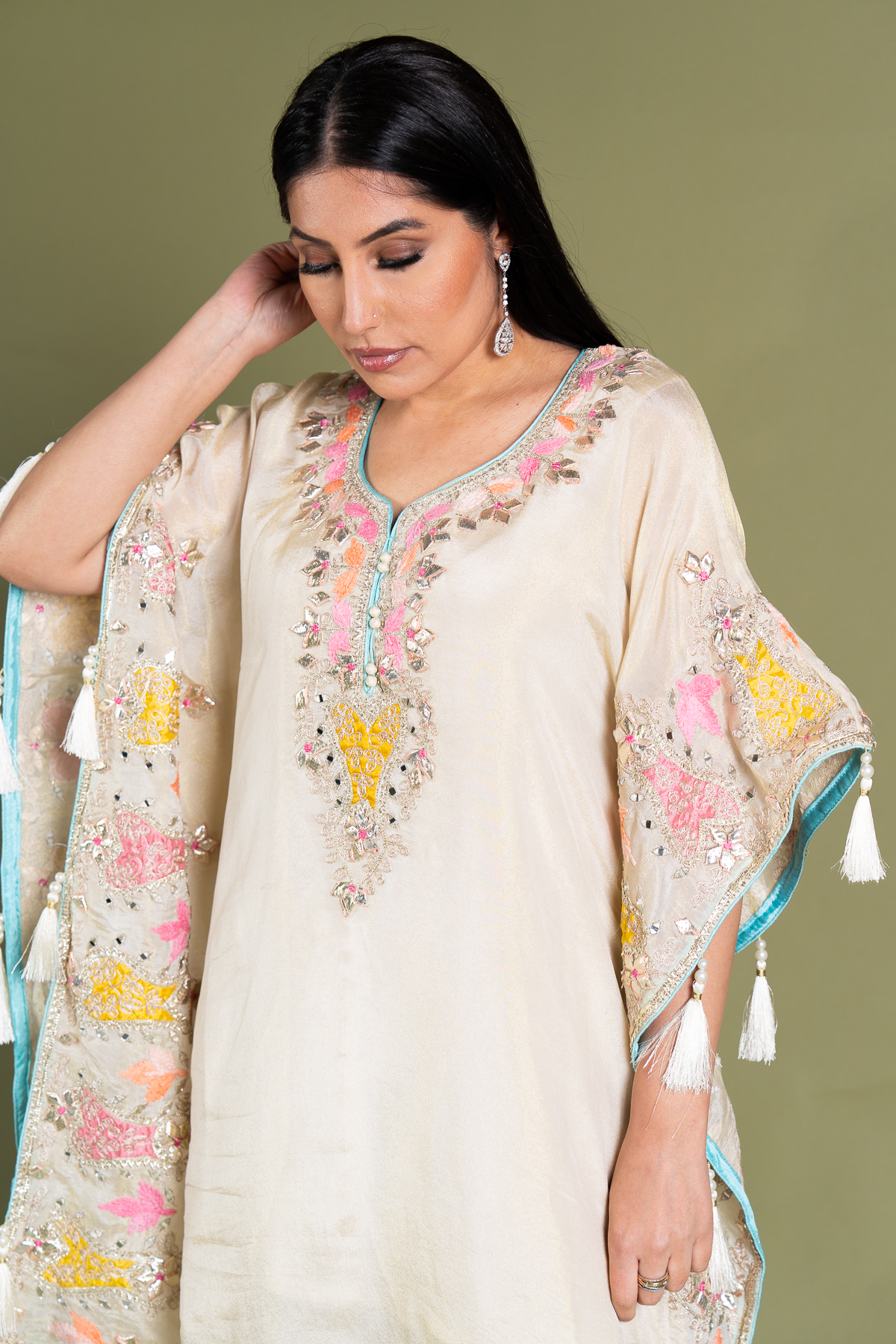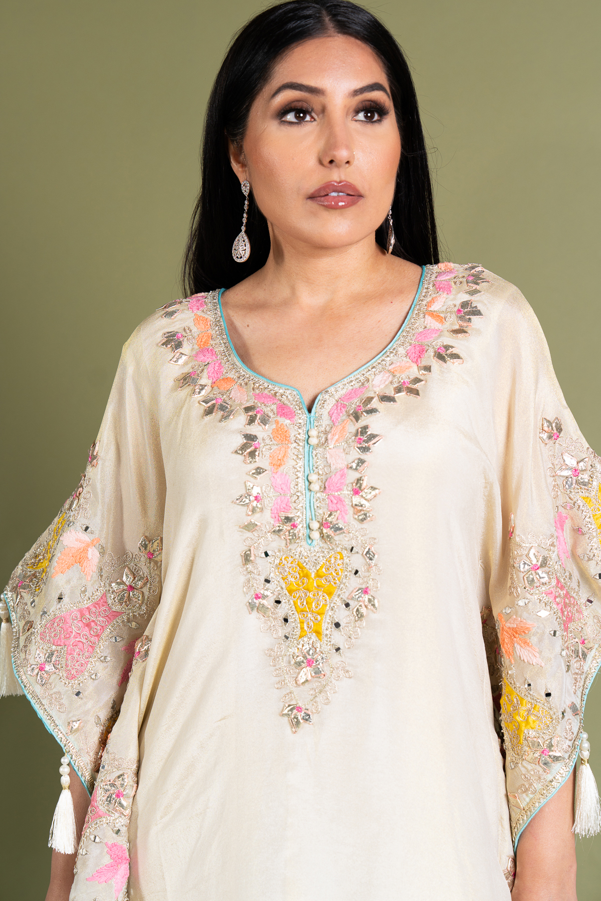 This beautiful 2-piece kaftan suit is crafted from luxurious pure shimmer fabric, adorned with intricate threadwork for an exquisite touch. It is paired with matching pure shimmer trousers, creating a sophisticated and effortlessly stylish look. Perfect for special occasions, this ensemble blends elegance with modern charm.