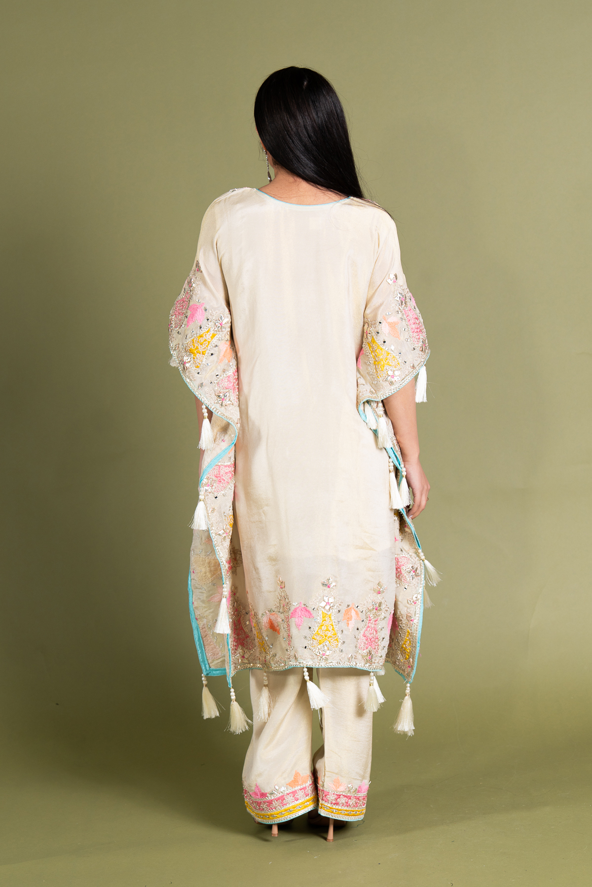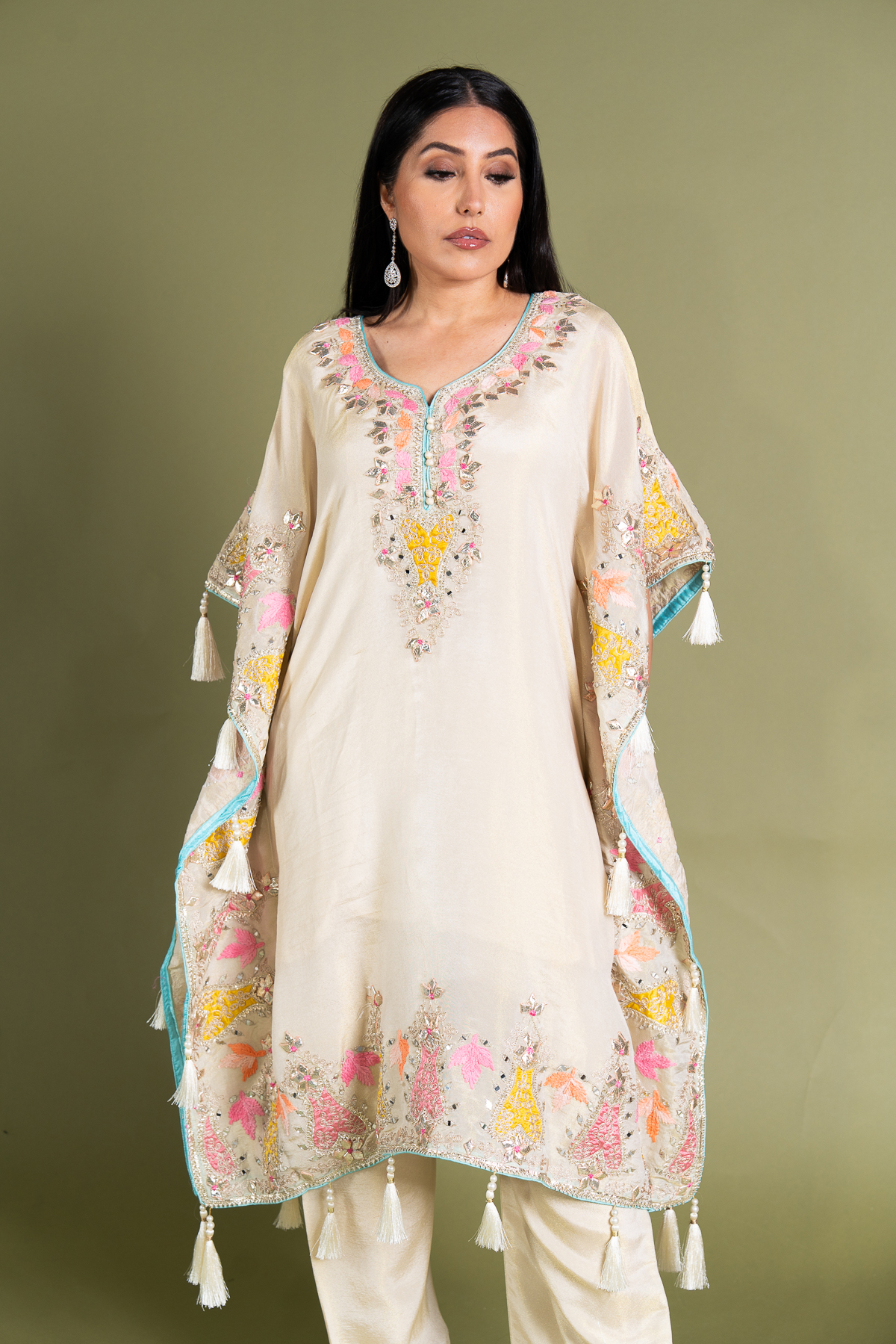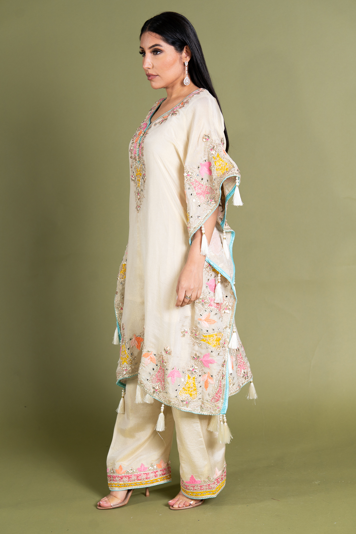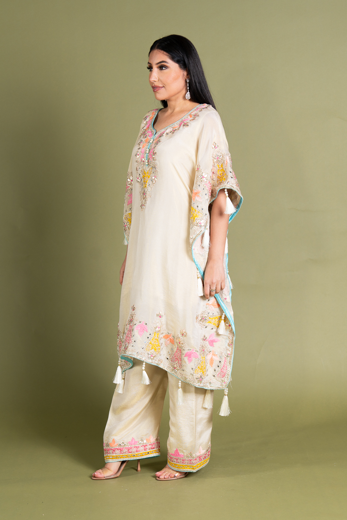 This beautiful 2-piece kaftan suit is crafted from luxurious pure shimmer fabric, adorned with intricate threadwork for an exquisite touch. It is paired with matching pure shimmer trousers, creating a sophisticated and effortlessly stylish look. Perfect for special occasions, this ensemble blends elegance with modern charm.