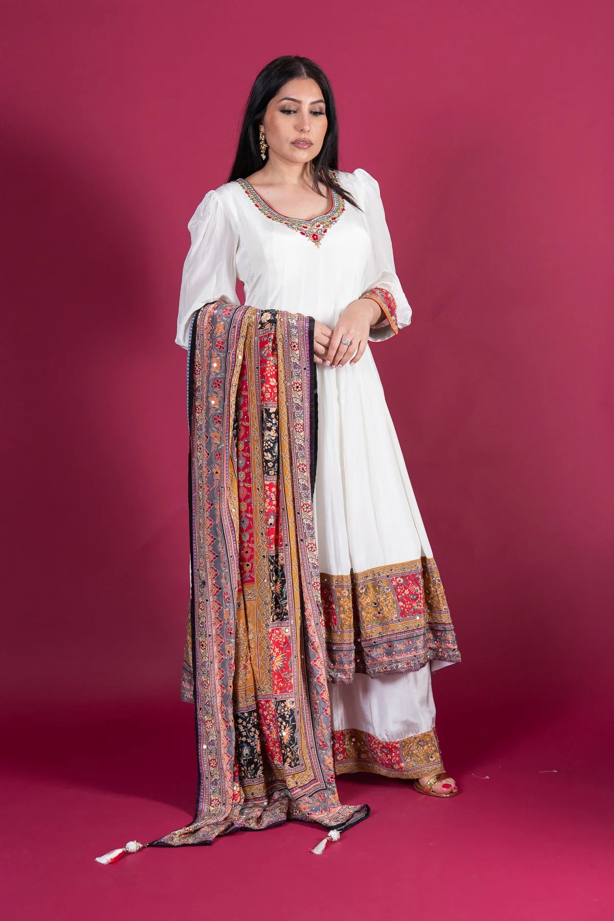 This beautiful 3-piece anarkali suit is crafted from luxurious silk, featuring intricate mirror embellishments along the neckline and hem for an elegant touch. The matching silk plazo provides a graceful silhouette, ensuring both comfort and style. Completing the ensemble is a fully mirror-worked silk dupatta, adding a stunning, radiant finish. Perfect for festive occasions and celebrations.