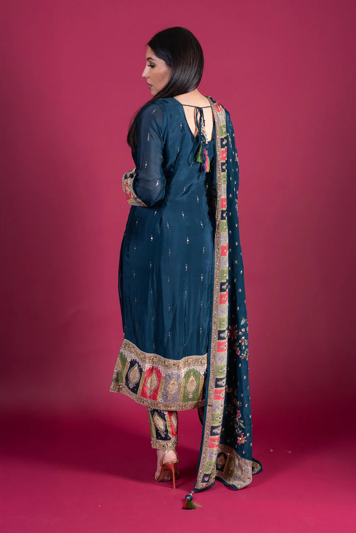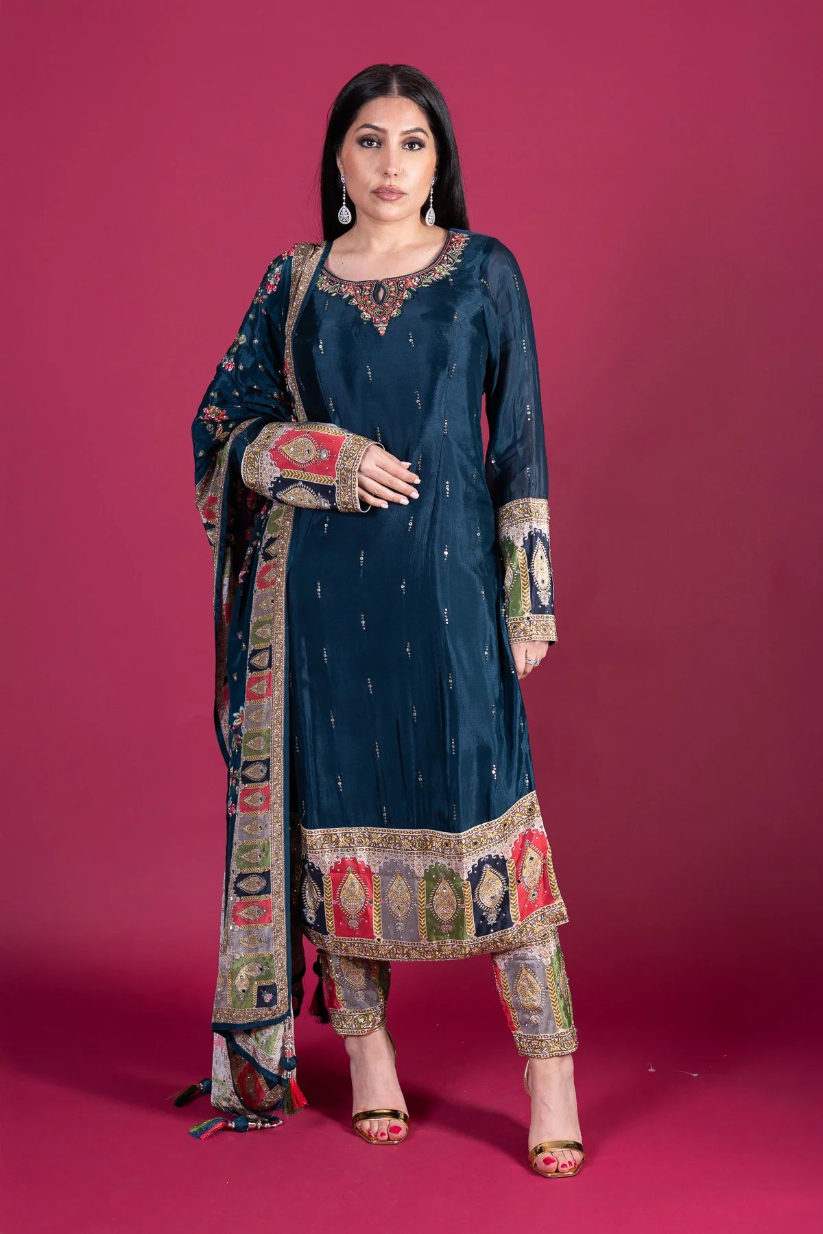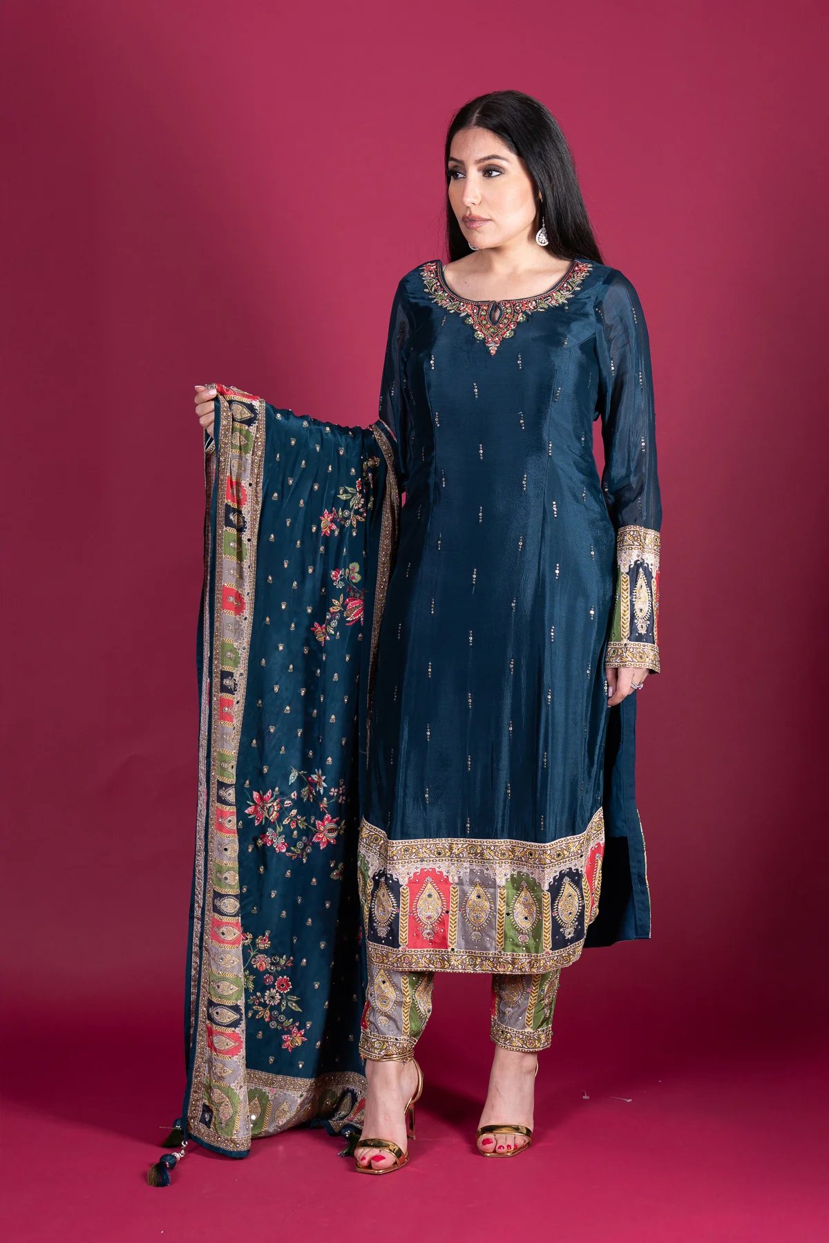 This beautiful 3-piece long shirt suit is crafted from luxurious silk, featuring intricate embroidery and mirror work on the neckline for a sophisticated touch. The silk trousers are adorned with mirror detailing at the hem, adding a subtle shimmer. A fully mirror-worked silk dupatta completes the look, making this outfit perfect for festive occasions and special gatherings.
