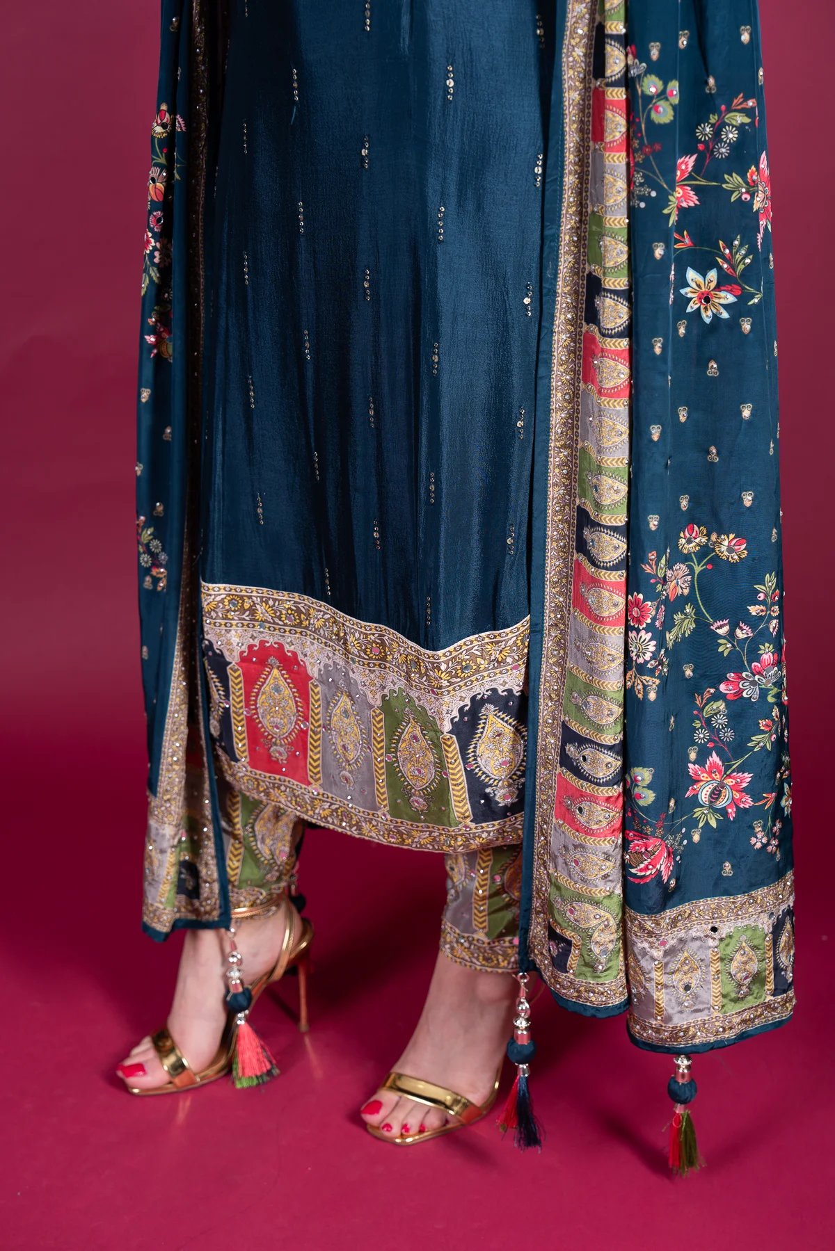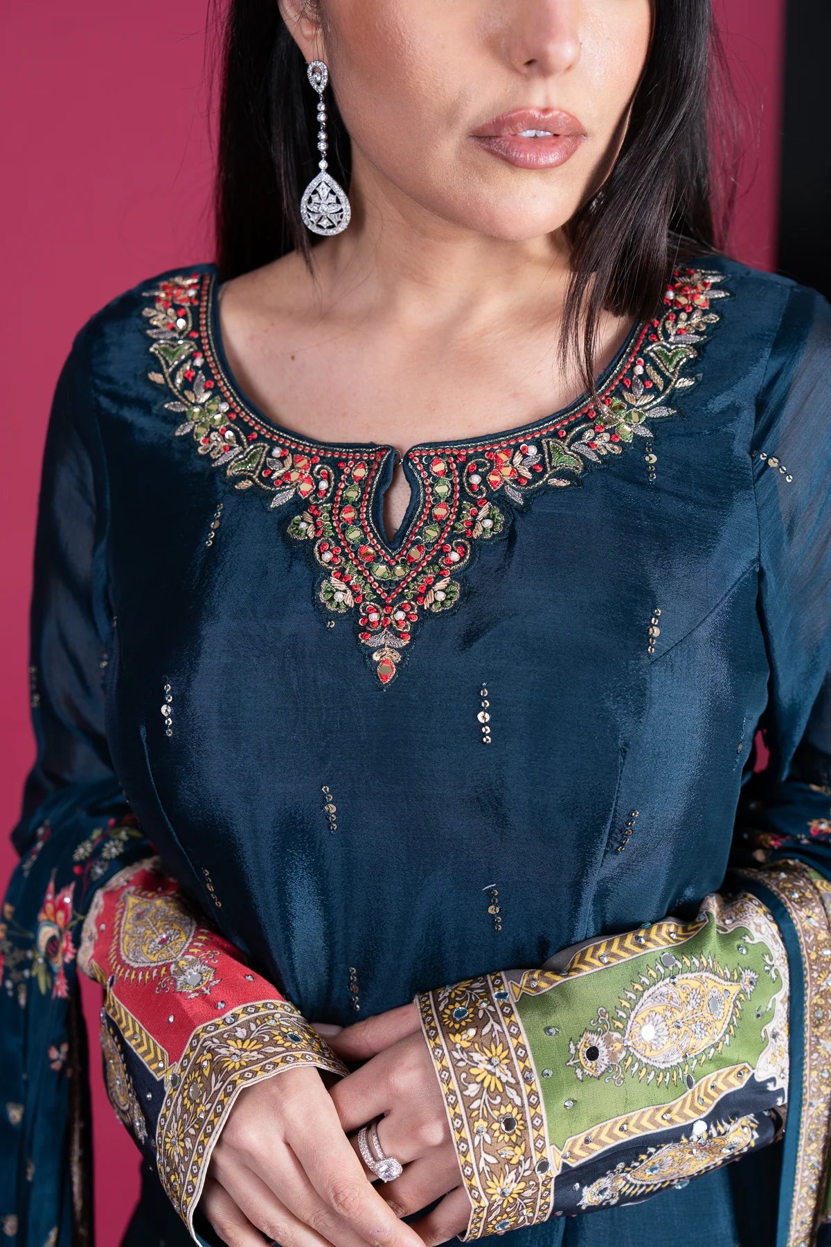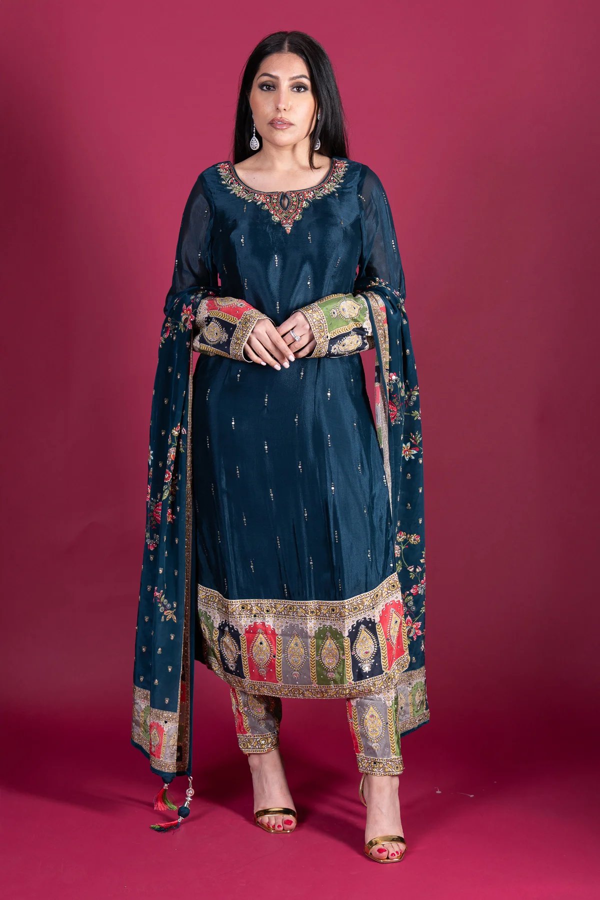 This beautiful 3-piece long shirt suit is crafted from luxurious silk, featuring intricate embroidery and mirror work on the neckline for a sophisticated touch. The silk trousers are adorned with mirror detailing at the hem, adding a subtle shimmer. A fully mirror-worked silk dupatta completes the look, making this outfit perfect for festive occasions and special gatherings.