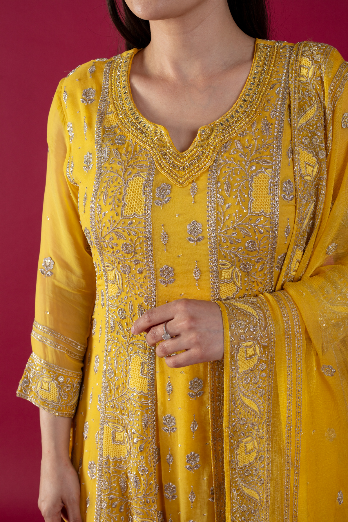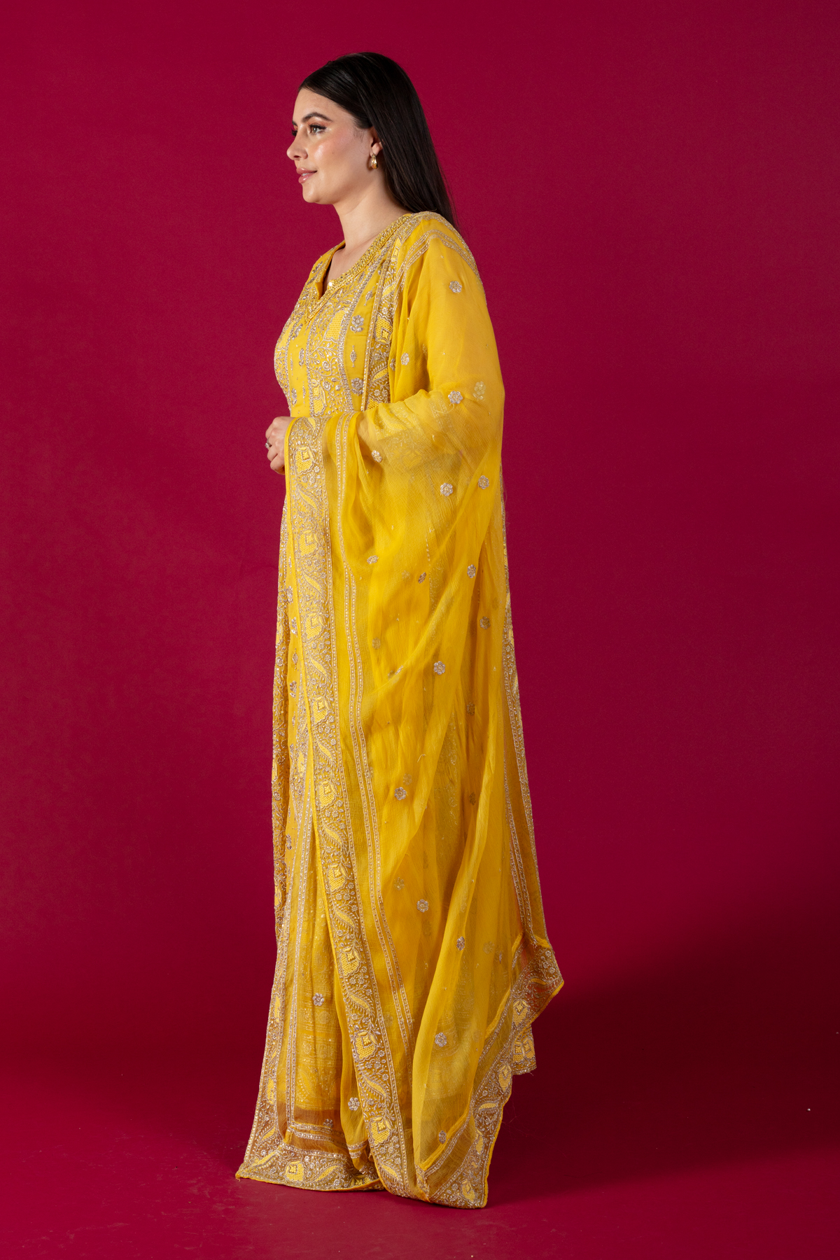 This beautiful Shiffonz suit features a long maxi dress with luxury thread work embroidery throughout with sequence embellishments, finished with full length embroidered sleeves. Paired with straight leg trousers. The look is finished with a chiffon embroidered dupatta.