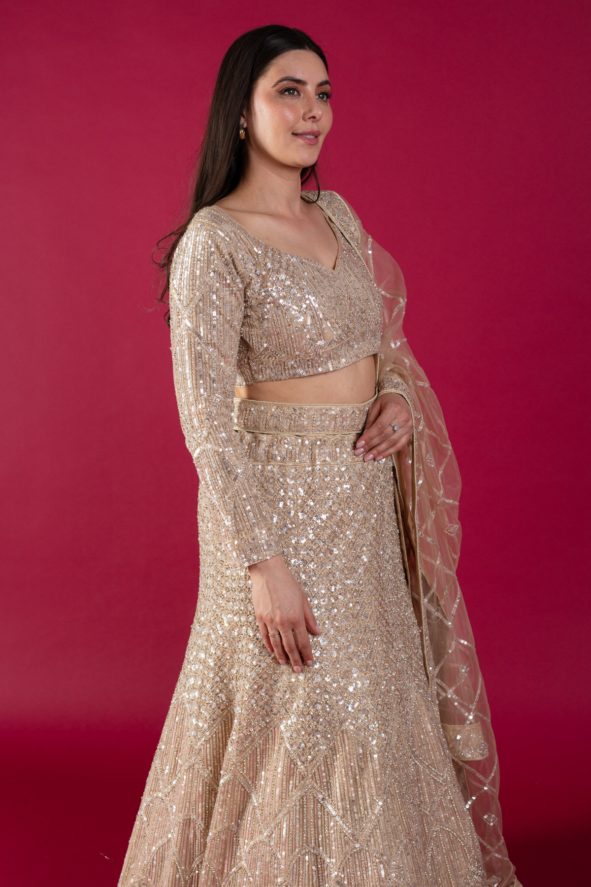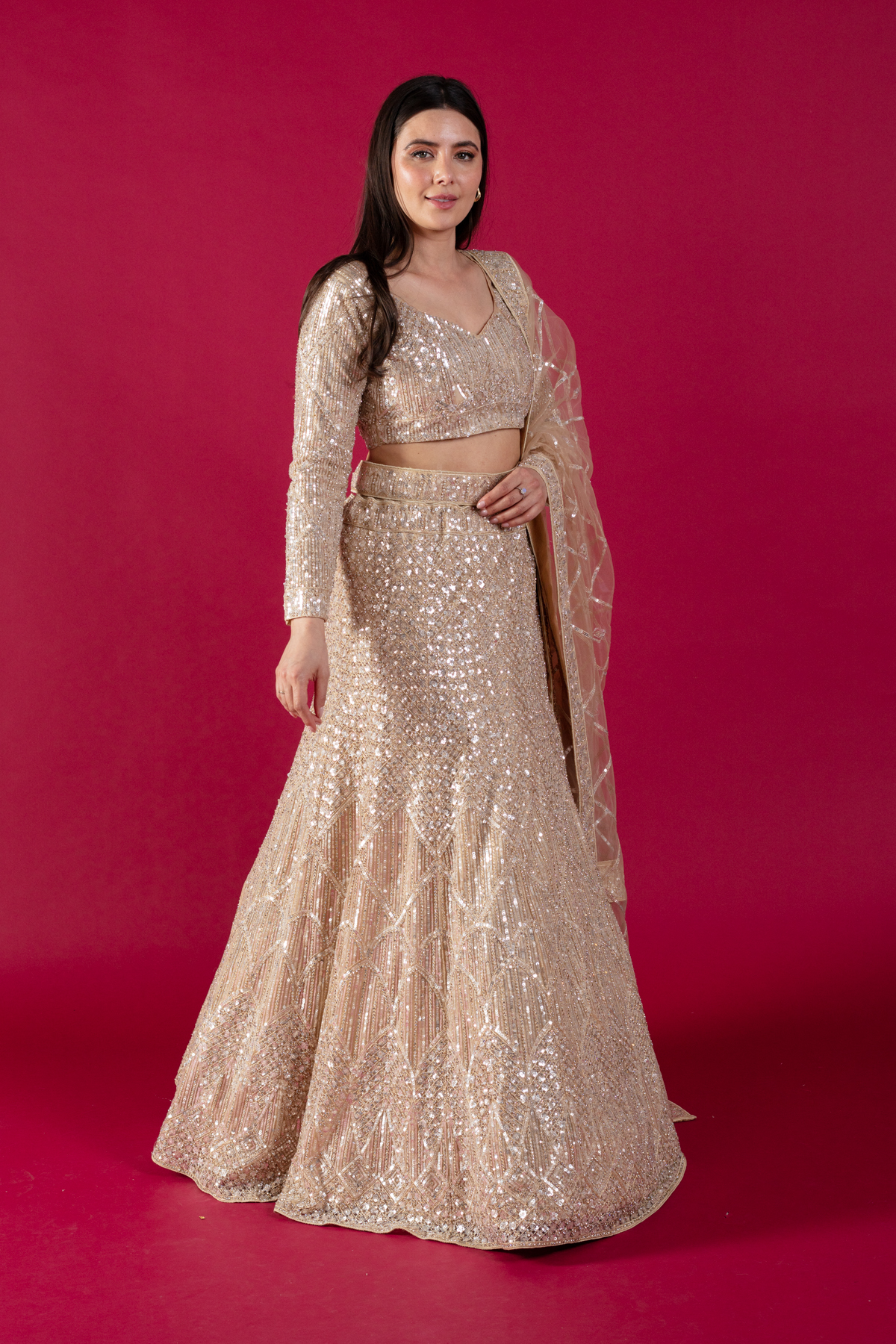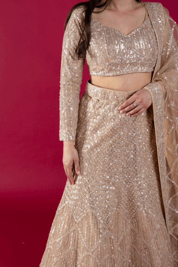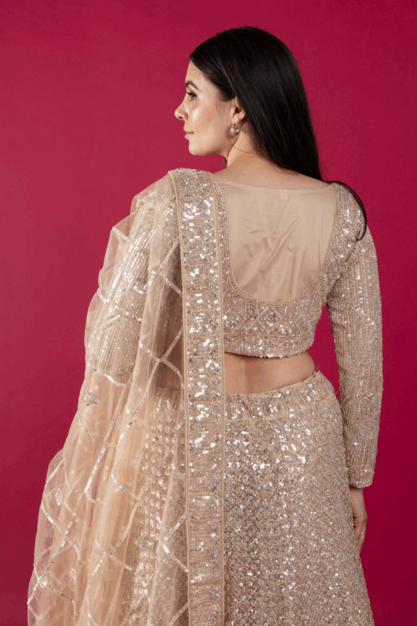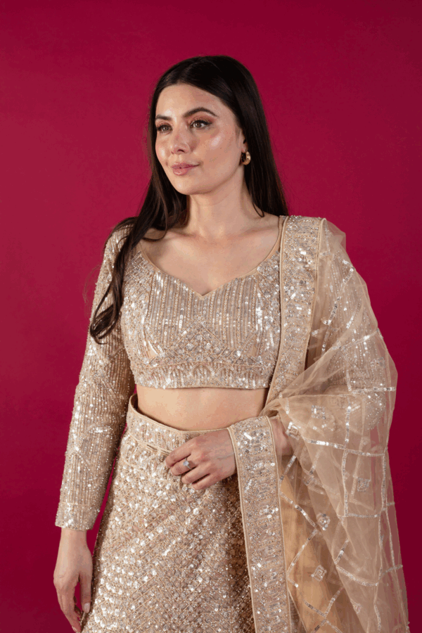 This beautiful 3 piece lengha choli features a short blouse with luxury thread work embroidery with sequence embellishments throughout with full length embroidered sleeves. Paired with a heavy embroidered flared lengha and the look is finished with a net embroidered dupatta.