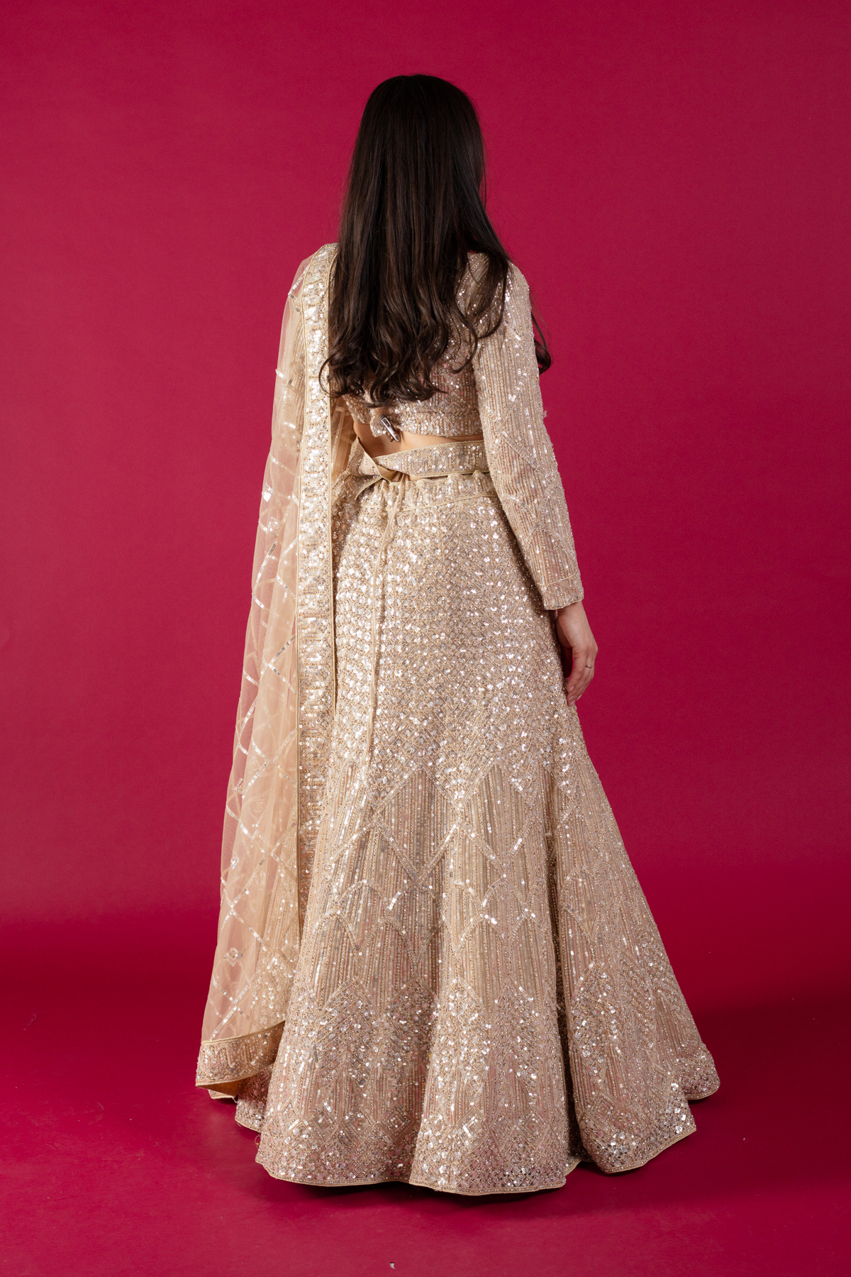 This beautiful 3 piece lengha choli features a short blouse with luxury thread work embroidery with sequence embellishments throughout with full length embroidered sleeves. Paired with a heavy embroidered flared lengha and the look is finished with a net embroidered dupatta.