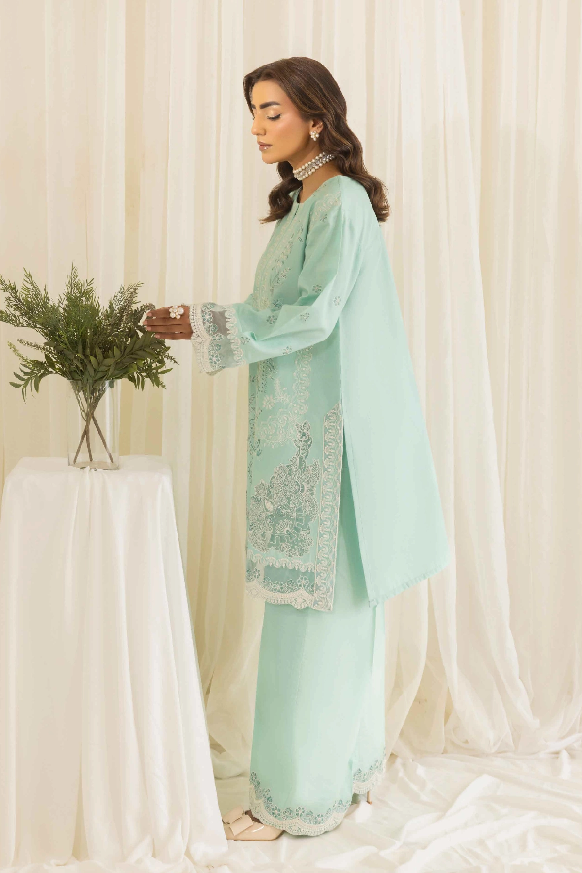 This elegant 2 piece coord set is designed for timeless style and comfort. The straight shirt, crafted from breathable lawn fabric, is beautifully adorned with intricate threadwork that adds a touch of sophistication and artistry. The look is further elevated with organza embroidered cuffs, bringing a refined and graceful finish. Paired with matching lawn plazo featuring coordinated detailing, the set creates a graceful silhouette that’s perfect for both casual wear and semi-formal occasions. A versatile wardrobe addition that blends elegance with ease of wear.