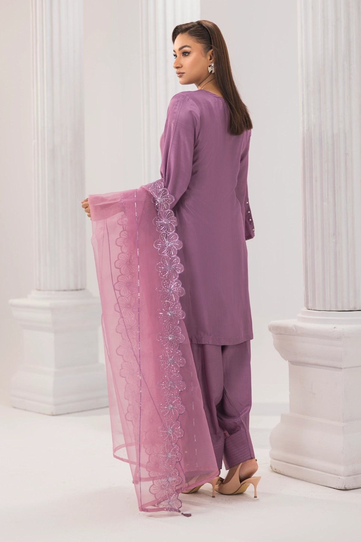 This beautiful 3 piece suit is made from luxurious silk fabric, featuring a straight kameez with elegant embroidery for a stylish yet traditional look. It comes with a matching farshi shalwar, adding a graceful and classic touch to the outfit. The set is completed with a lightweight organza dupatta, decorated with gold sequin work for a hint of sparkle. Perfect for festive occasions and Eid wear.