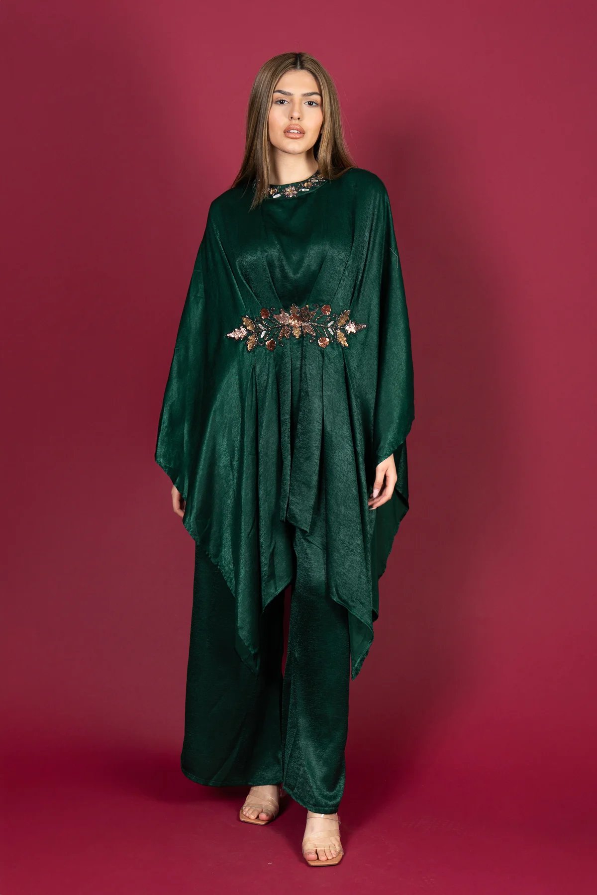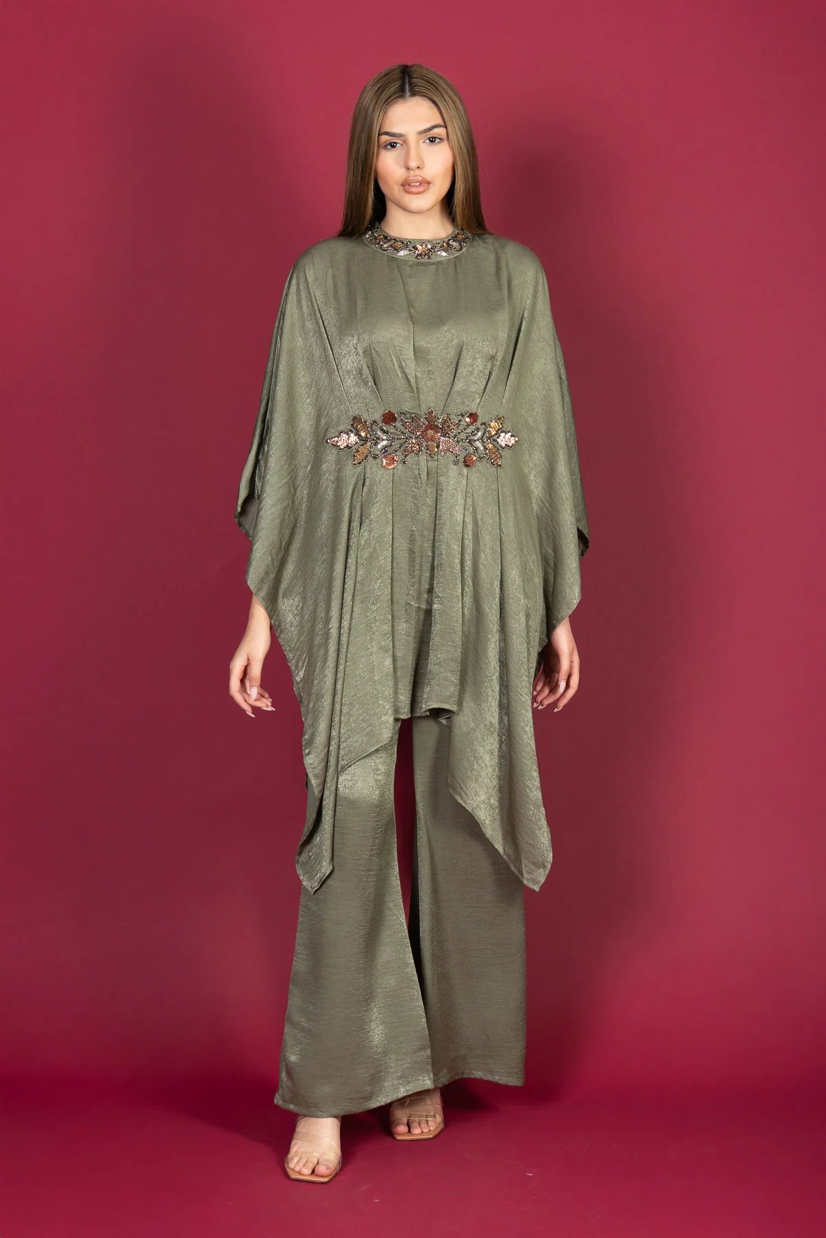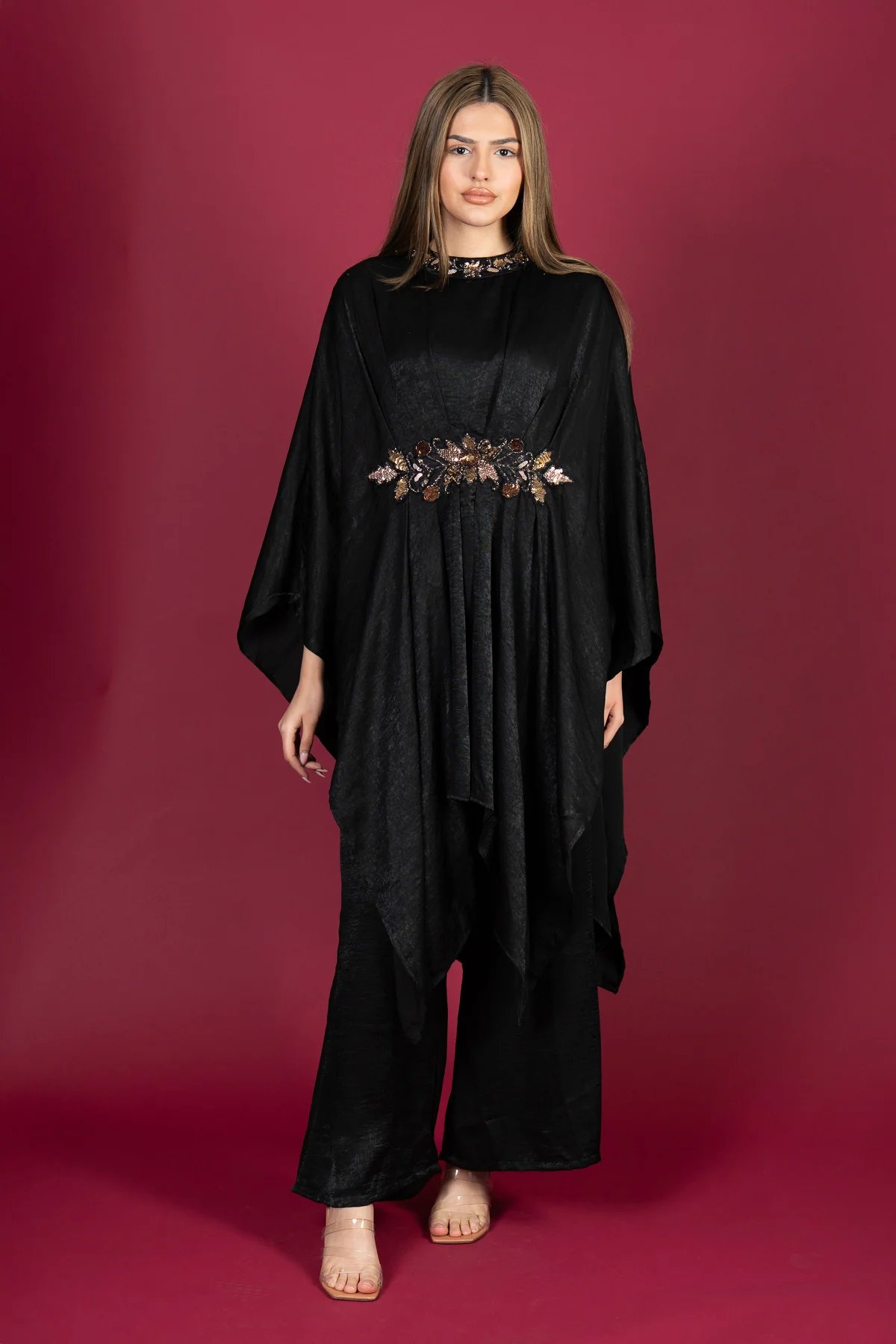 This beautiful 2 piece kaftan suit is crafted from luxurious crepe fabric, offering a graceful and modest silhouette. The kaftan features intricate embroidery adorning the neckline and centre, adding a touch of elegance to the design. Paired with plain plazo trousers, this outfit is perfect for effortless style and comfort. Ideal for Eid celebrations and special occasions.