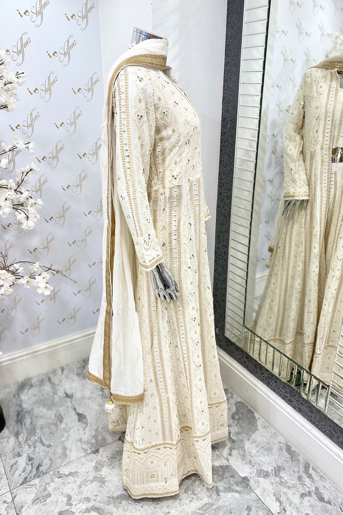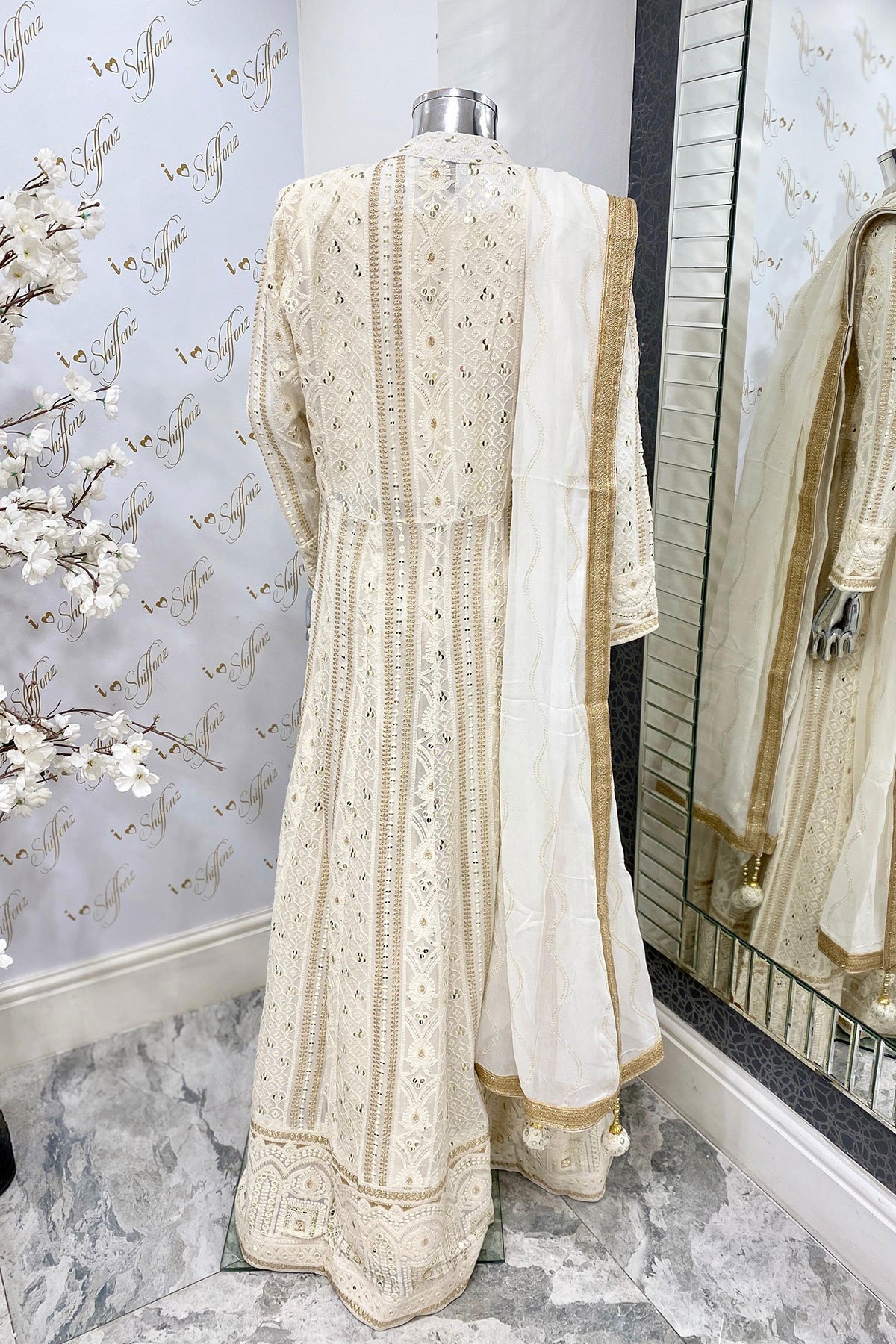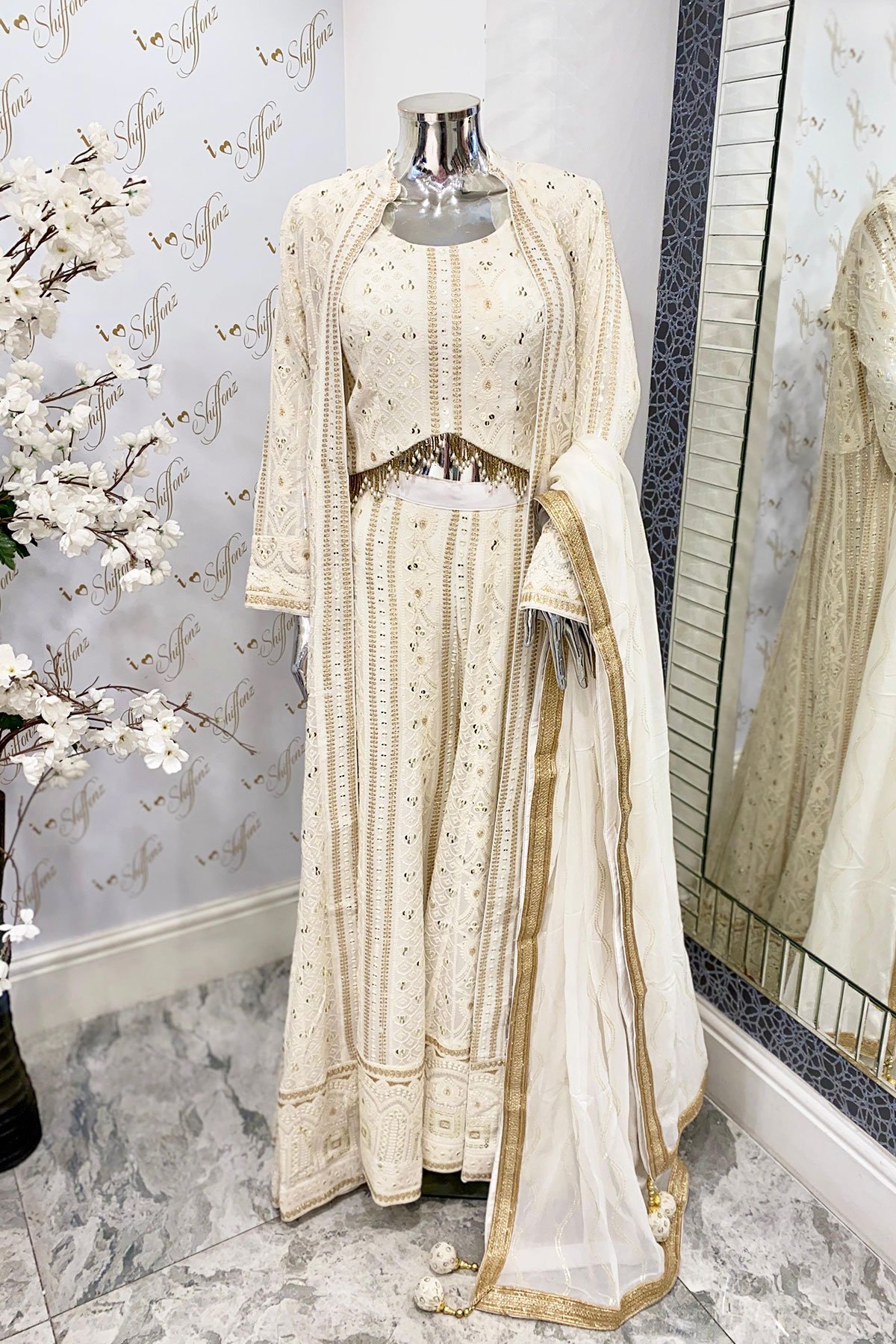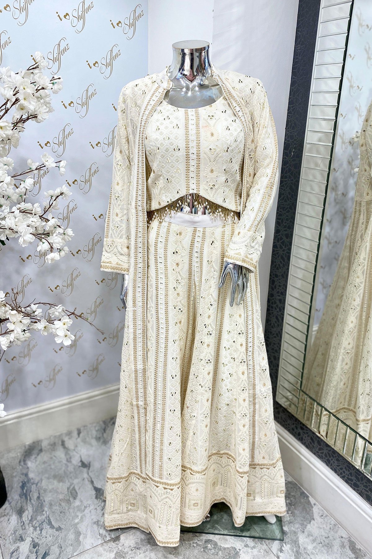 This beautiful 3 piece Shiffonz indo western chikan kari suit features a short sleeveless embroidered blouse with luxury dangling beads on the border. It comes with a chikan kari embroidered sharara and a long embroidered jacket. The look is finished with a chiffon embroidered dupatta.