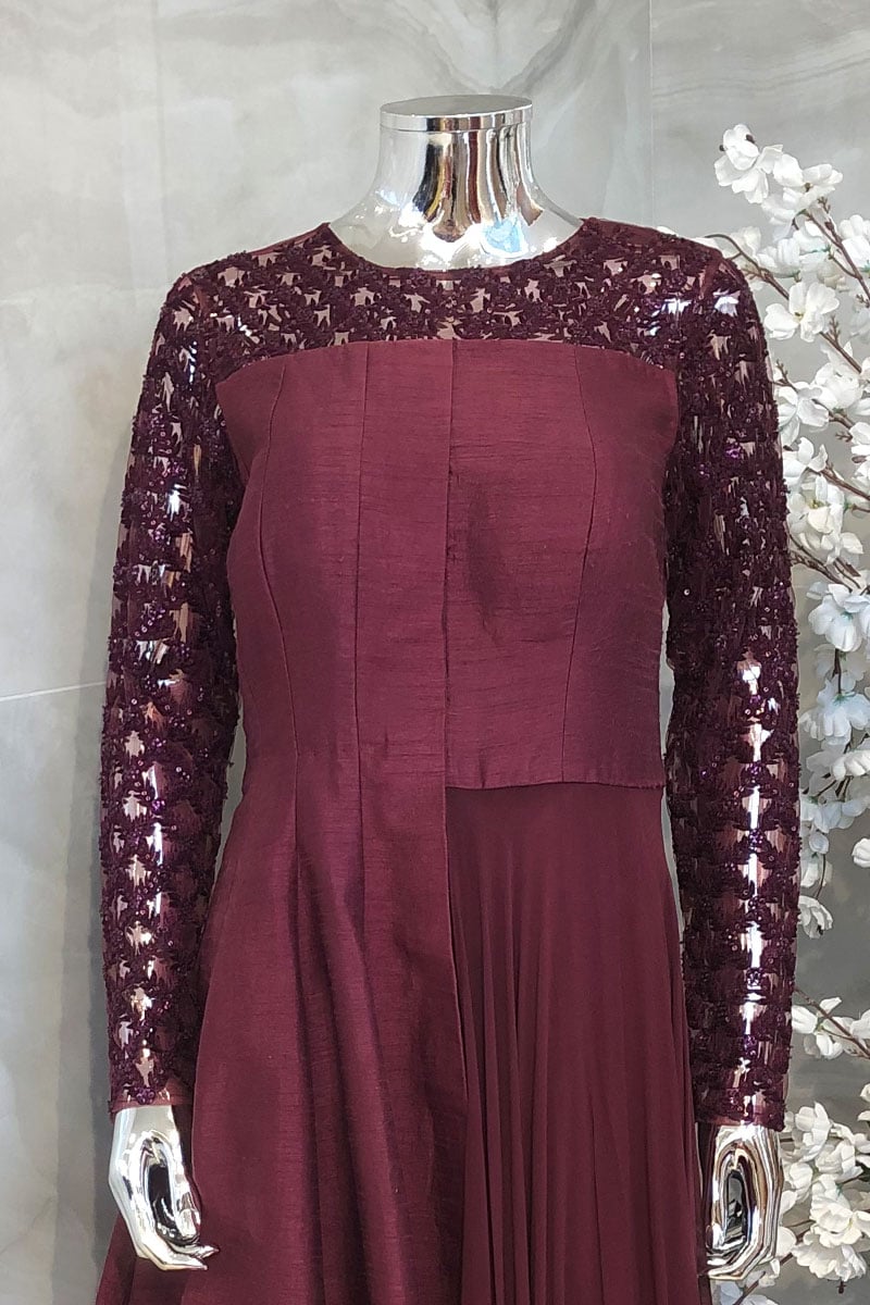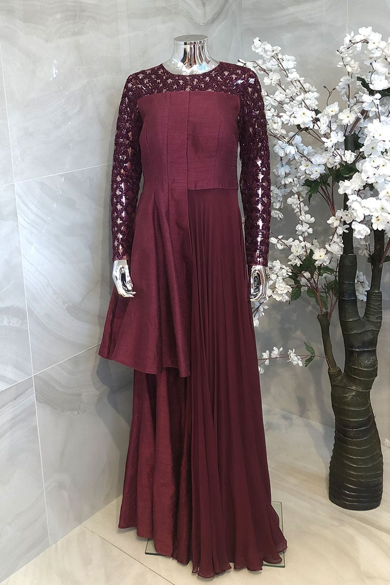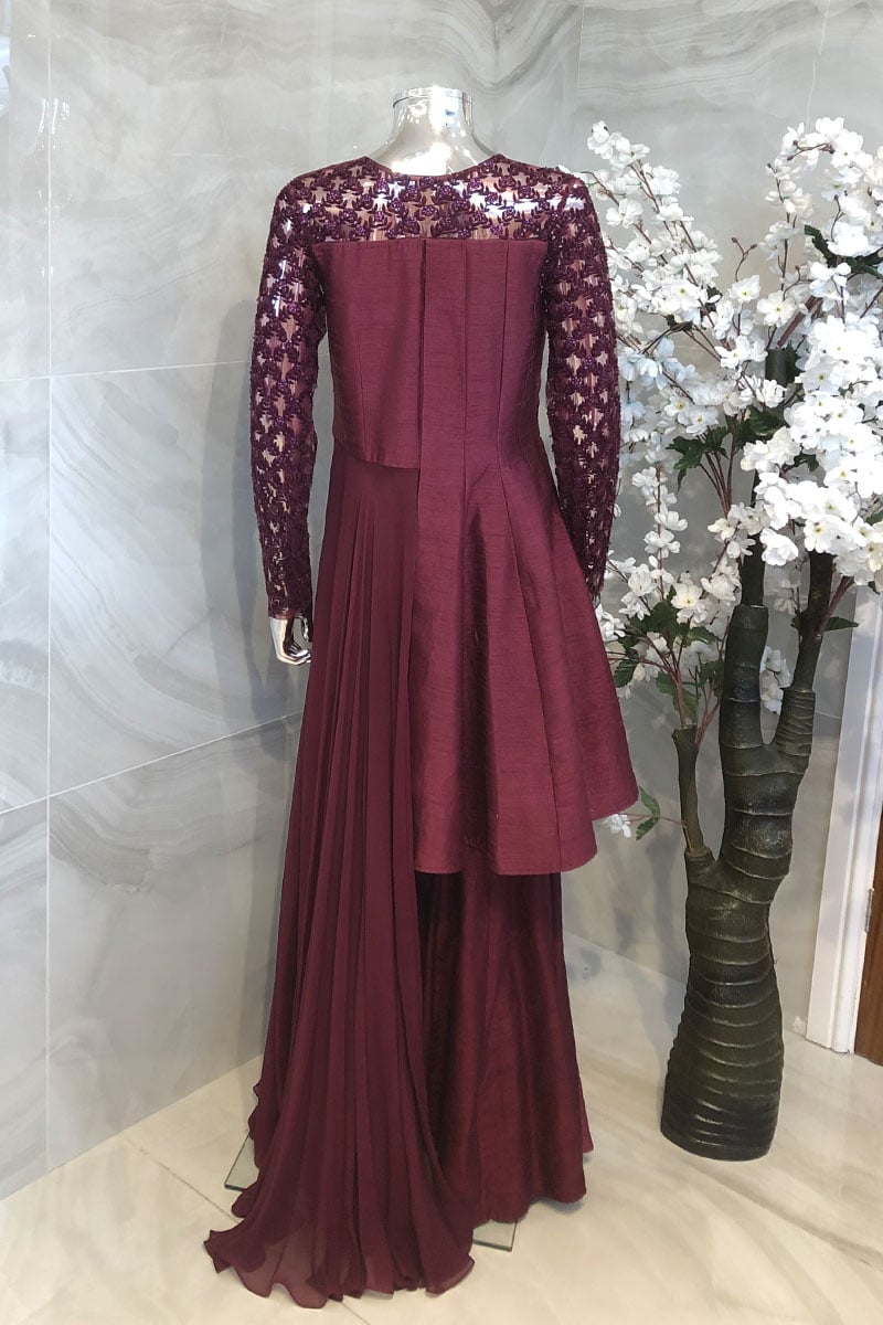 This beautiful 2 piece Shiffonz indo western dress features a peplum dress with crochet lace embroidered neckline and along with full length sleeves, finished with one sided long chiffon gown and the look is finished with a raw silk plazo.