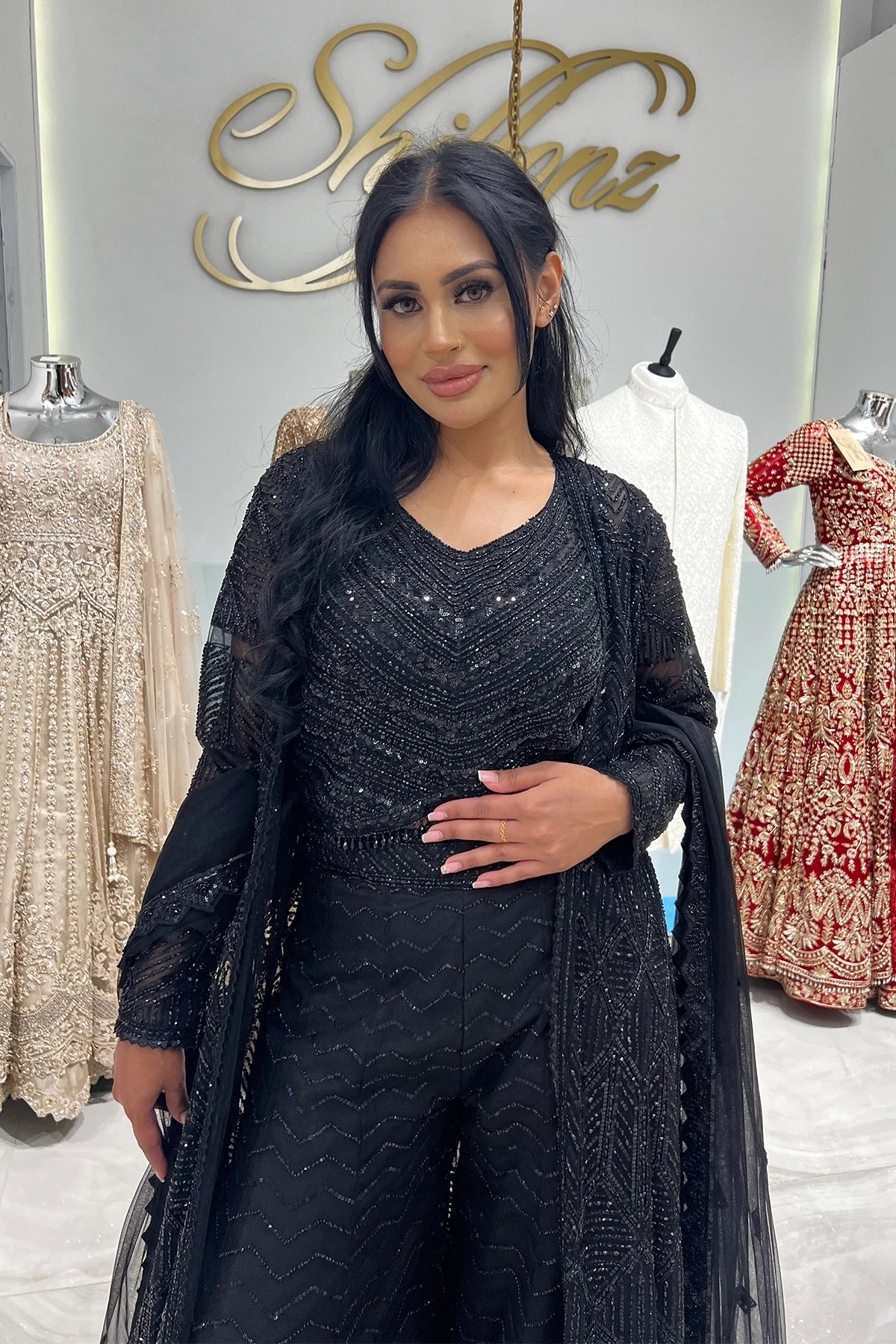 This beautiful 4 piece suit features a short shop with luxury thread work and sequence embroidery throughout with bead embellishments on the waist. Paired with a net embroidered plazo trousers along with a long open style net embroidered jacket with full length embroidered sleevs. The look is finished with a net embroidered dupatta.