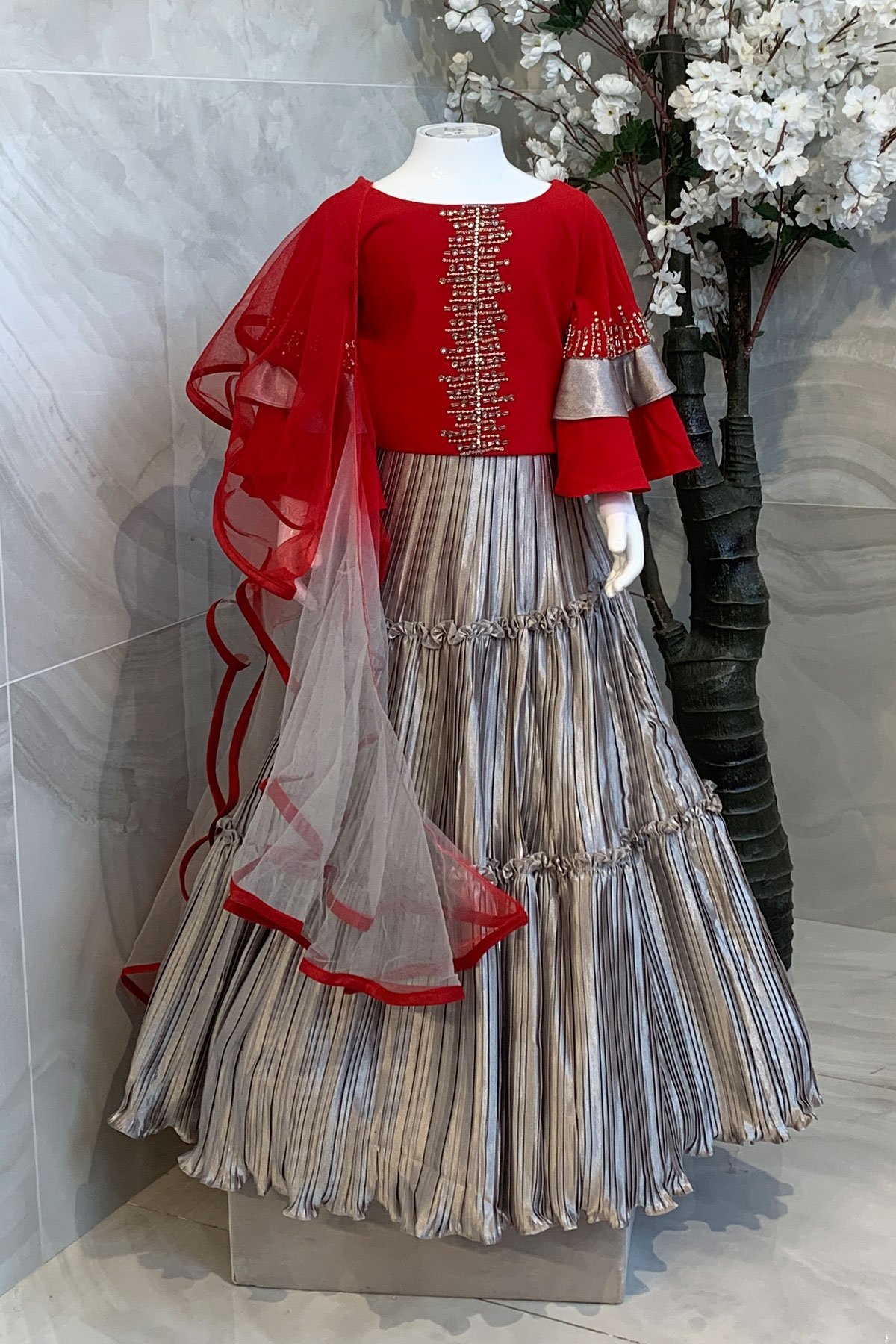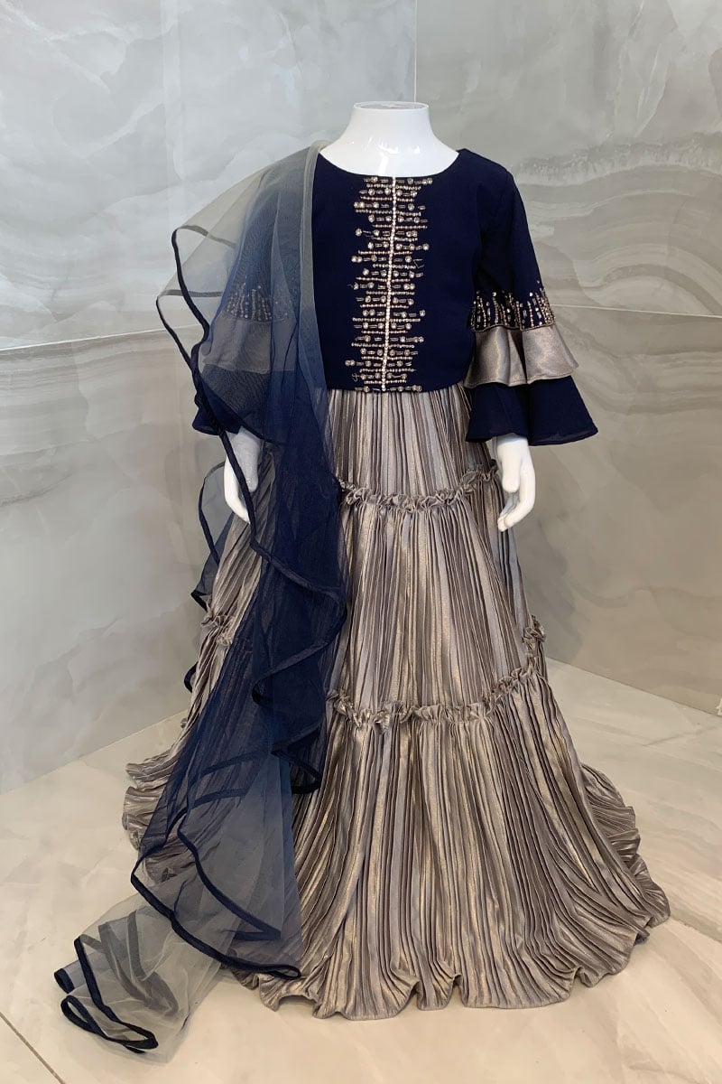 This beautiful kids lengha choli features a short top with bead embellishments with full length sleeves finished with double layered bell style cuffs. It comes with a pleated lengha and the look is finished with a dupatta