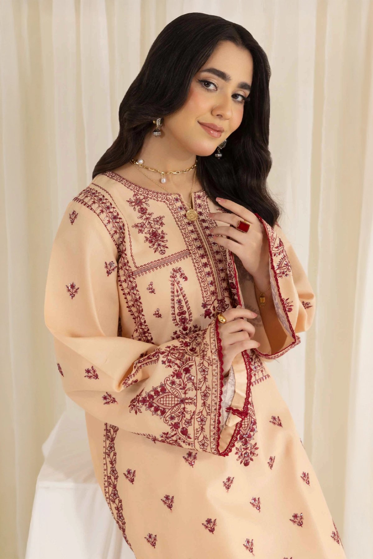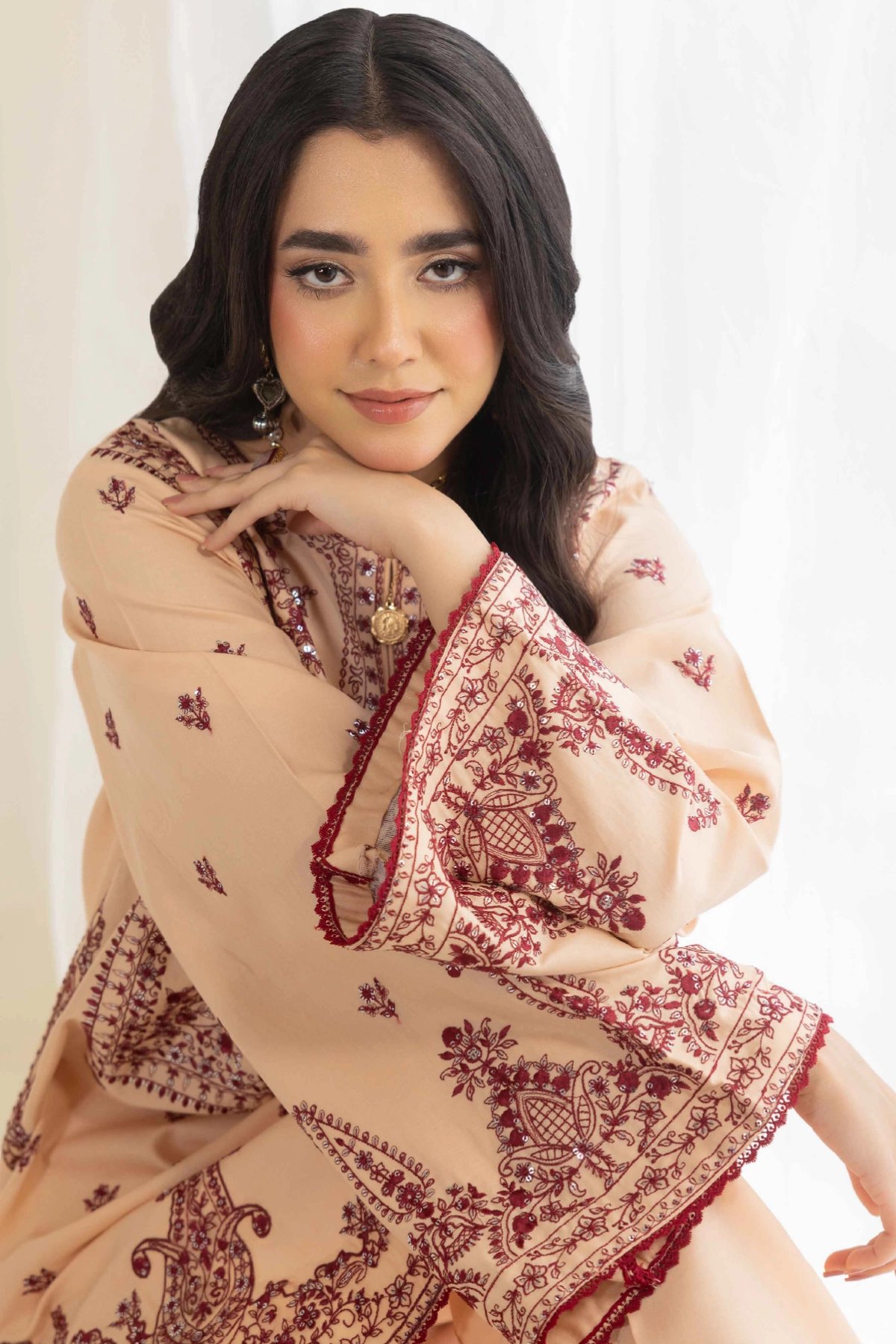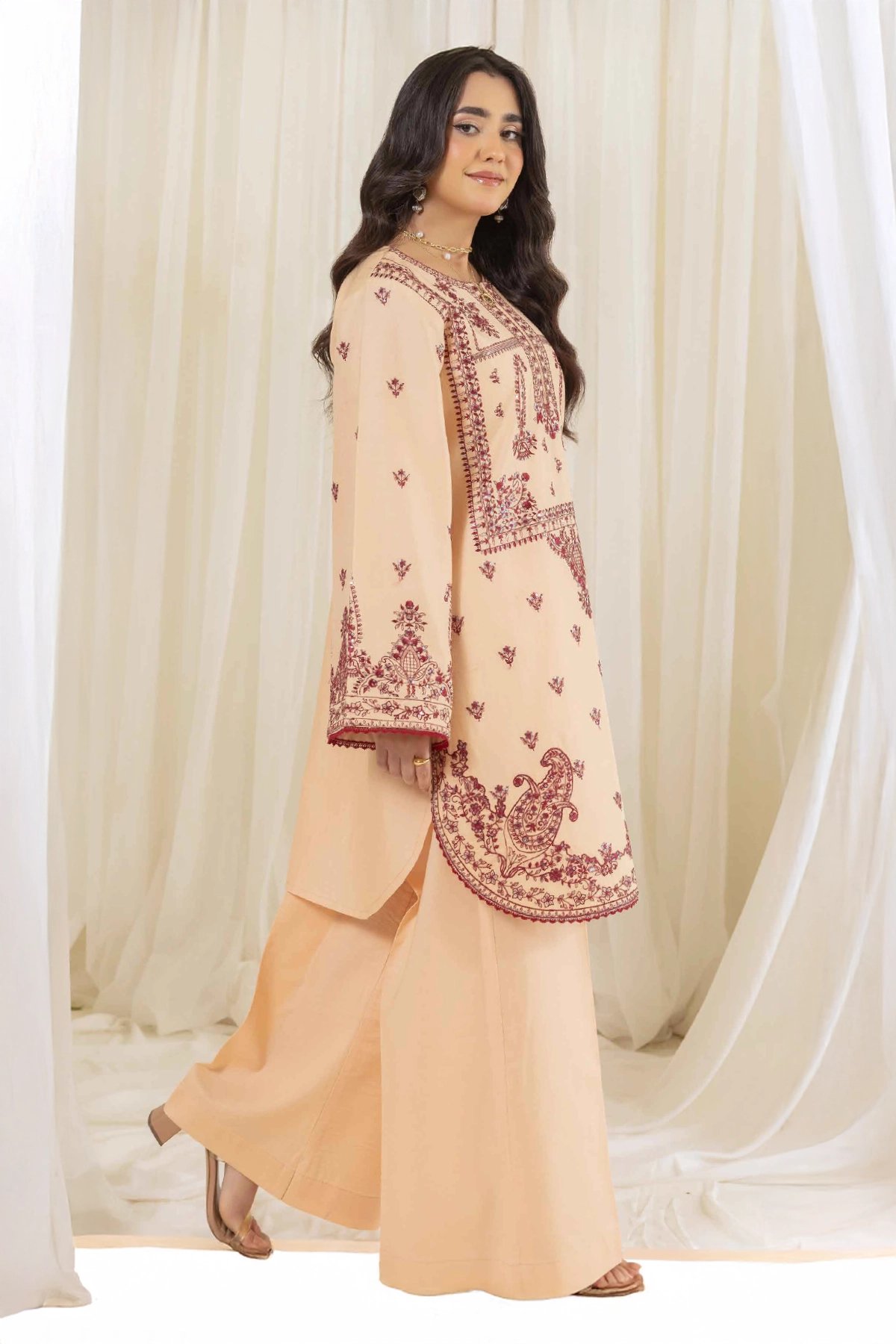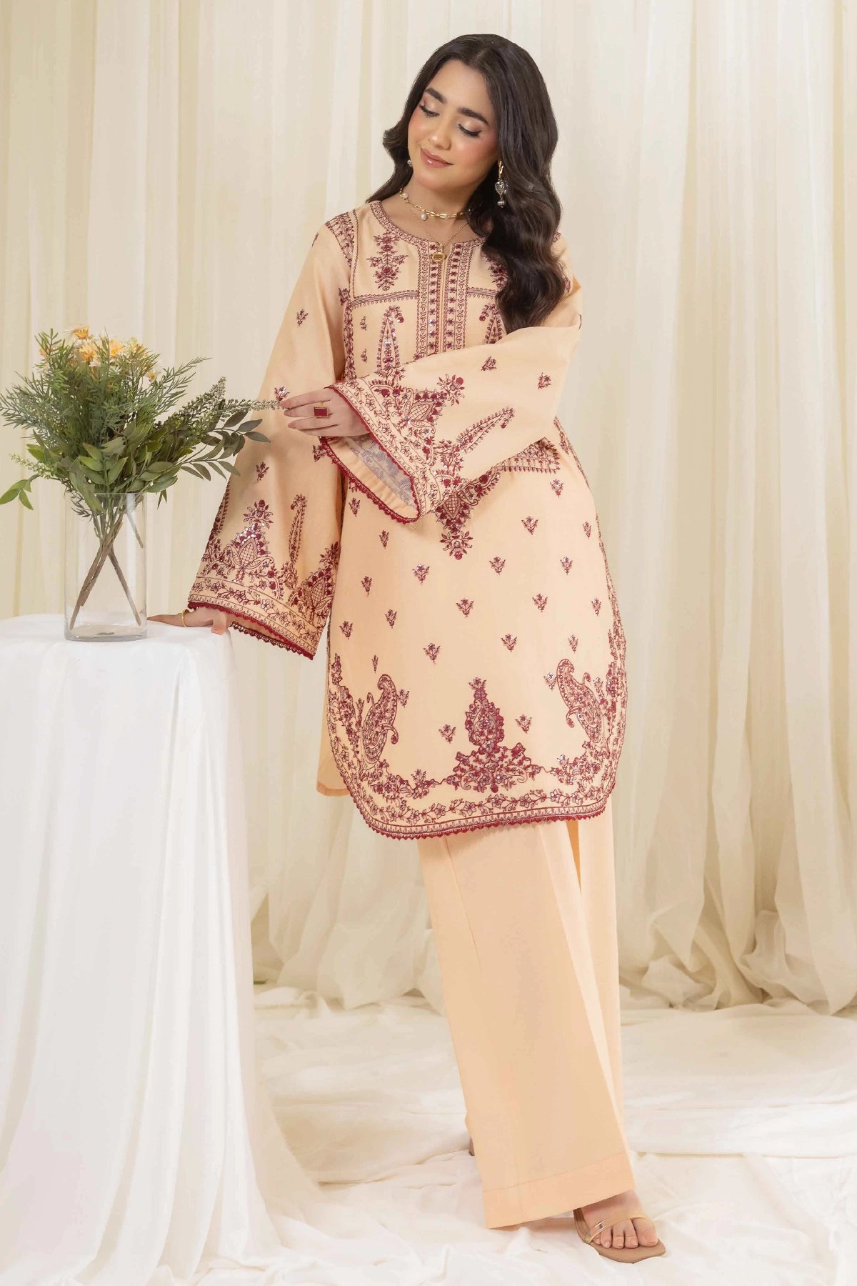This lavish 2 piece coord set is designed for timeless style and comfort. The straight shirt, crafted from breathable lawn fabric, is beautifully adorned with intricate threadwork that adds a touch of sophistication and artistry. The look is further elevated with organza embroidered cuffs, bringing a refined and graceful finish. Paired with matching lawn plazo featuring coordinated detailing, the set creates a graceful silhouette that’s perfect for both casual wear and semi-formal occasions. A versatile wardrobe addition that blends elegance with ease of wear.