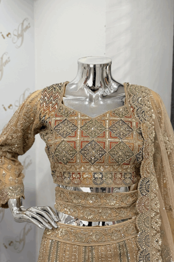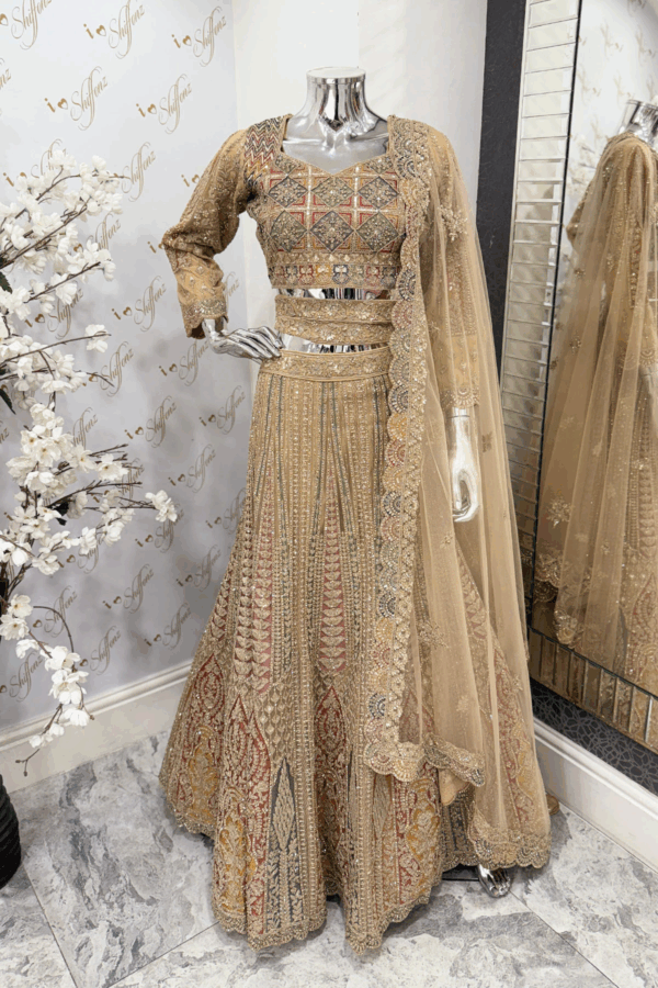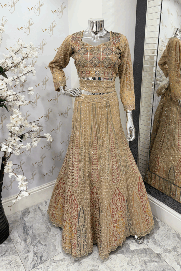This beautiful 3 piece lengha choli features a short blouse with luxury multi coloured thread work embroidery patterns with sequence embellishments throughout the front, back and full length embroidered sleeves. Paired with a heavy embroidered lengha with an elegant flare and the look is finished with an embroidered net dupatta. An additional tassel is also included to be attached on the side.
