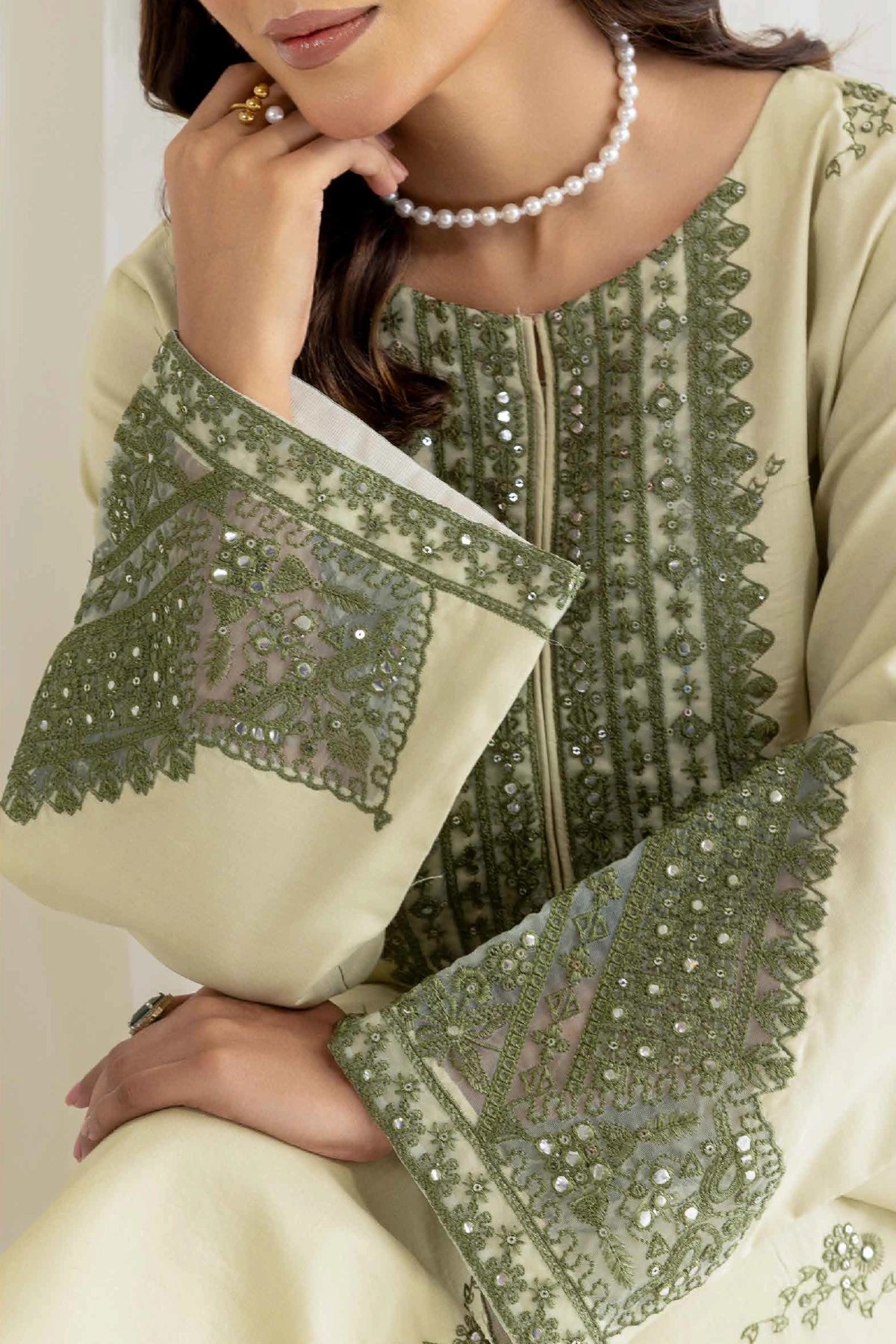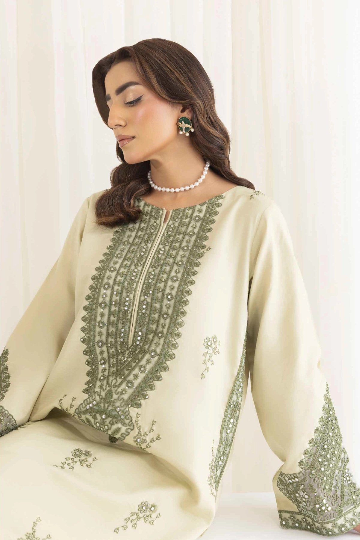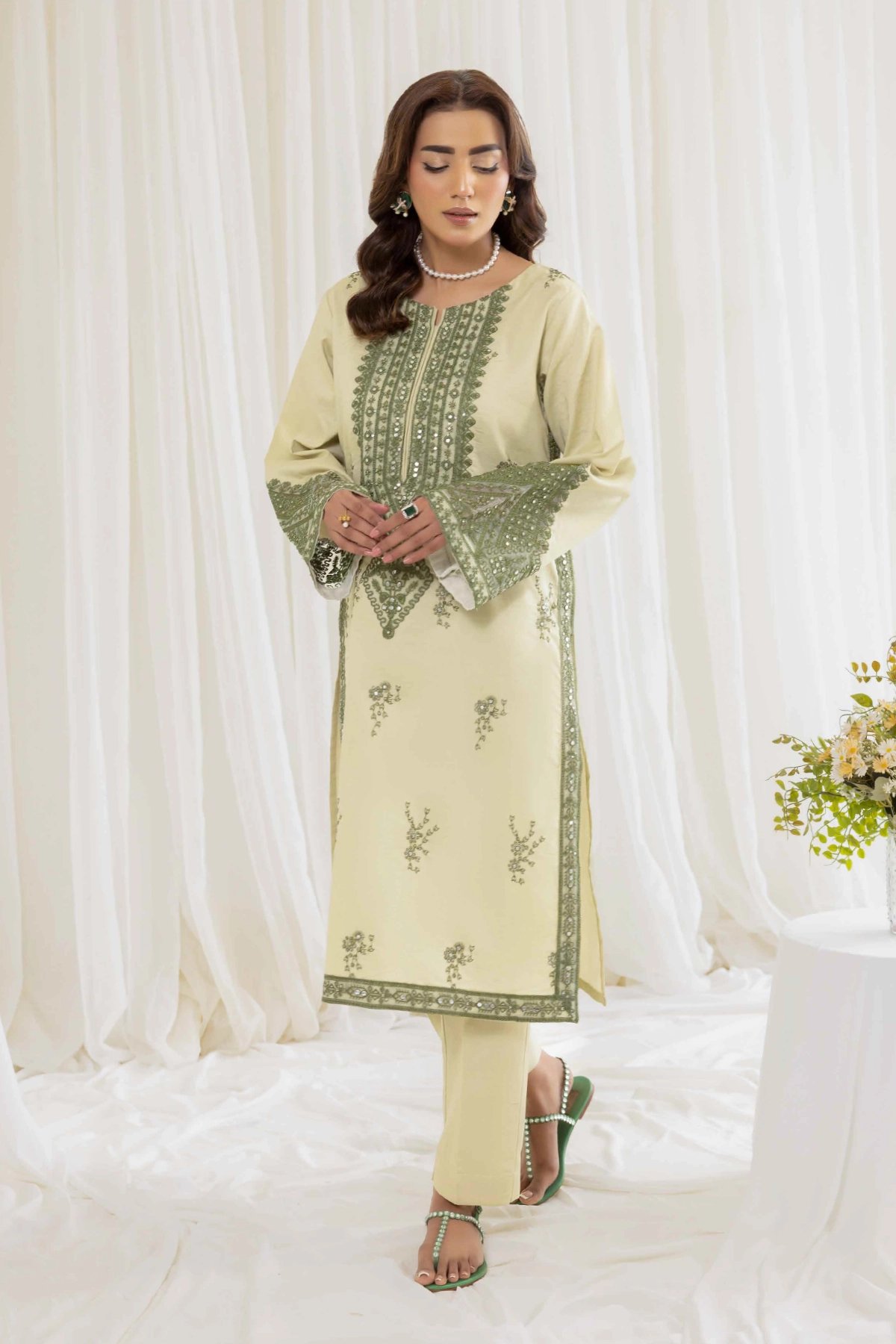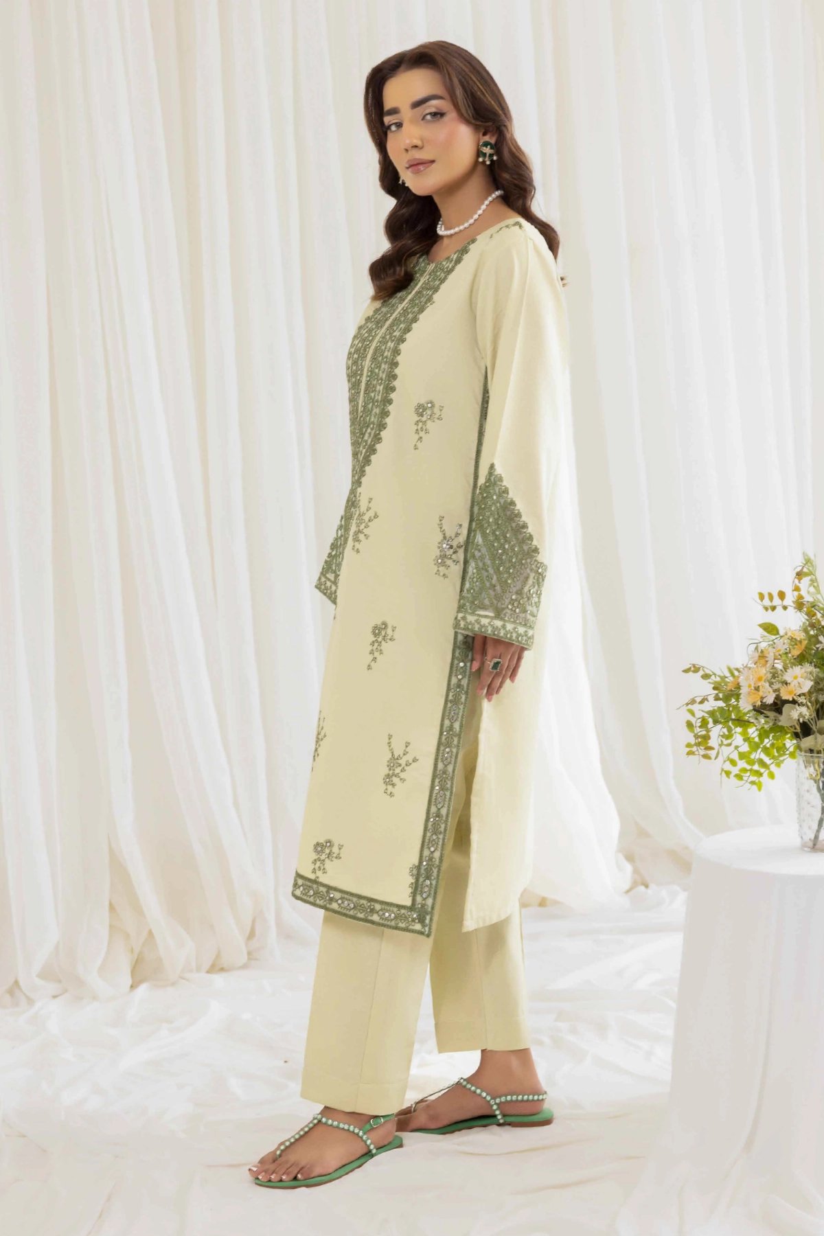 This luxury  2 piece coord set is designed for timeless style and comfort. The straight shirt, crafted from breathable lawn fabric, is beautifully adorned with intricate threadwork that adds a touch of sophistication and artistry. The look is further elevated with organza embroidered cuffs, bringing a refined and graceful finish. Paired with matching lawn trousers featuring coordinated detailing, the set creates a graceful silhouette that’s perfect for both casual wear and semi-formal occasions. A versatile wardrobe addition that blends elegance with ease of wear.