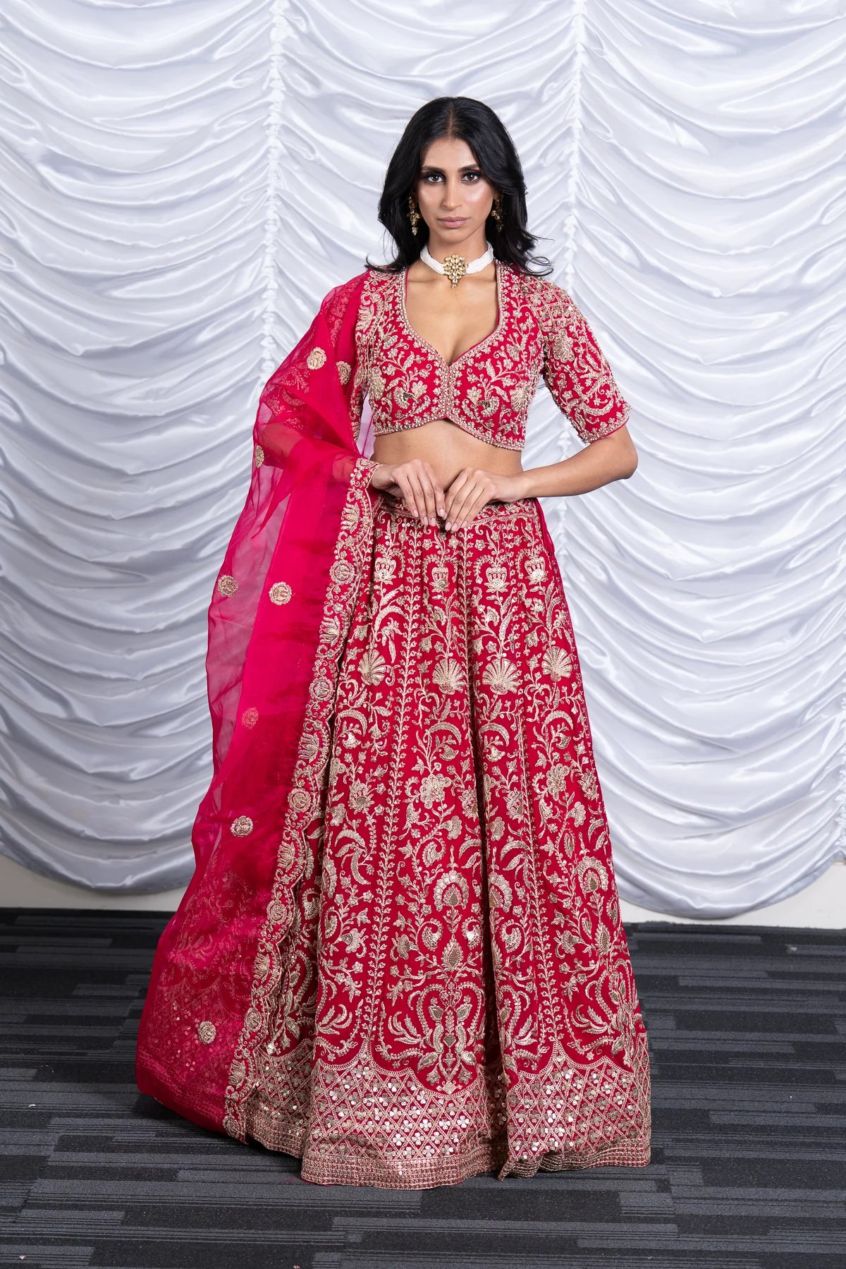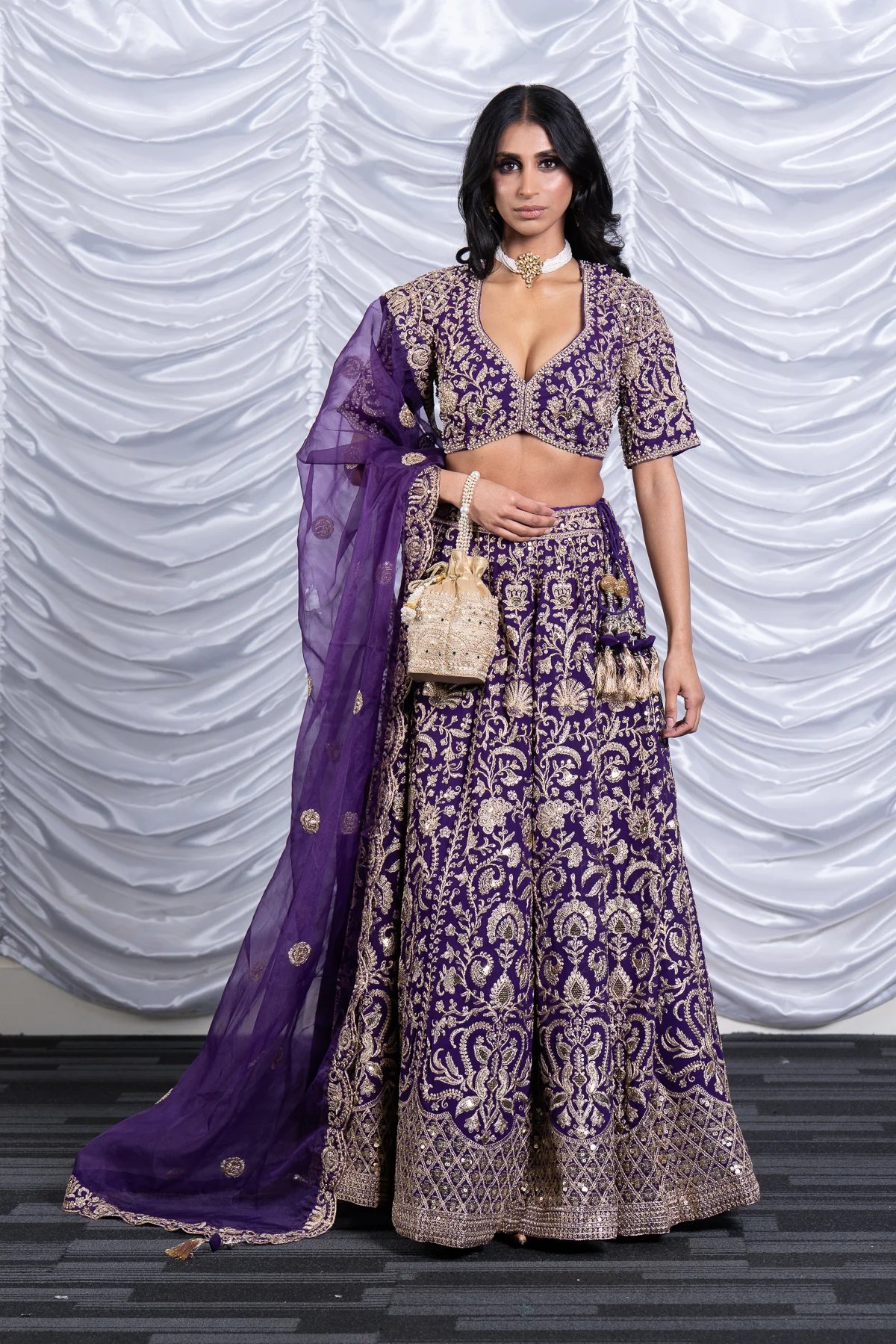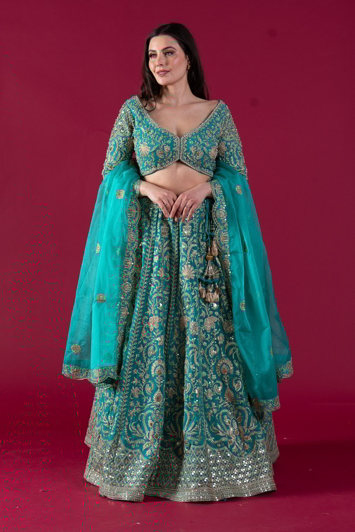 This beautiful 3 piece lengha choli features a short v-neckline blouse with luxury thread work embroidery with scattered pearls and sequence embellishments throughout the front, back and full length embroidered sleeves. Paired with a luxury embroidered lengha with an elegant flare and the look is finished with thread work embroidered organza dupatta.