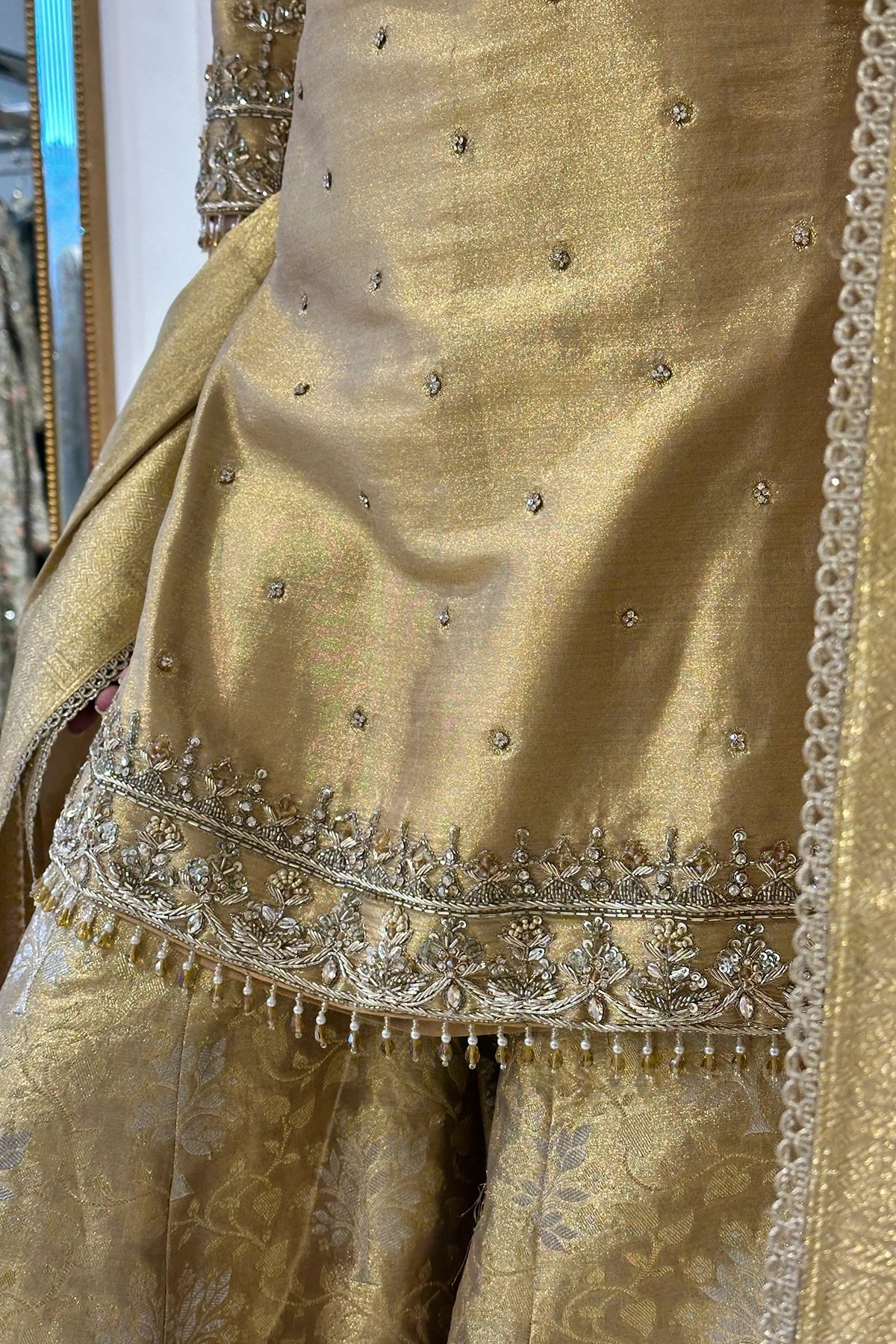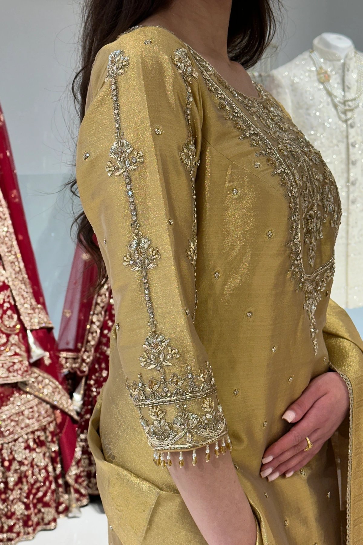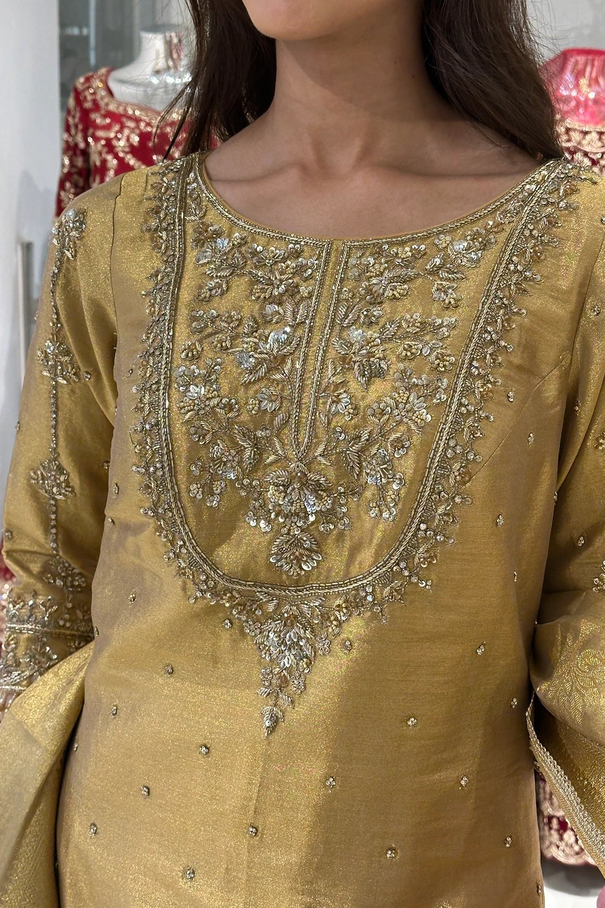 This beautiful 3 piece suit features a straight pure raw silk shirt with luxury embroidered neckline and border with dangling beads and full length luxury embroidered sleeves. Paired with a banarsi luxe sharara and the look is finished with a banarsi embroidered dupatta.