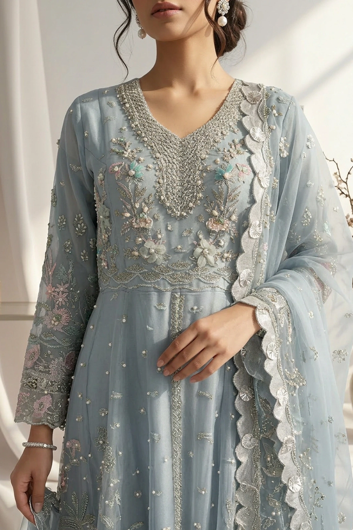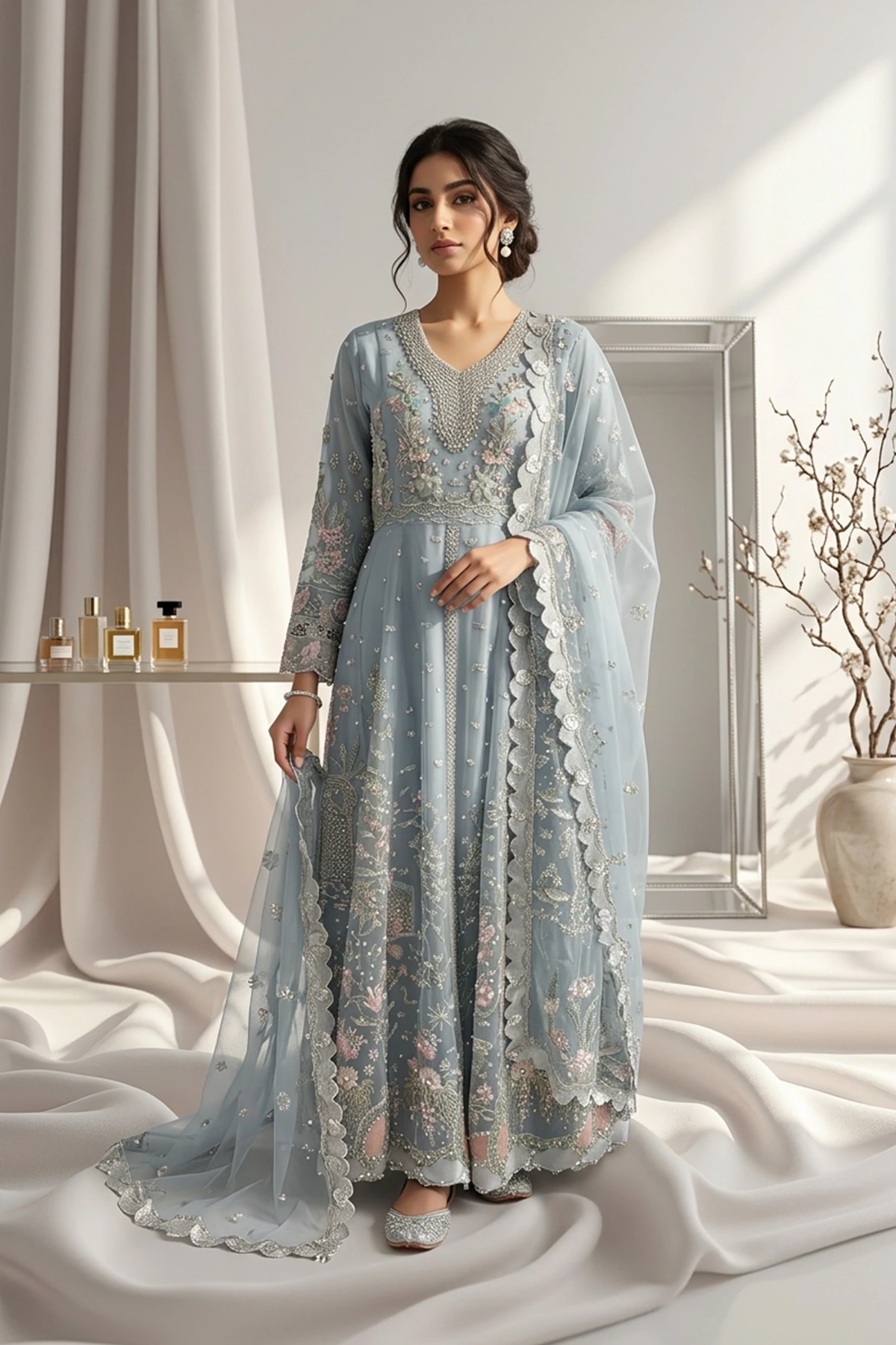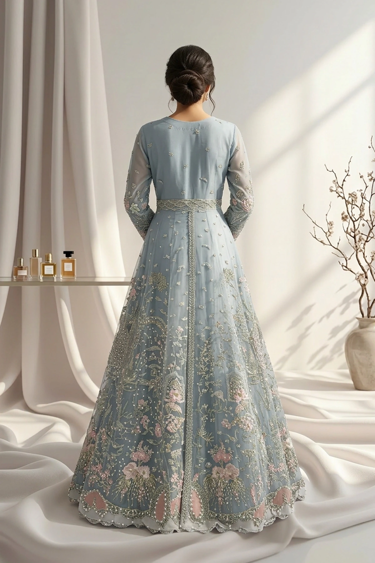 This beautifully crafted 3 piece gown with lehnga exudes refined elegance, featuring a flowing silhouette adorned with intricate embroidery and delicate embellishments that highlight the neckline, bodice, and borders with graceful detail. The gown’s soft, sheer overlay adds movement and dimension, while the matching crepe lehnga enhances the ensemble with its structured flare and coordinated embellishment on the border. The look is finished with a finely embroidered organza dupatta.