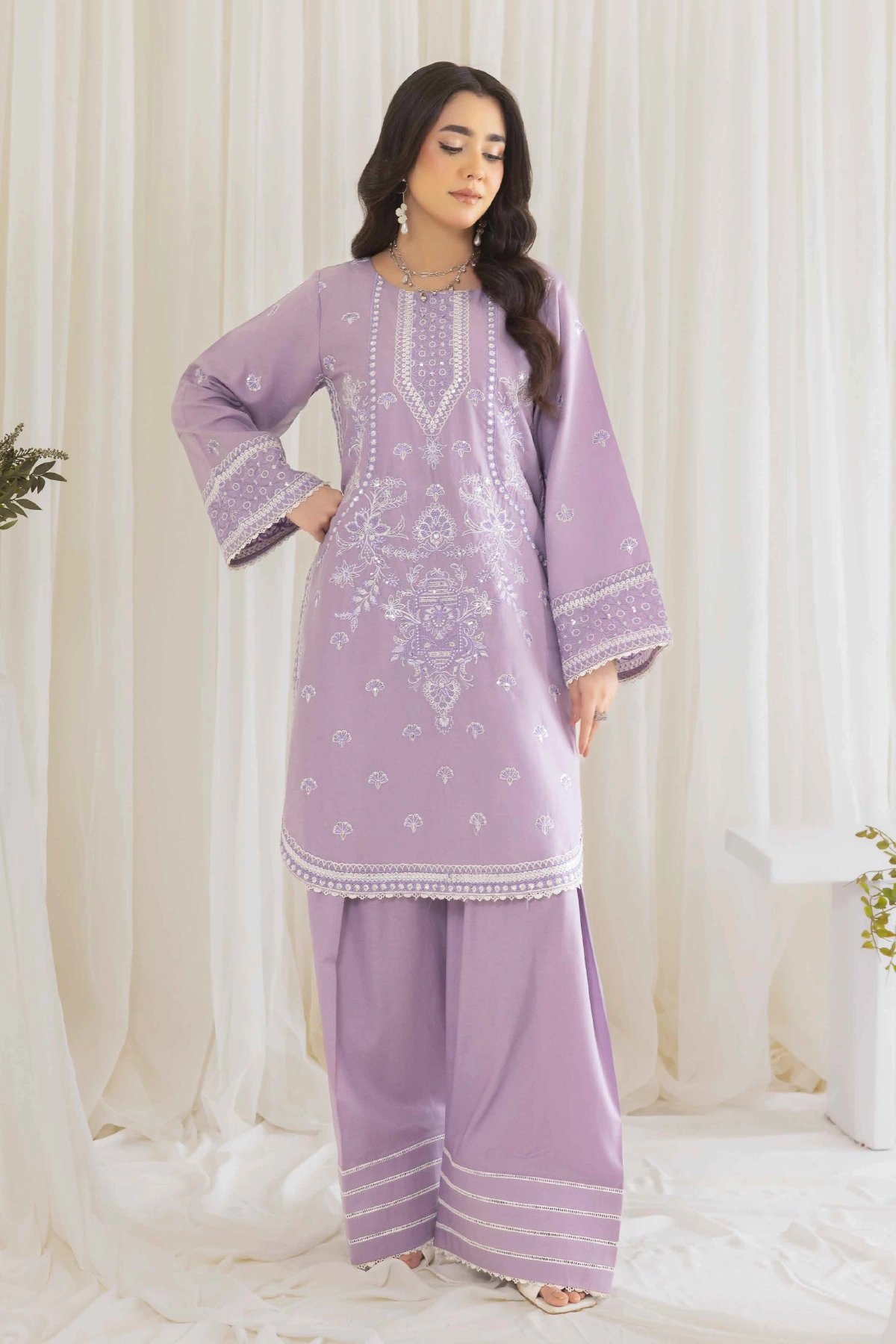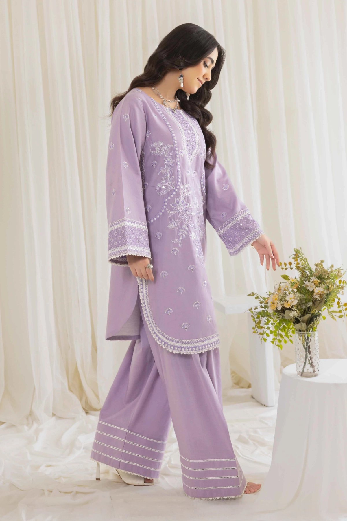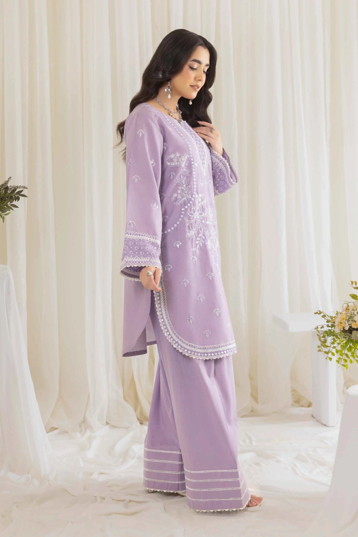 This elegant 2 piece coord set is designed for timeless style and comfort. The straight shirt, crafted from breathable lawn fabric, is beautifully adorned with intricate threadwork that adds a touch of sophistication and artistry. The look is further elevated with organza embroidered cuffs, bringing a refined and graceful finish. Paired with matching lawn plazo featuring coordinated detailing, the set creates a graceful silhouette that’s perfect for both casual wear and semi-formal occasions. A versatile wardrobe addition that blends elegance with ease of wear.