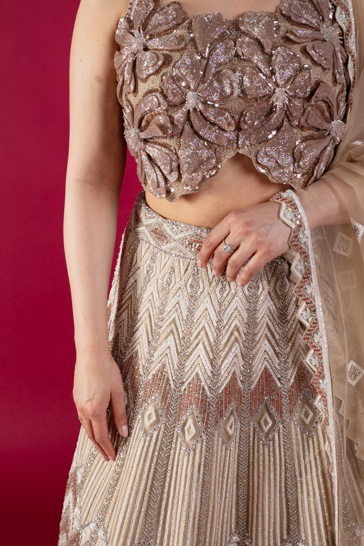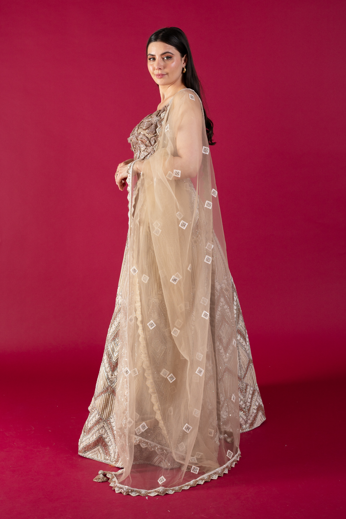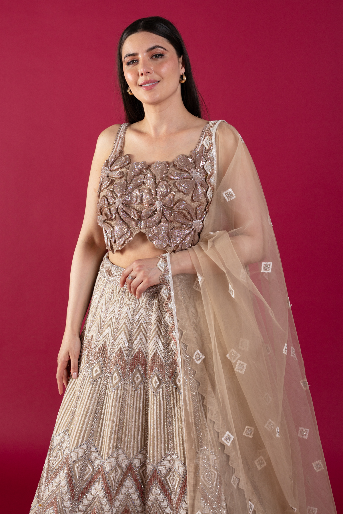 This beautiful 3 piece lengha choli features a short blouse with 3d floral shimmery embroidered patterns throughout. Paired with a heavy flared embroidered lengha with motifs, beads and sequence and the look is finished with an embroidered net dupatta. Perfect for any festive and wedding collections.