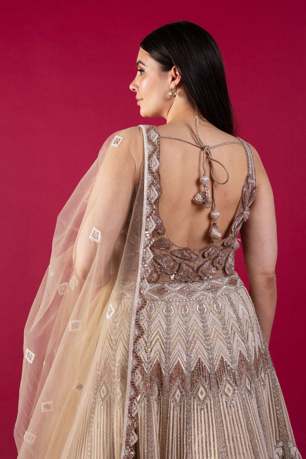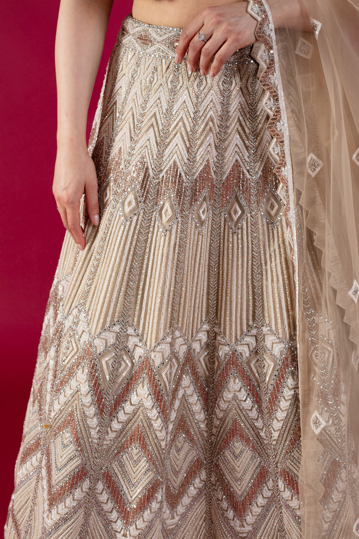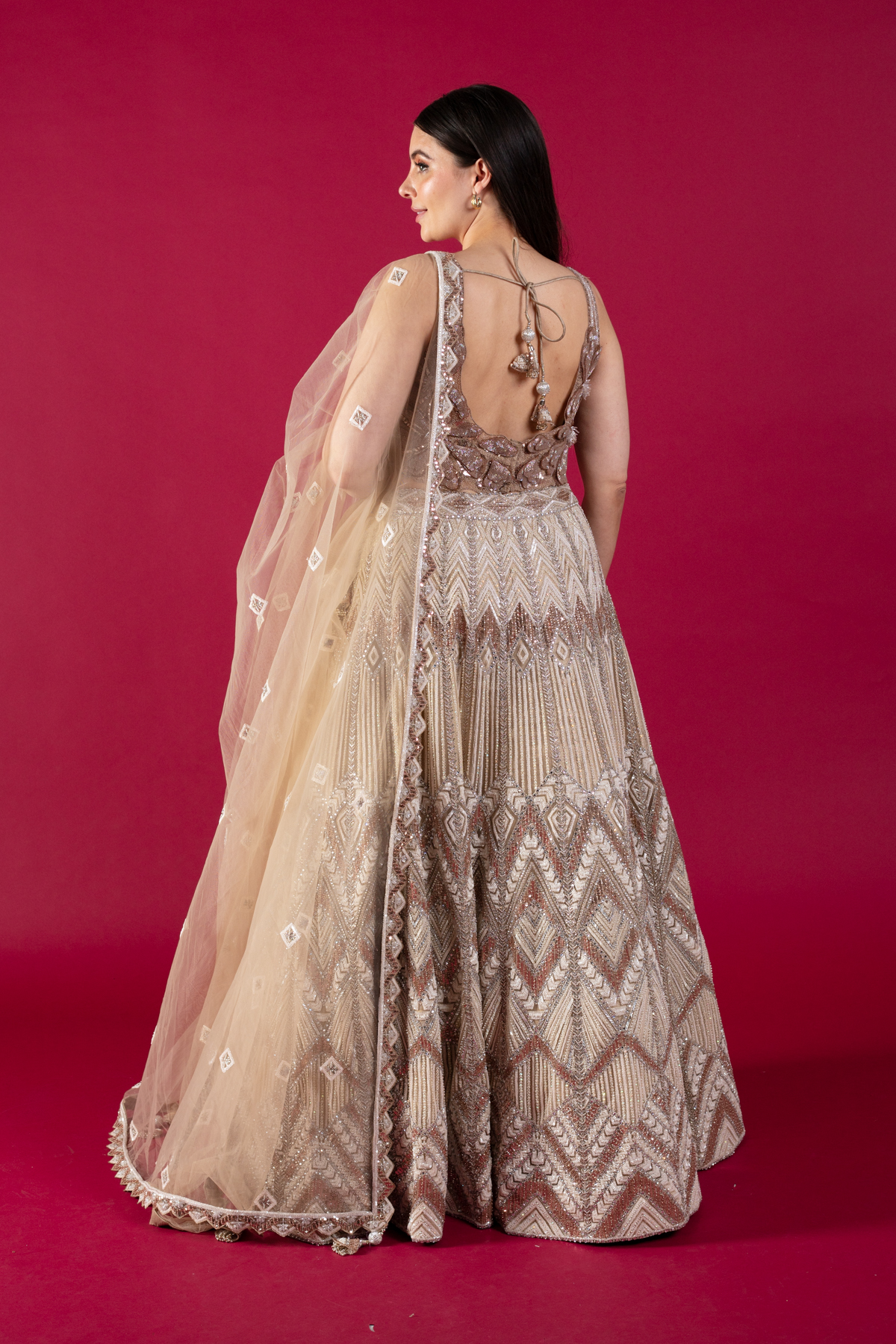 This beautiful 3 piece lengha choli features a short blouse with 3d floral shimmery embroidered patterns throughout. Paired with a heavy flared embroidered lengha with motifs, beads and sequence and the look is finished with an embroidered net dupatta. Perfect for any festive and wedding collections.