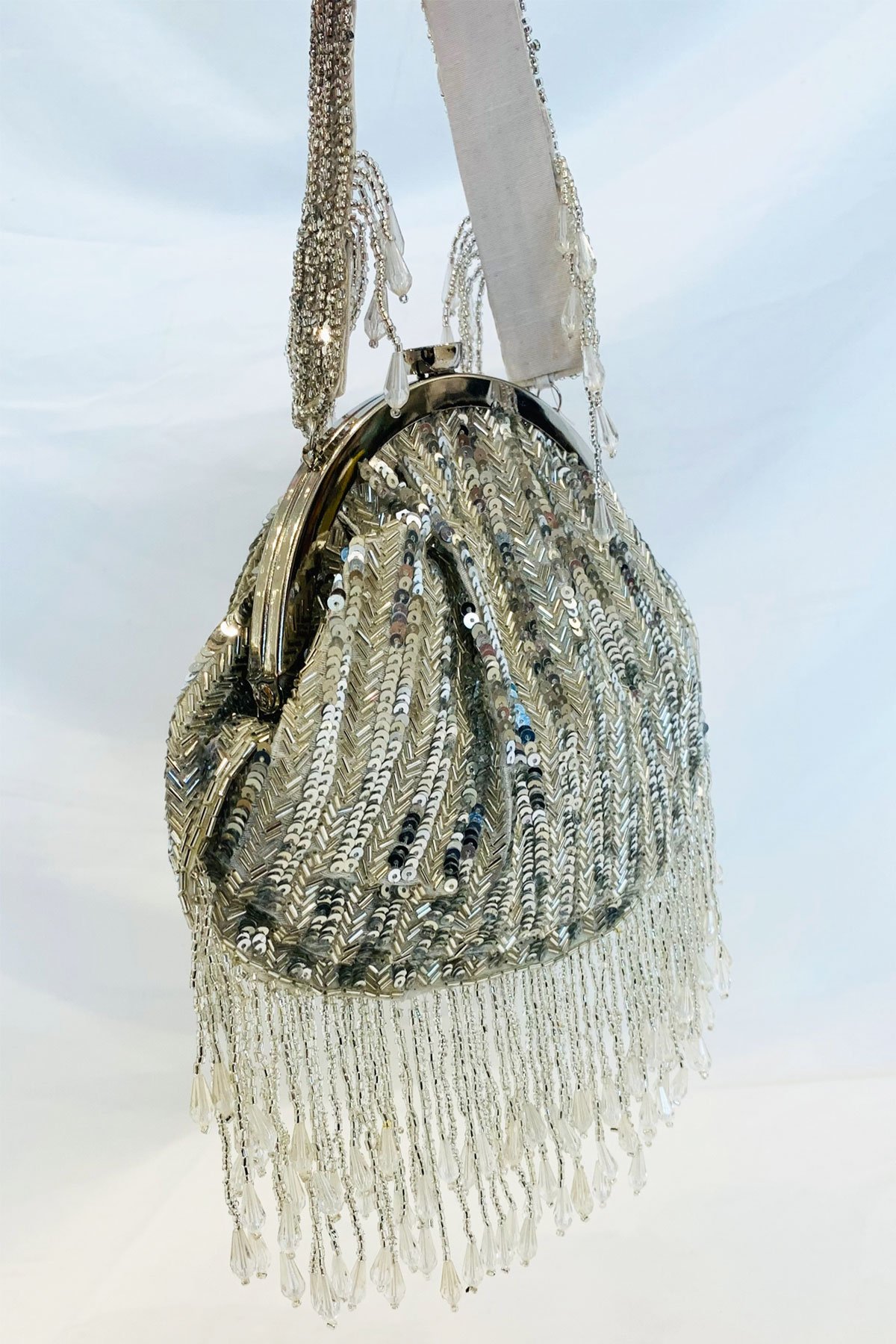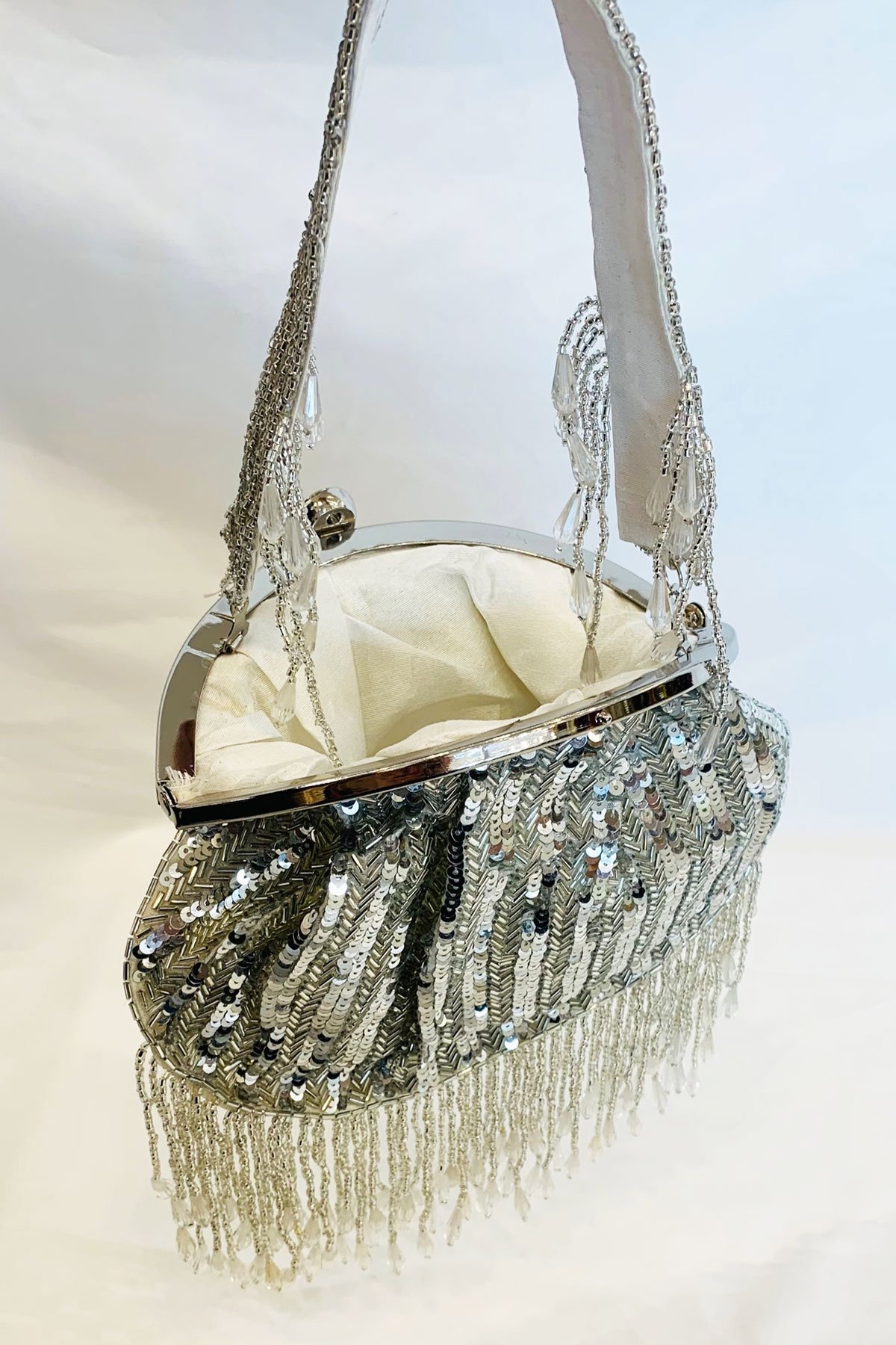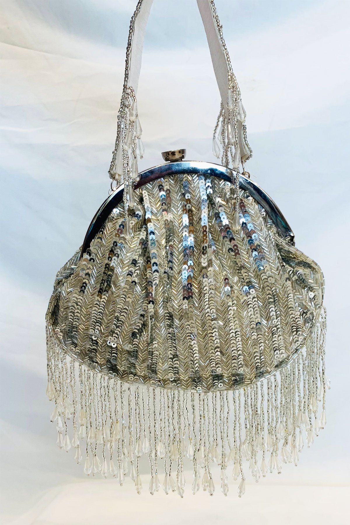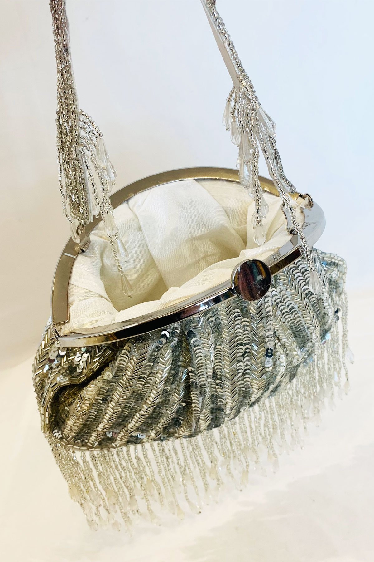 This luxurious silver coloured bag is offered in the clutch pattern and features an embroidered strap for convenient use. It is available in the perfect dimensions and is a beautiful illustration of high-level craftsmanship of silver sequence and bead embellishments, finished on dangling tassels which makes it look much more appealing, this exquisite clutch will give you a standout look in casual and party wear attires.