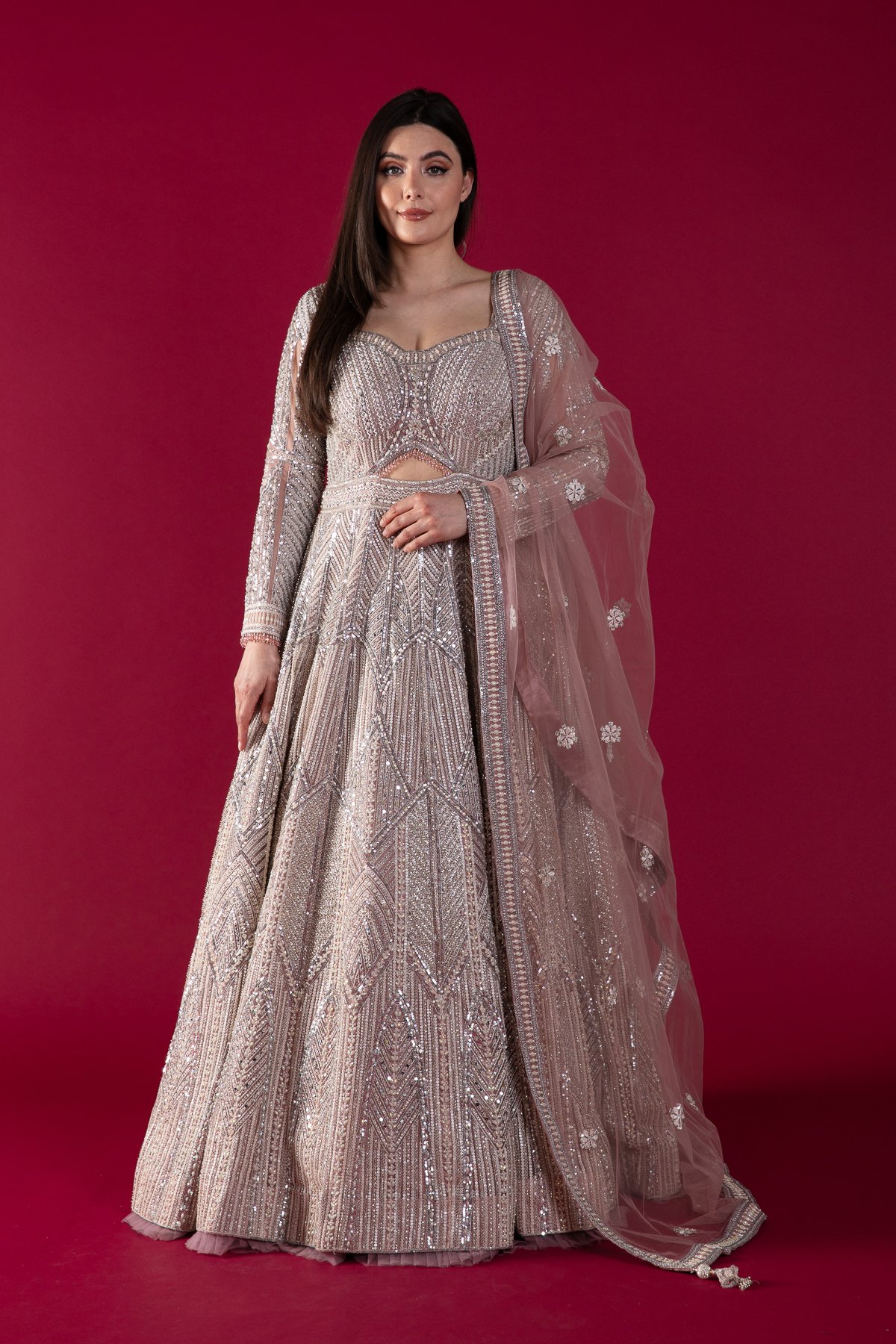 This beautiful net gown features luxury sequence and beaded embroidery throughout the front and back along with full length embroidered sleeves. The look is finished with a net embroidered dupatta.