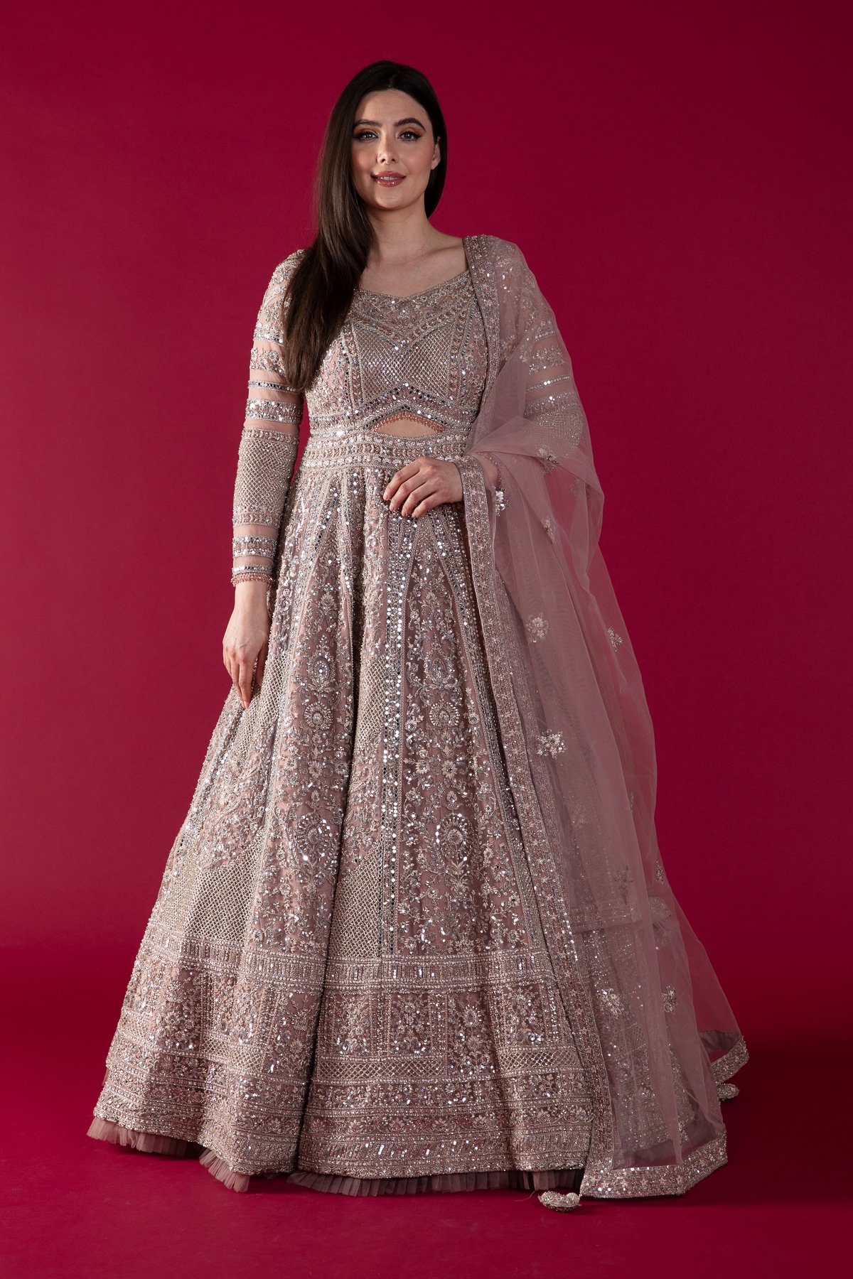 This beautiful shiffonz gown features luxury thread work embroidery along with sequence and mirror embellishments throughout the front and front, finished with a ruffled border and a key hole on the waist with dangling beads. The look is finished with full length embroidered sleeves and a net embroidered dupatta.