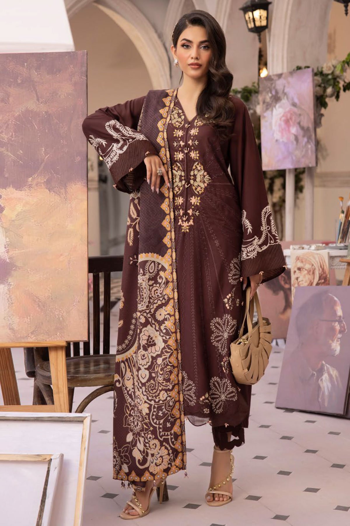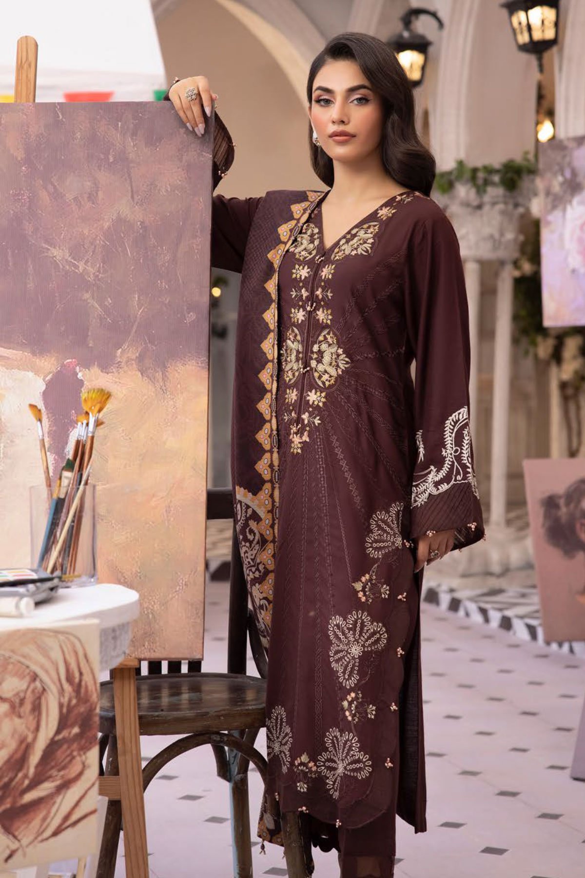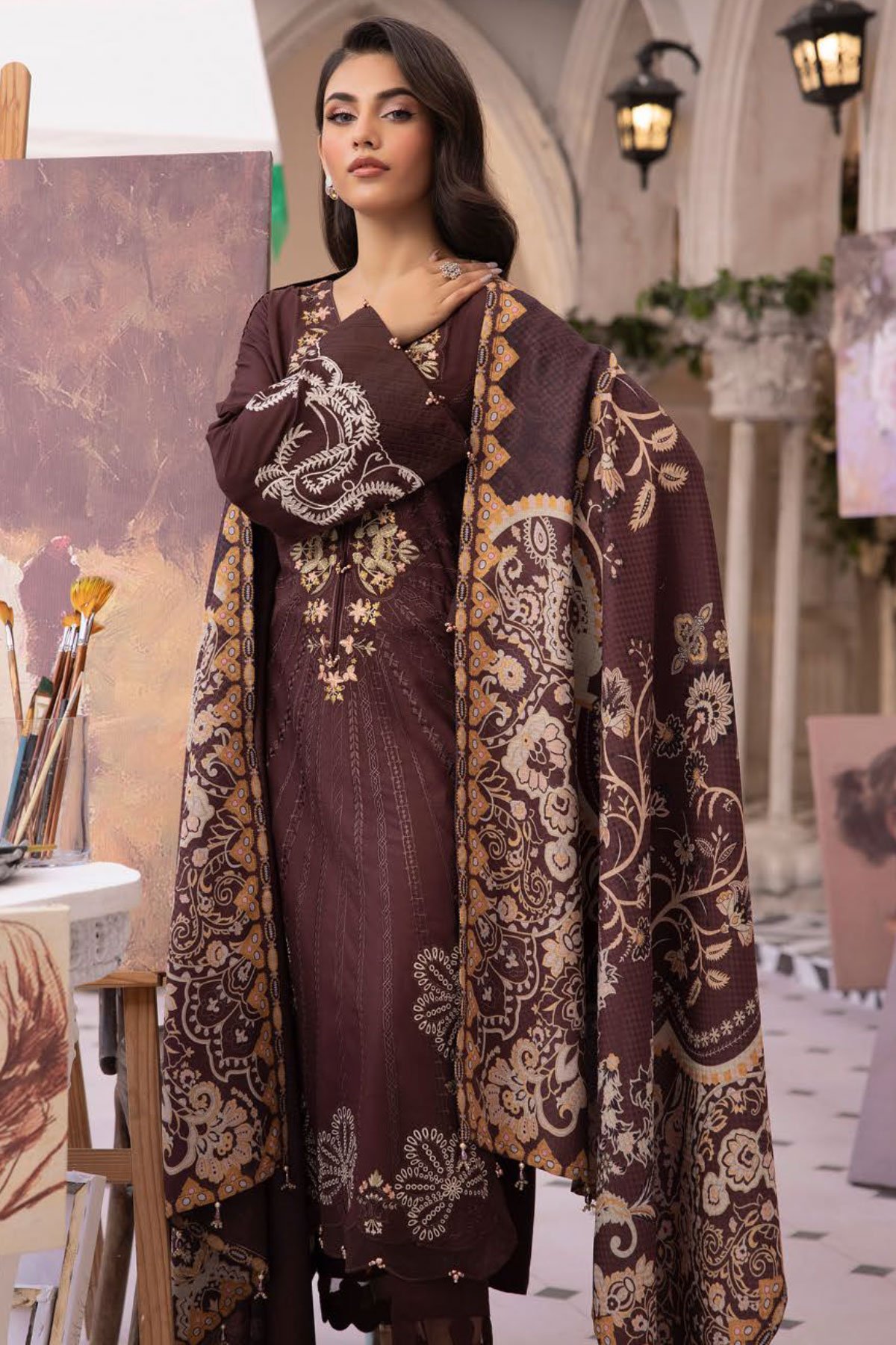 This beautiful luxury linen 3 piece suit features a straight shirt with luxury thread work embroidery throughout with bead embellished front, finished with full length embroidered sleeves. It comes with straight leg linen trousers and the look is finished with a linen printed dupatta. Perfect winter collection for this season.
