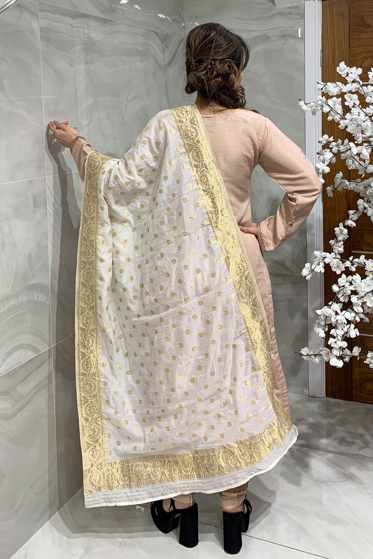 This beautiful white coloured banarsi dupatta features gold printed border along with gold printed patterns in between. Our dupattas are timeless and versatile, wear with our casual co-ords.