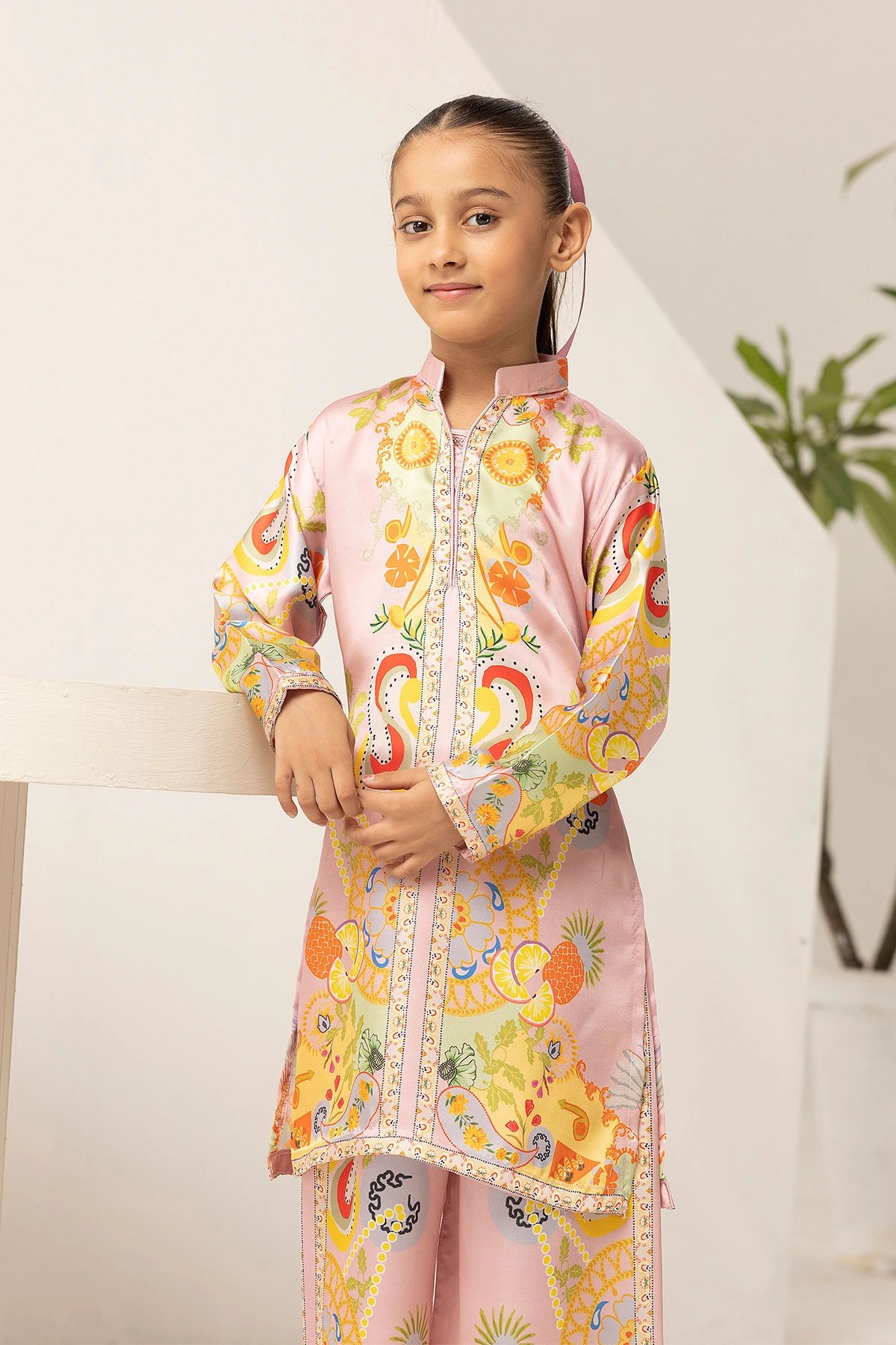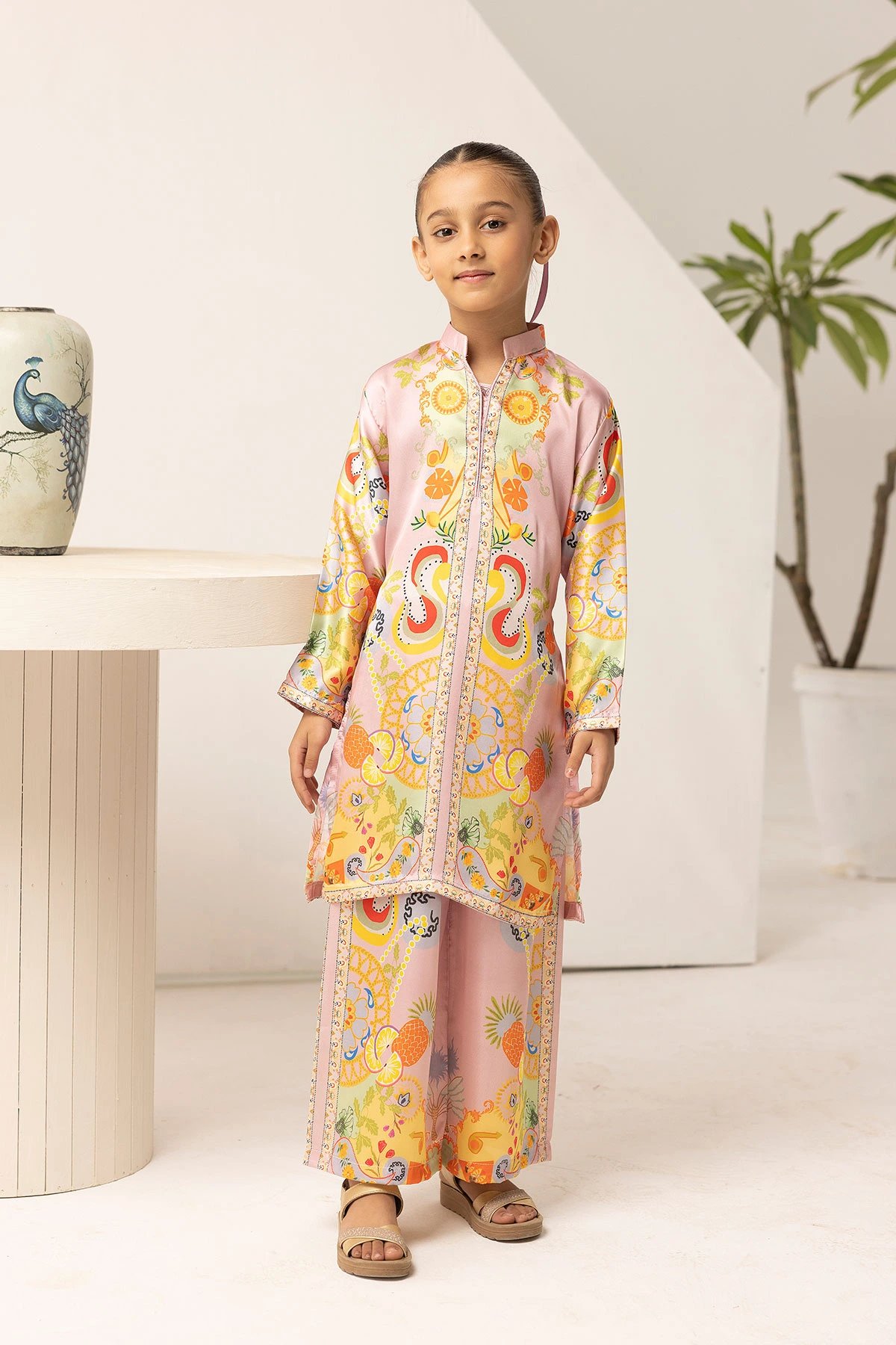 This beautiful 2-piece kids co-ord set is designed for effortless elegance and comfort. A straight shirt crafted from french silk crepe fabric, features a captivating printed design that adds a modern and stylish touch. Paired with matching printed plazo trousers, this ensemble offers a fluid and relaxed silhouette, perfect for both casual and semi-formal occasions. A versatile addition to your wardrobe, ideal for all-day wear with a chic and contemporary appeal. Note: The printed patterns on the borders may vary in each piece.