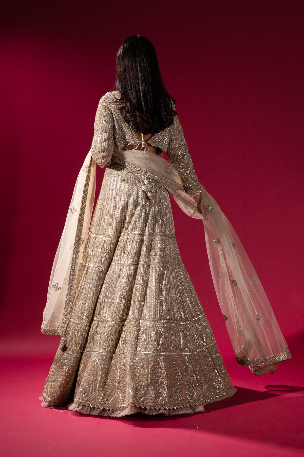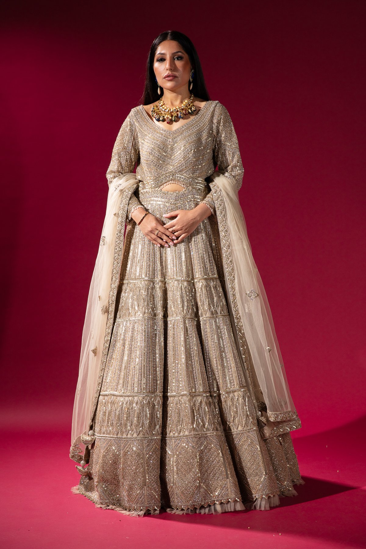 This beautiful luxury embroidered gown features luxury thread work embroidery through out the front, back and full length sleeves along with luxury sequence embellishments in between and dangling beads on the waist with a cut out. The look is finished with an embroidered net dupatta.