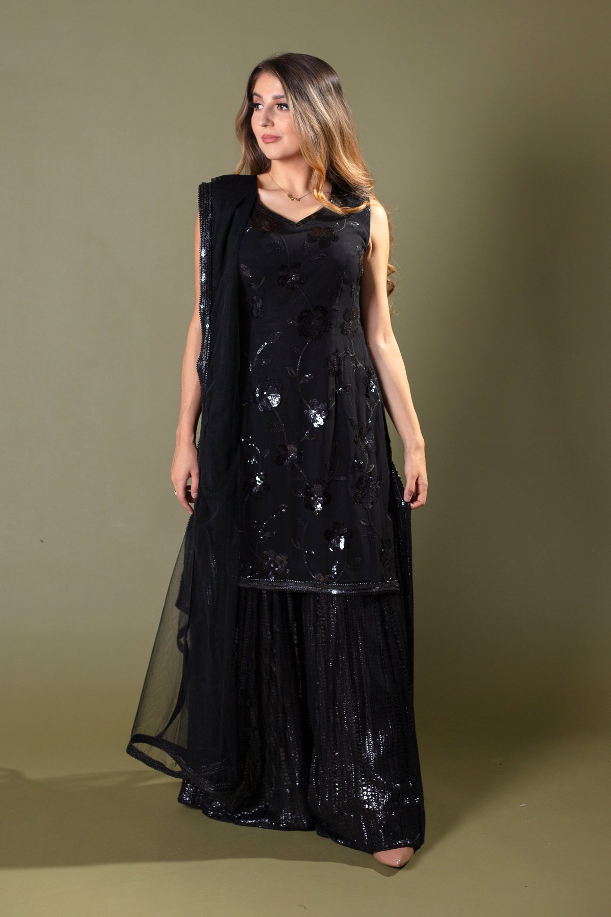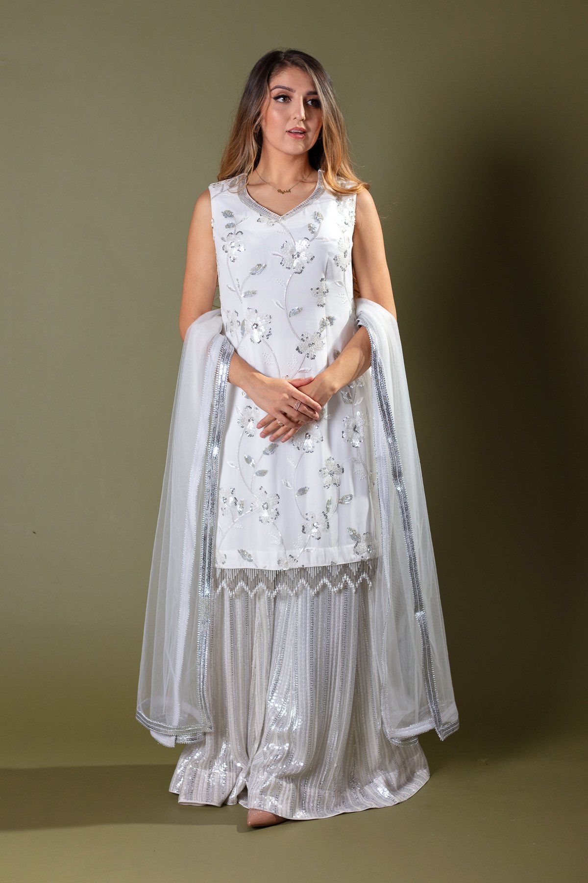 This beautiful 3 piece suit features a straight shirt with luxury thread work and sequence embroidered patterns throughout, finished with dangling beads on the border. It comes with a crushed sharara and the look is finished with a net dupatta. Note: Extra material for sleeves are attached.