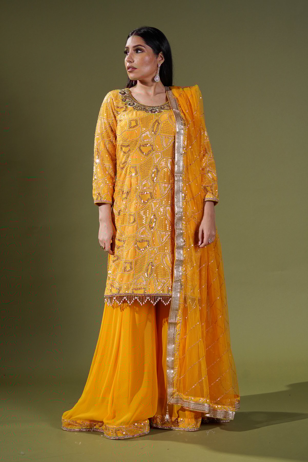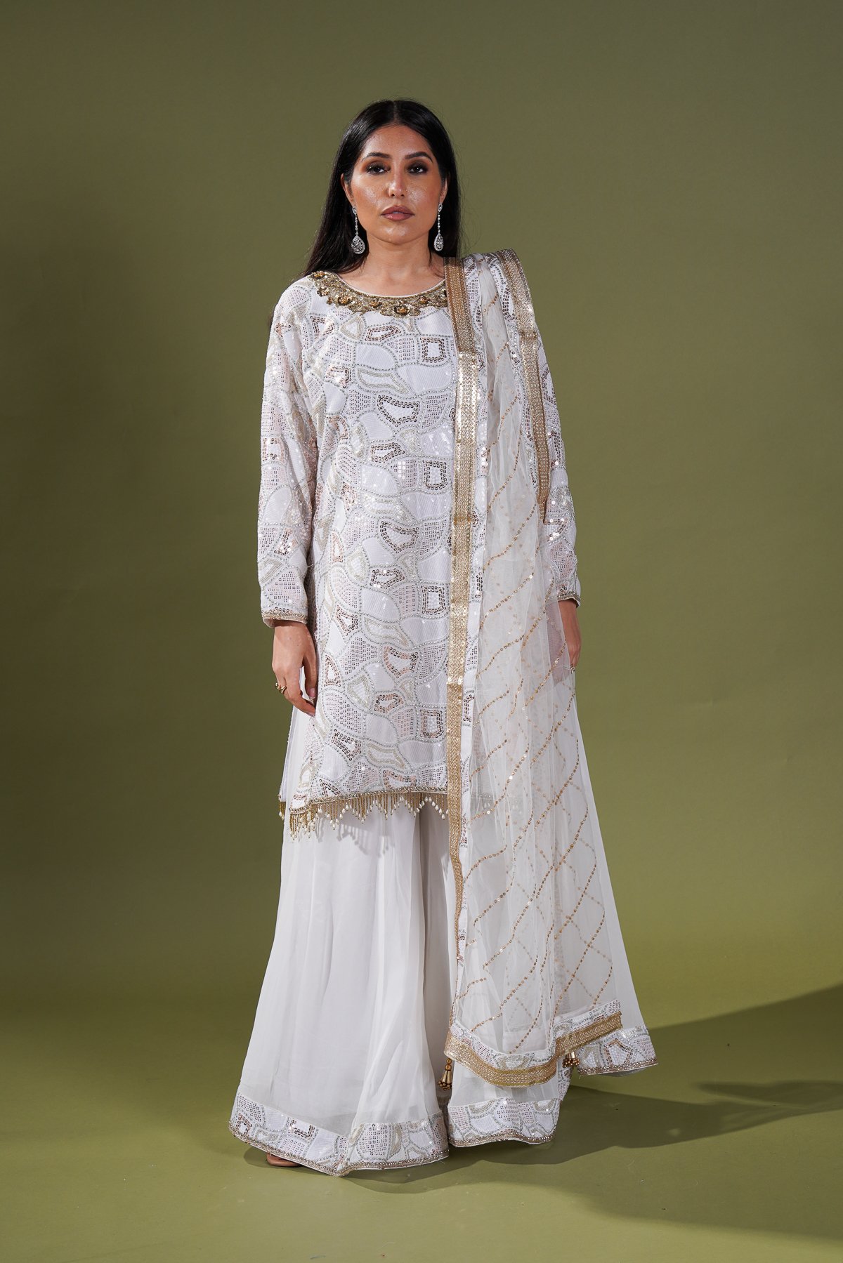 This beautiful 3 piece suit features a straight shirt with sequence embroidery throughout with motif embellished neckline, finished with dangling beads on the border. It comes with full length embroidered sleeves and a chiffon sharara. The look is finished with a net embroidered dupatta.