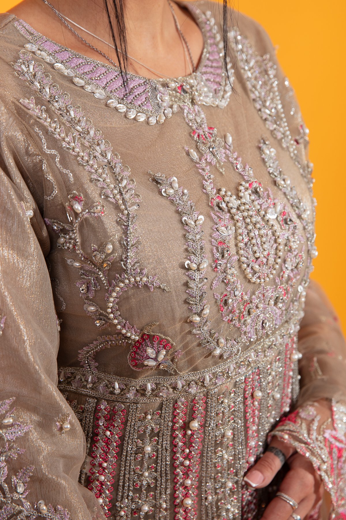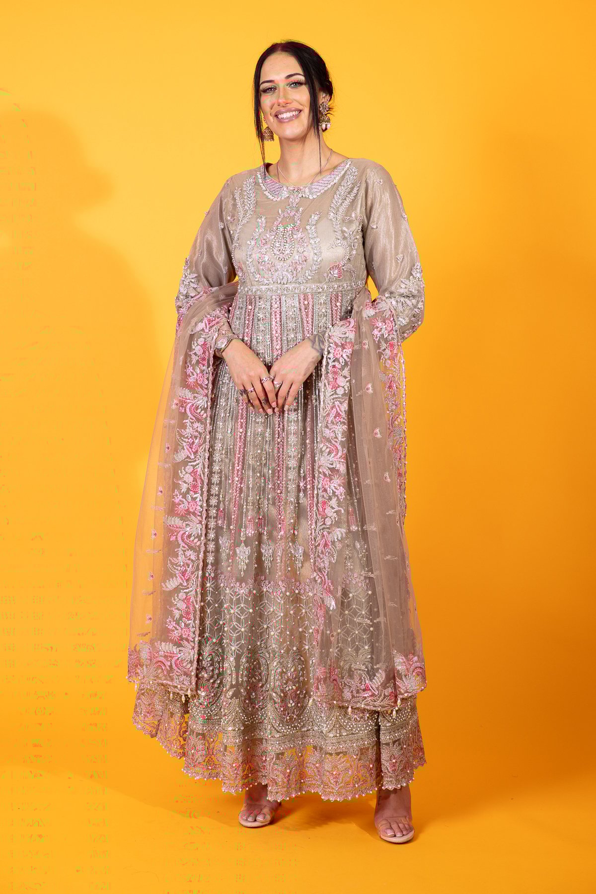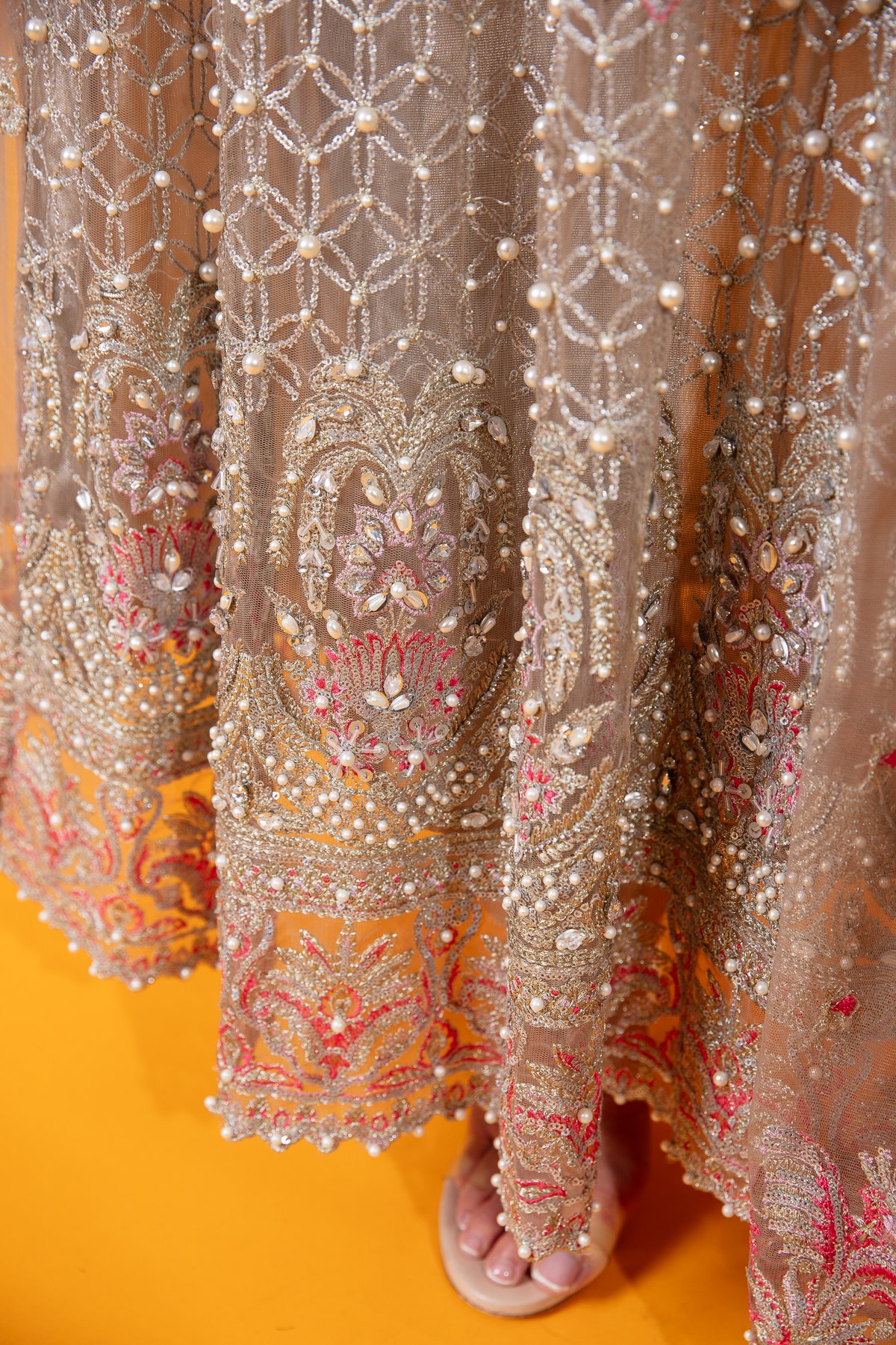This beautiful 3 piece organza long dress features luxury thread work embroidery along with pearl embellishment throughout the front and full length sleeves, finished with straight leg crepe trousers and an embroidered organza dupatta.
