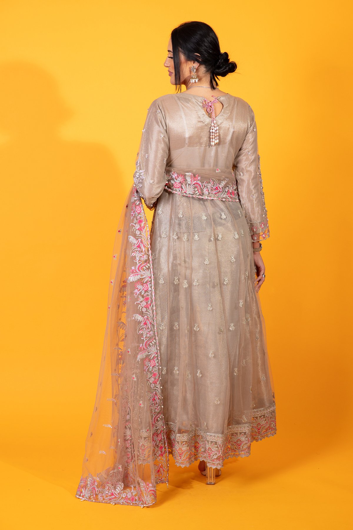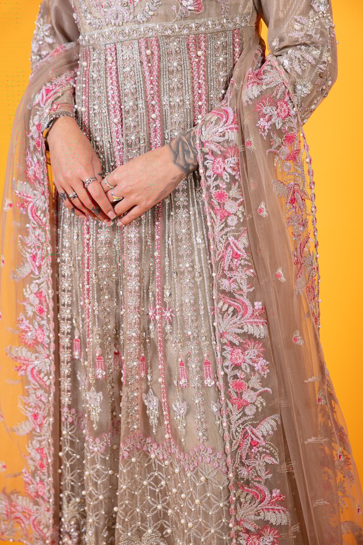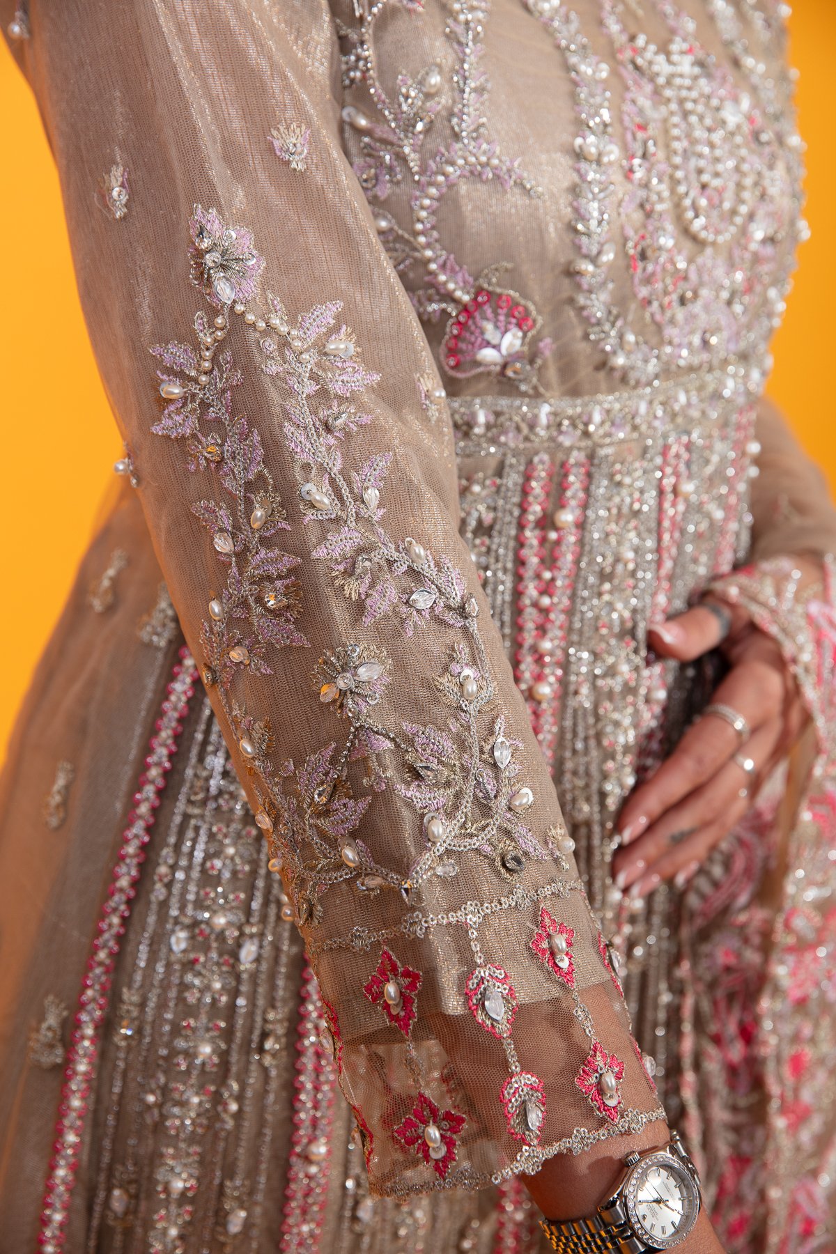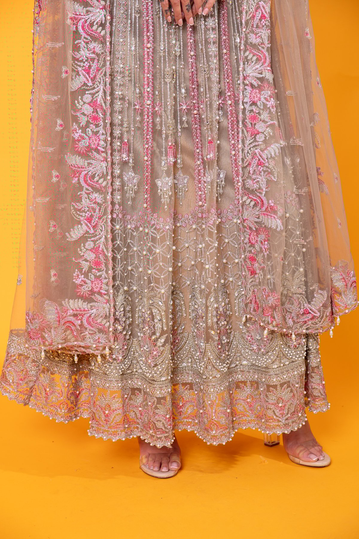This beautiful 3 piece organza long dress features luxury thread work embroidery along with pearl embellishment throughout the front and full length sleeves, finished with straight leg crepe trousers and an embroidered organza dupatta.
