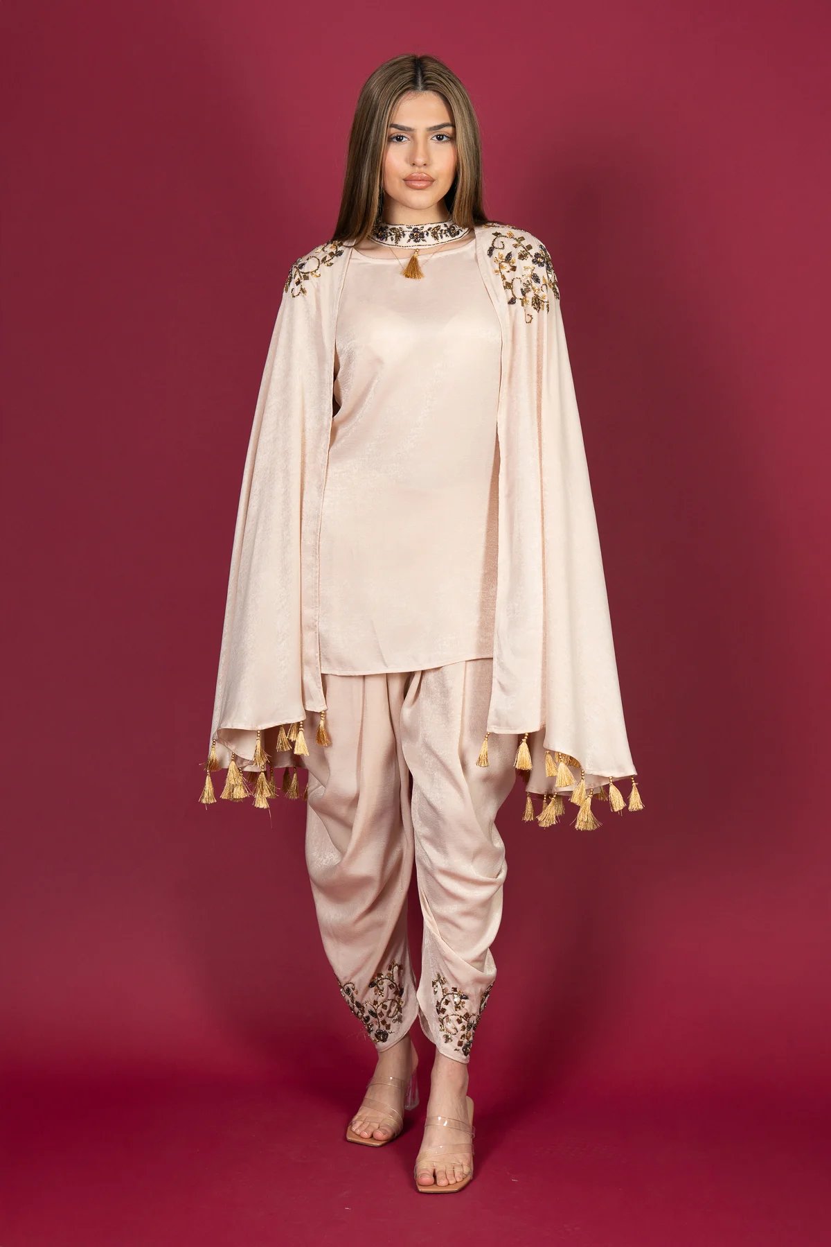 This beautiful 2 piece modest wear collection is designed for elegance and sophistication. The outfit features a plain crepe top layered with an embroidered jacket, complemented by a delicately embroidered necklace detail for a refined touch. Paired with a tulip shalwar, also adorned with embroidery, this ensemble offers a graceful and stylish look, perfect for Eid celebrations and special occasions.