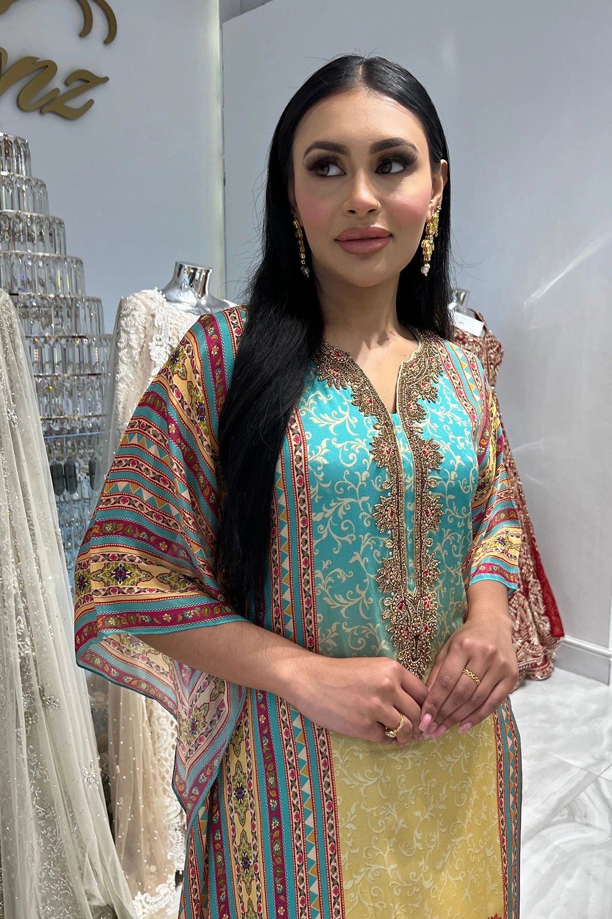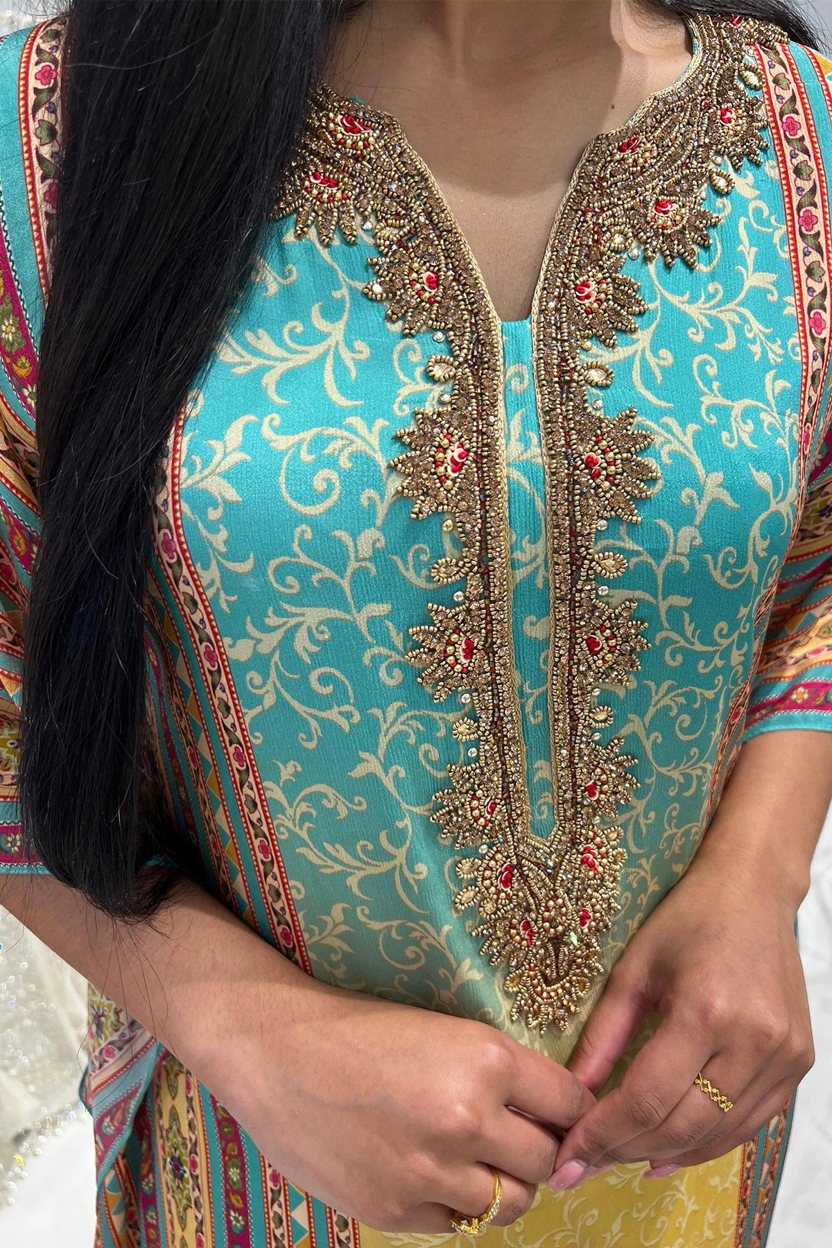 This beautiful kaftan is crafted from lightweight georgette, offering a graceful and flowy silhouette. The neckline is adorned with delicate beadwork, adding a touch of sophistication to the design. Perfect for elegant wear and special occasions.