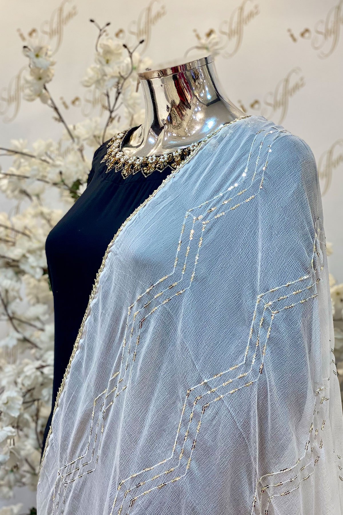 Add a touch of elegance to your wardrobe with this exquisite piece of splendid soft chiffon dupatta. Swathed with delicate sequence embroidery, finished with lace on the borders, this versatile stunner is a must in your collection.