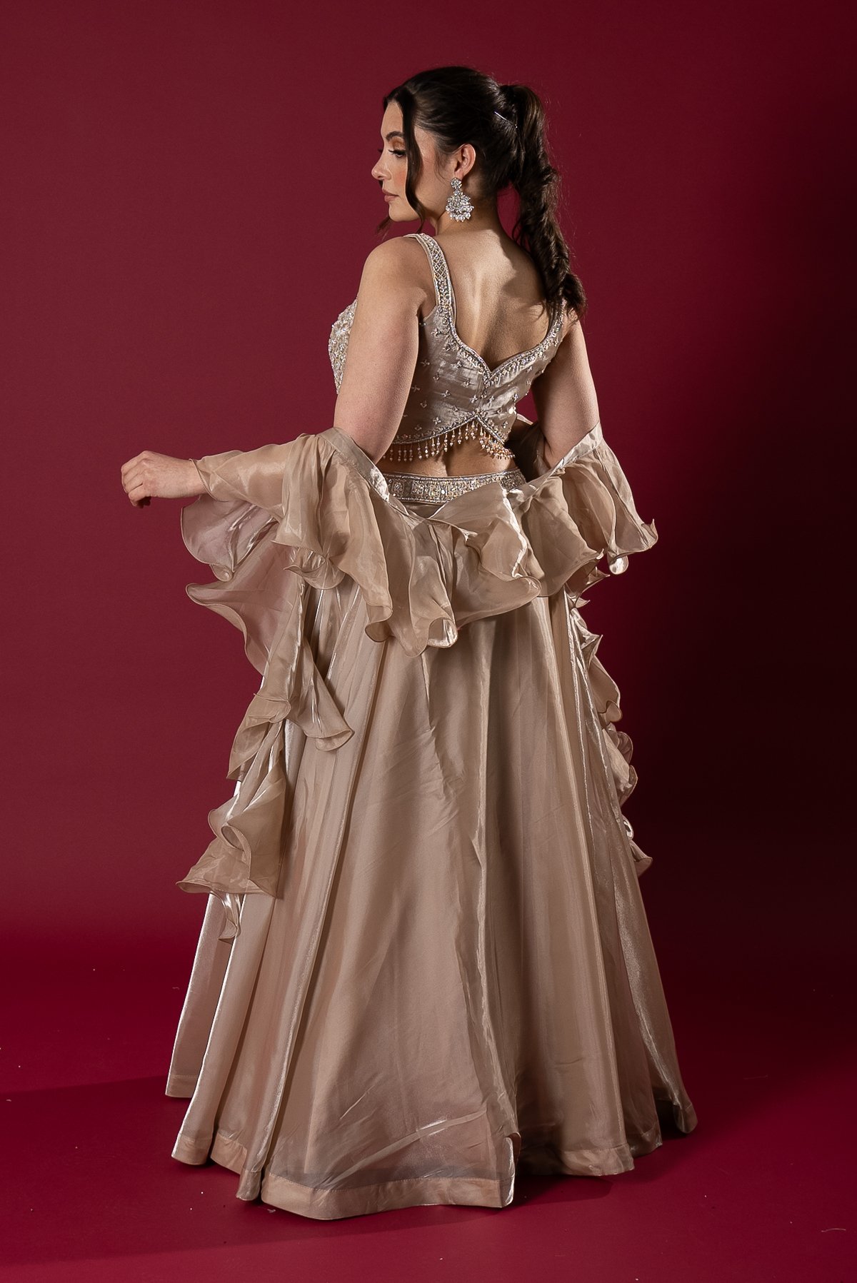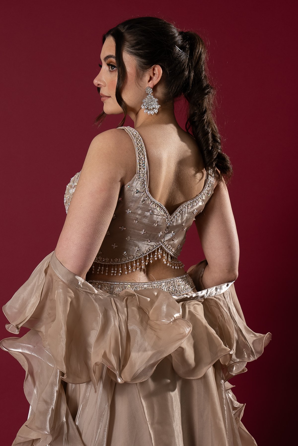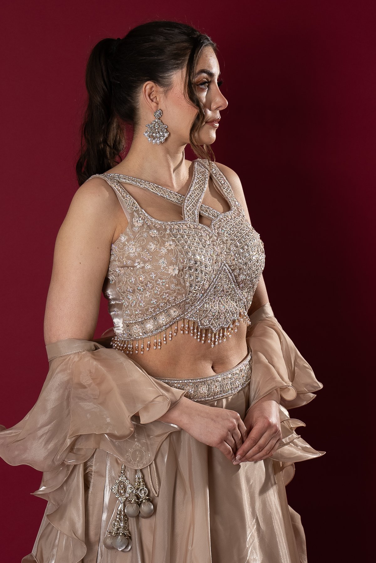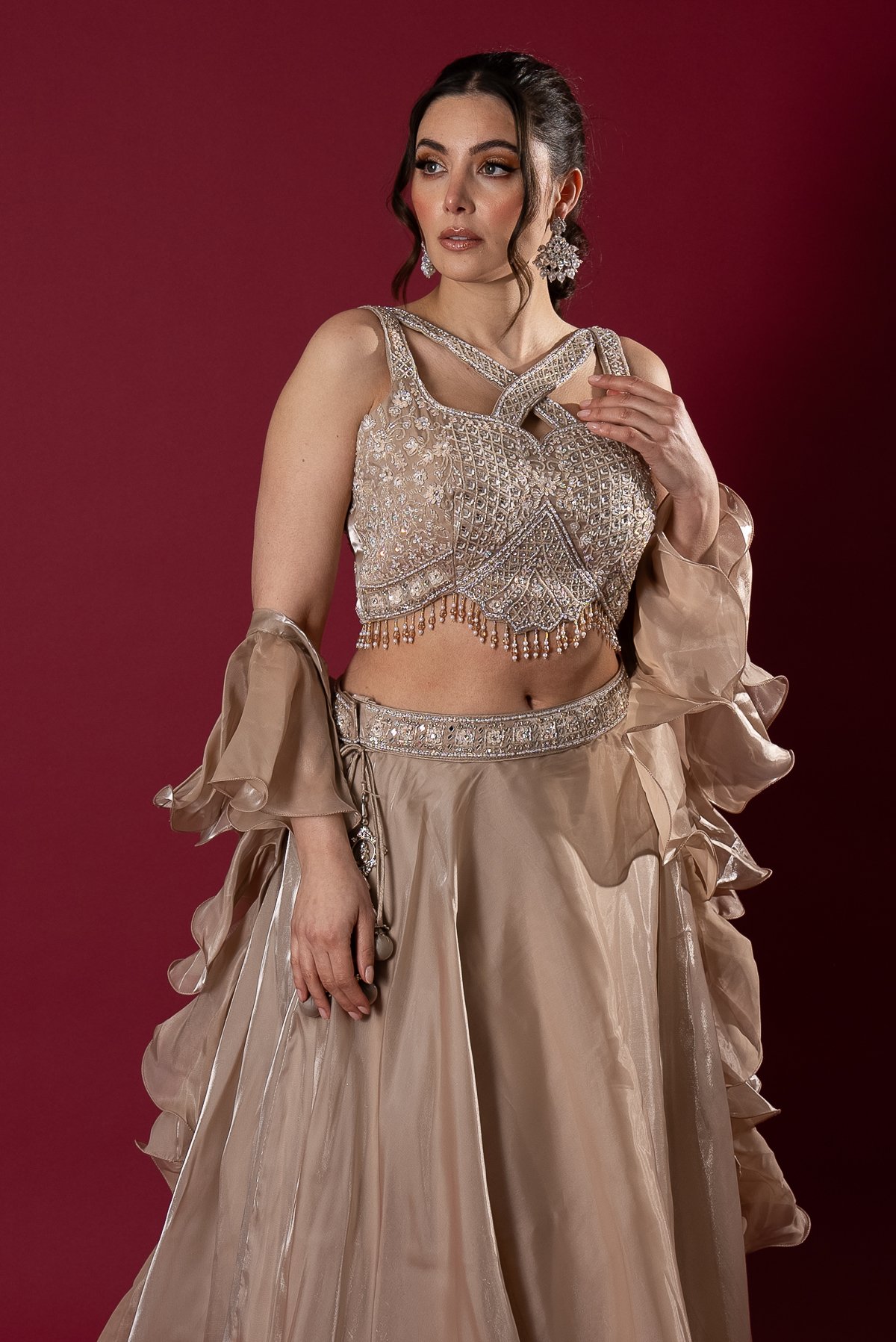 This beautiful 3 piece lengha choli features a short blouse with luxury thread work embroidery with sequence and diamantés embellishments, finished with dangling beads from the waist and an embroidered cut design neckline, It comes with a silk plain lengha with an embroidered waist and the look is finished with a ruffled dupatta.