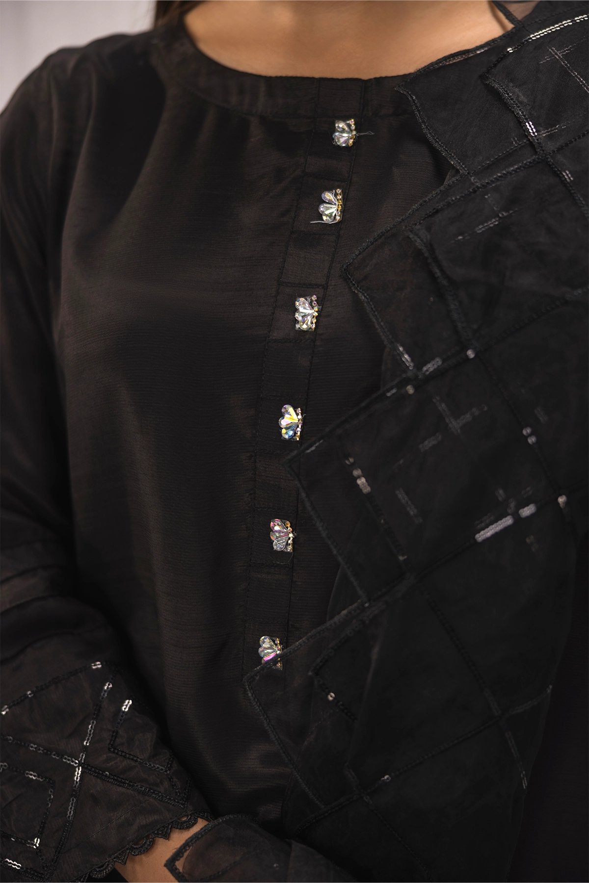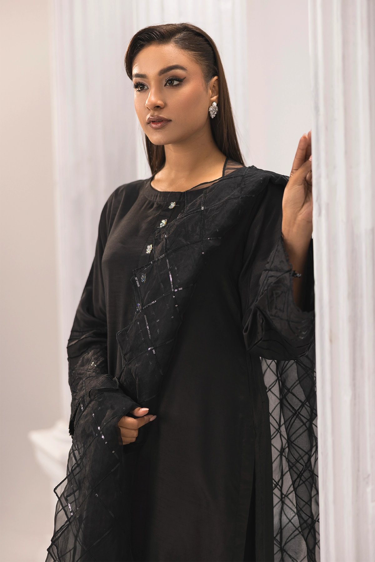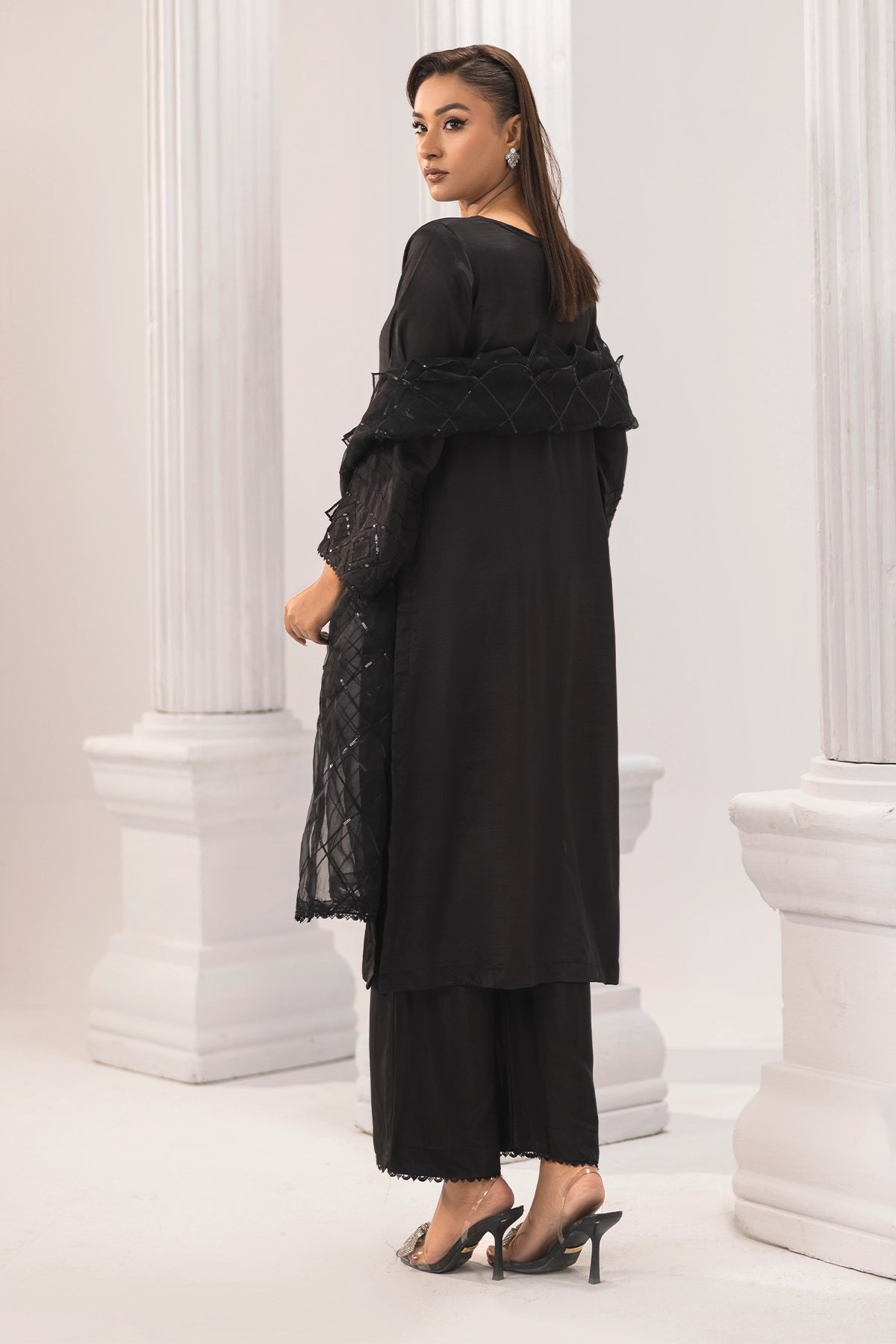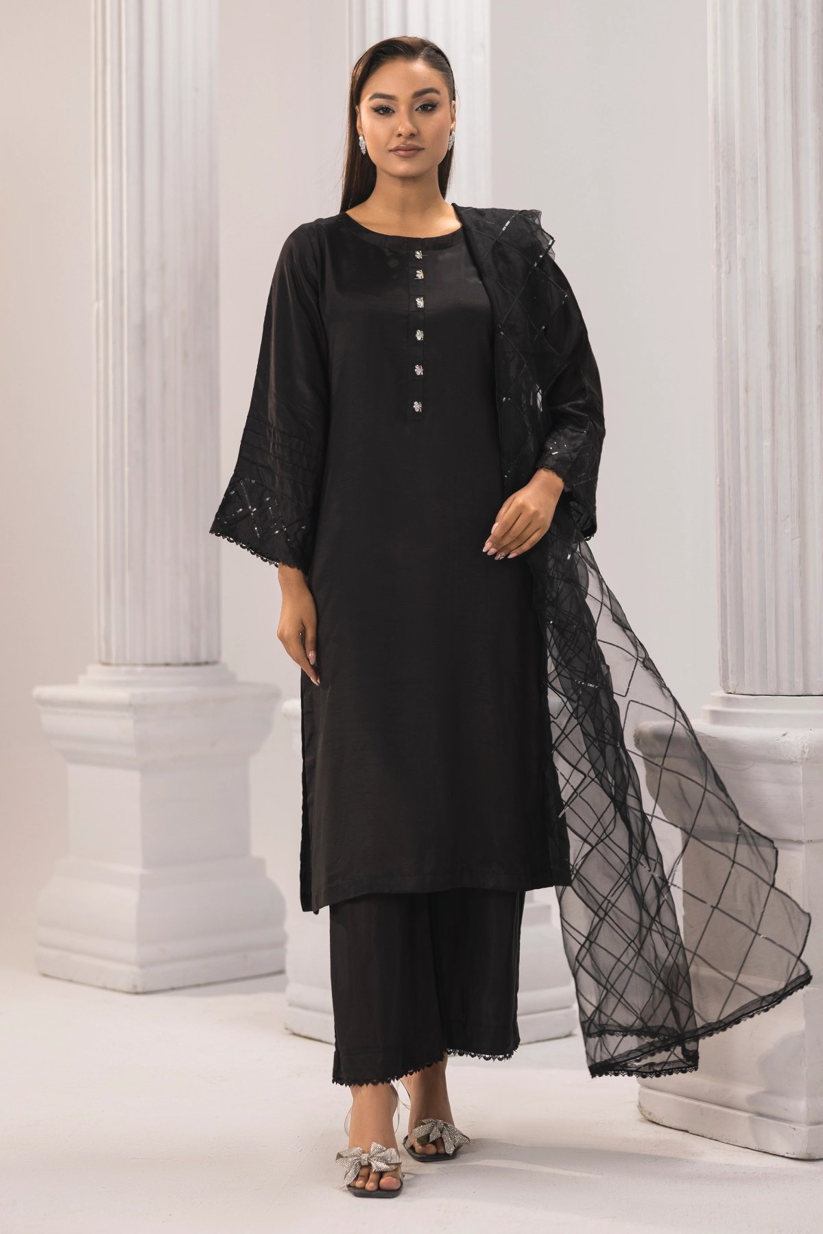 This beautiful 3-piece suit is made from soft silk fabric, featuring a straight kameez with elegant embroidery for a stylish yet timeless look. It comes with a matching straight trouser, offering a sleek and modern fit. The set is completed with a lightweight organza dupatta, decorated with delicate sequin work for a subtle touch of sparkle. Perfect for festive occasions and Eid wear.
