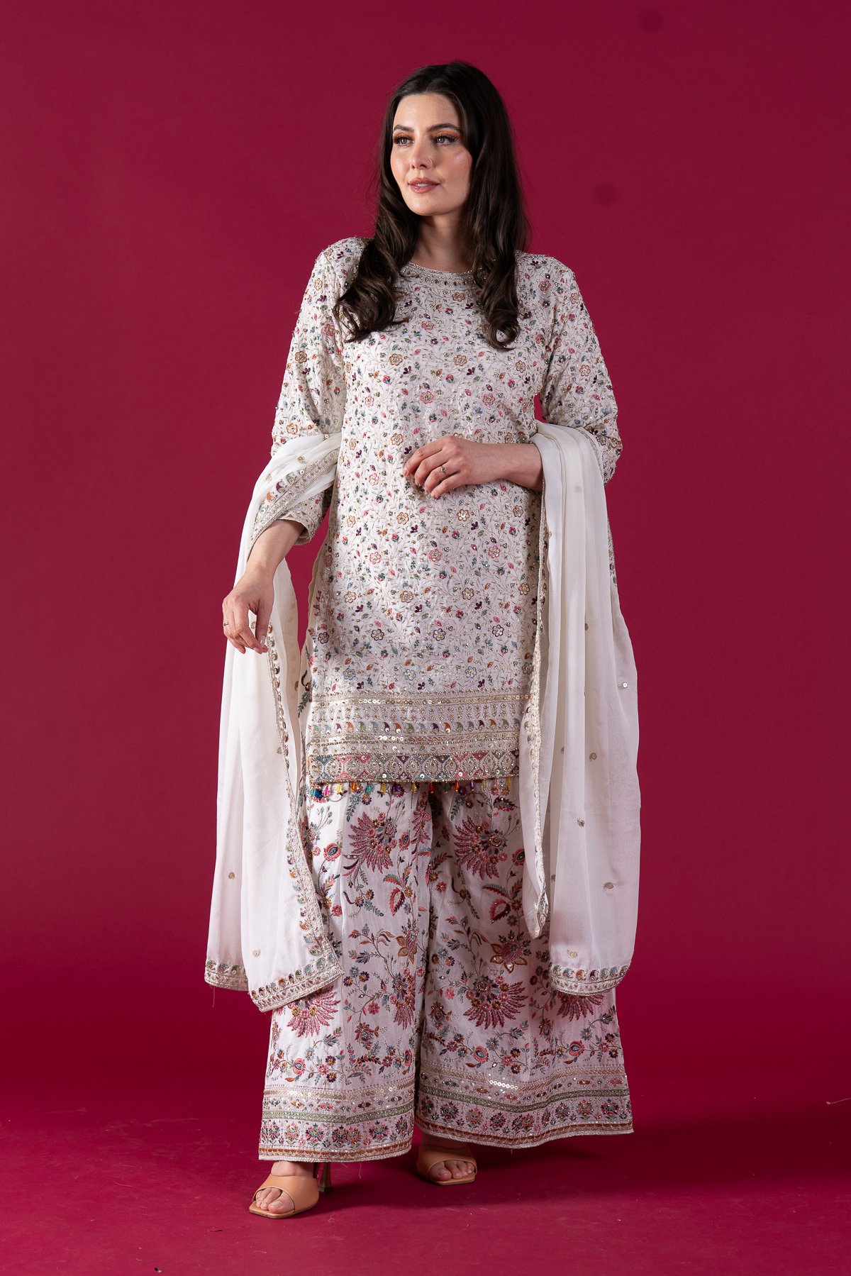 This beautiful 3 piece suit features a chiffon straight shirt with luxury thread work embroidery along with sequence embellishment throughout finished with multi coloured dangling beads on the border. It comes with full length embroidered sleeves. Paired with a luxury multi coloured floral embroidered plazo and the look is finished with a chiffon embroidered dupatta.