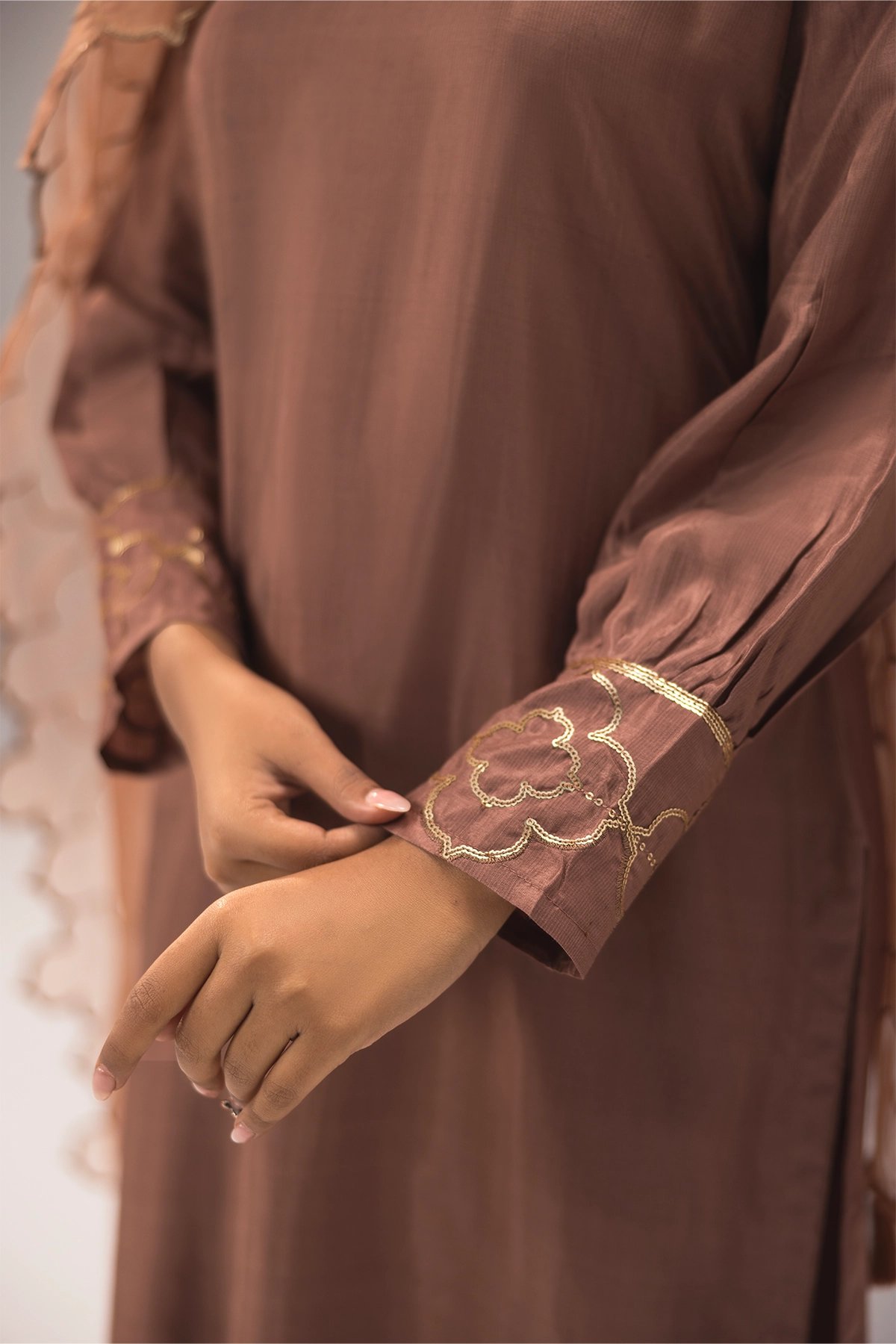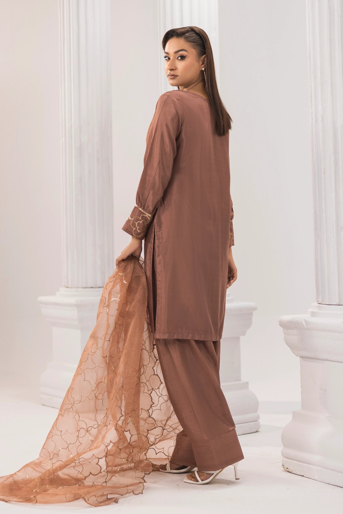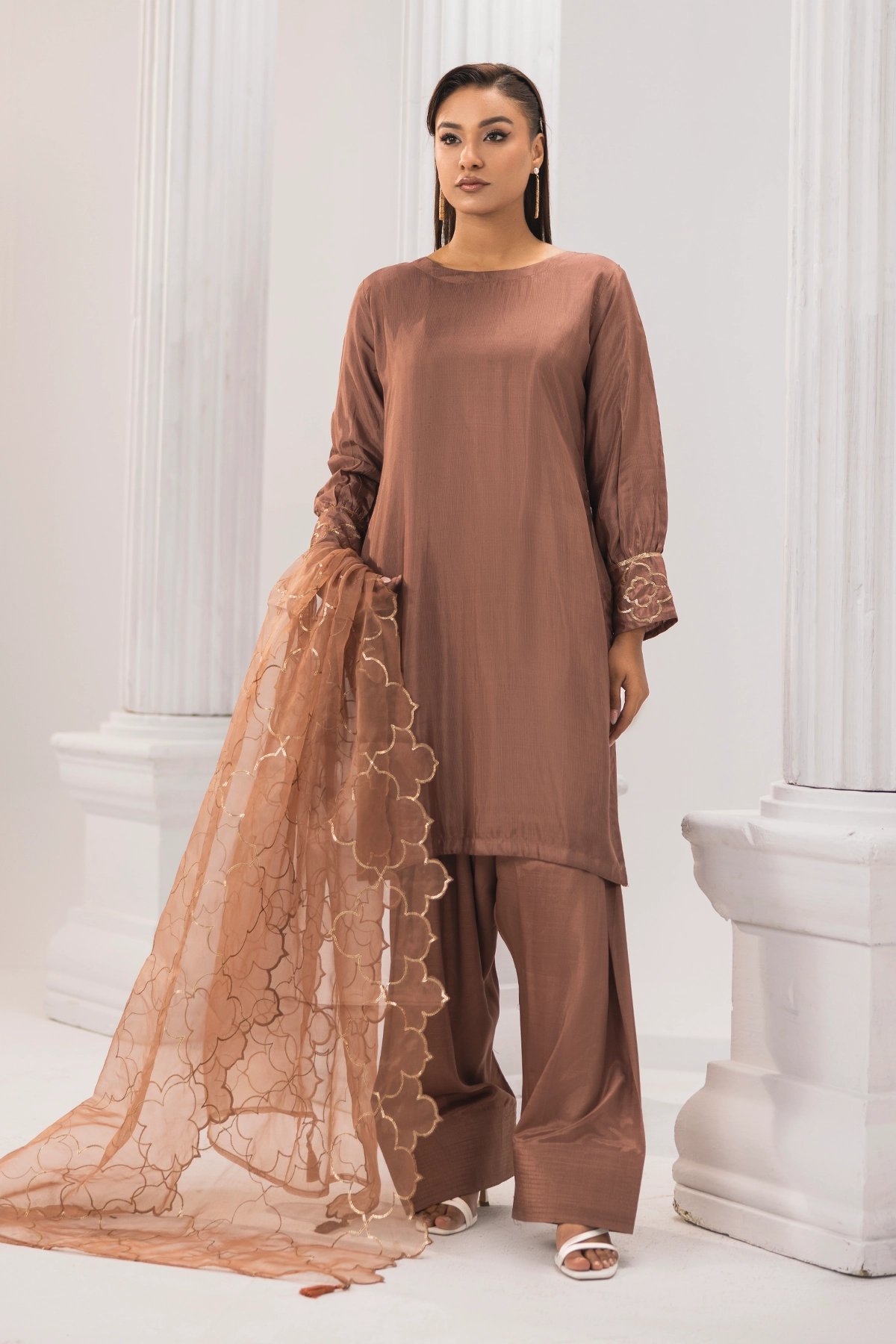 This beautiful 3-piece suit is made from luxurious silk fabric, featuring a straight kameez with elegant embroidery for a stylish yet traditional look. It comes with a matching farshi shalwar, adding a graceful and classic touch to the outfit. The set is completed with a lightweight organza dupatta, decorated with gold sequin work for a hint of sparkle. Perfect for festive occasions and Eid wear.