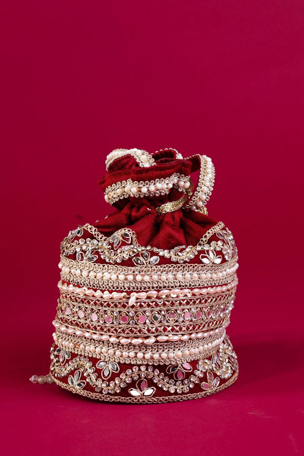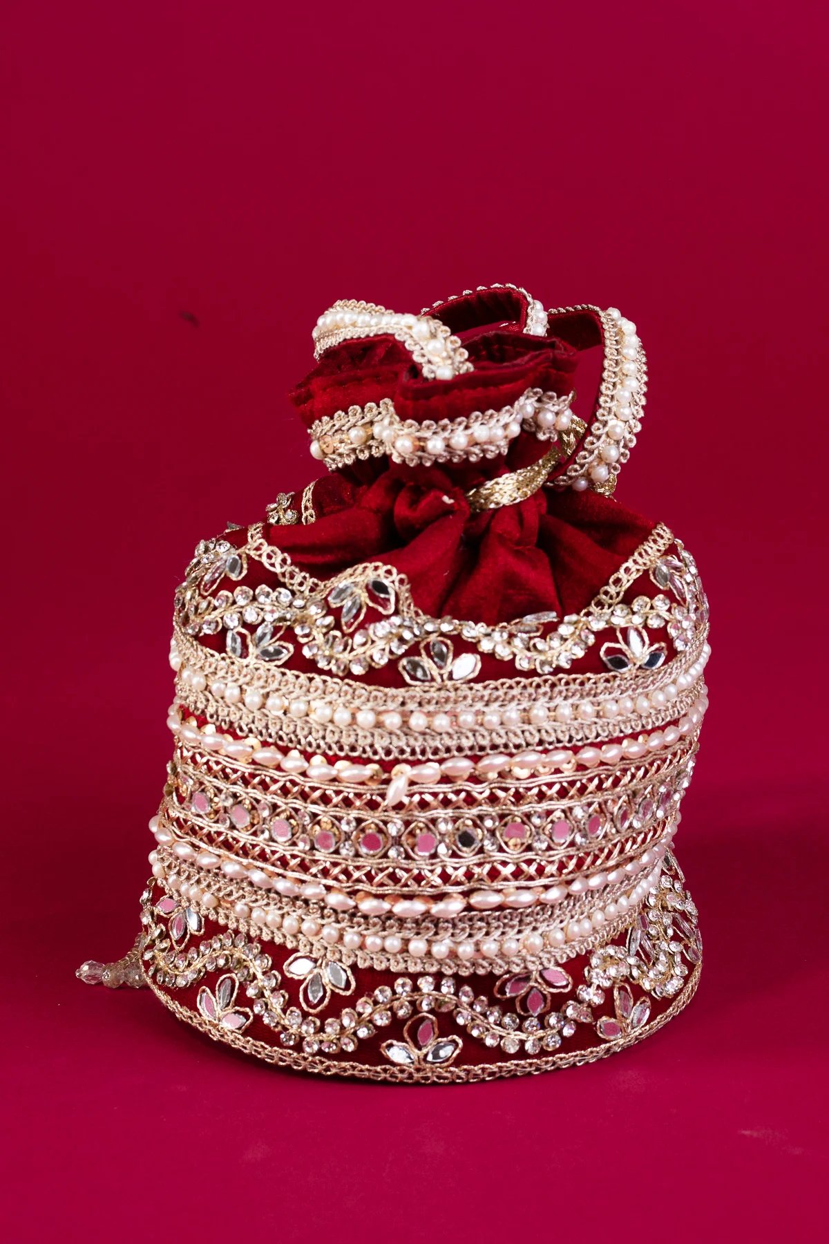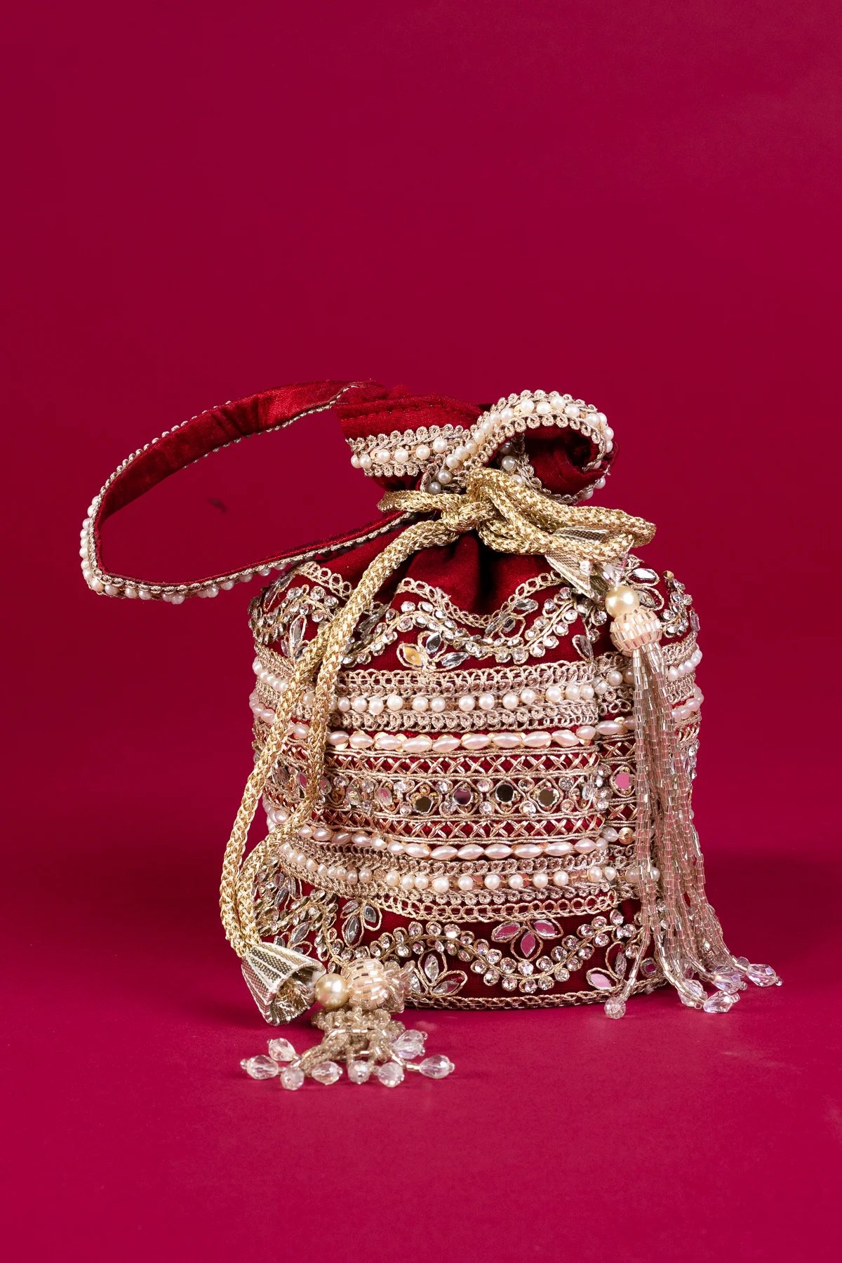 This beautiful handcrafted potli bag is made from premium crepe fabric, featuring intricate embellishments of pearls, crystals, and sequins. Designed with delicate embroidery and ornate detailing, it adds a touch of sophistication to any ensemble. The bag is secured with a drawstring closure, adorned with elegant tassels for a refined finish. Perfect for special occasions, it seamlessly blends tradition with luxury.