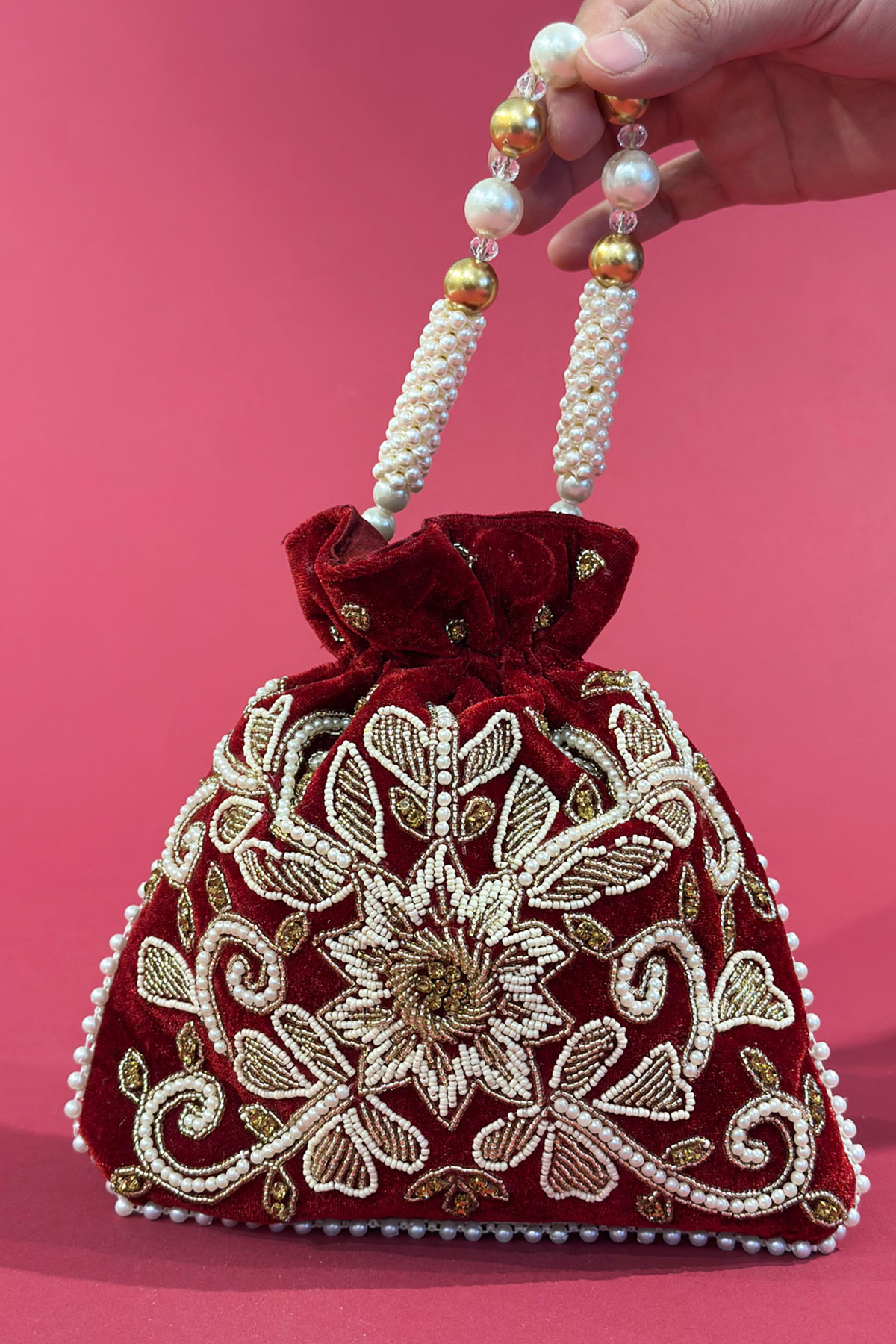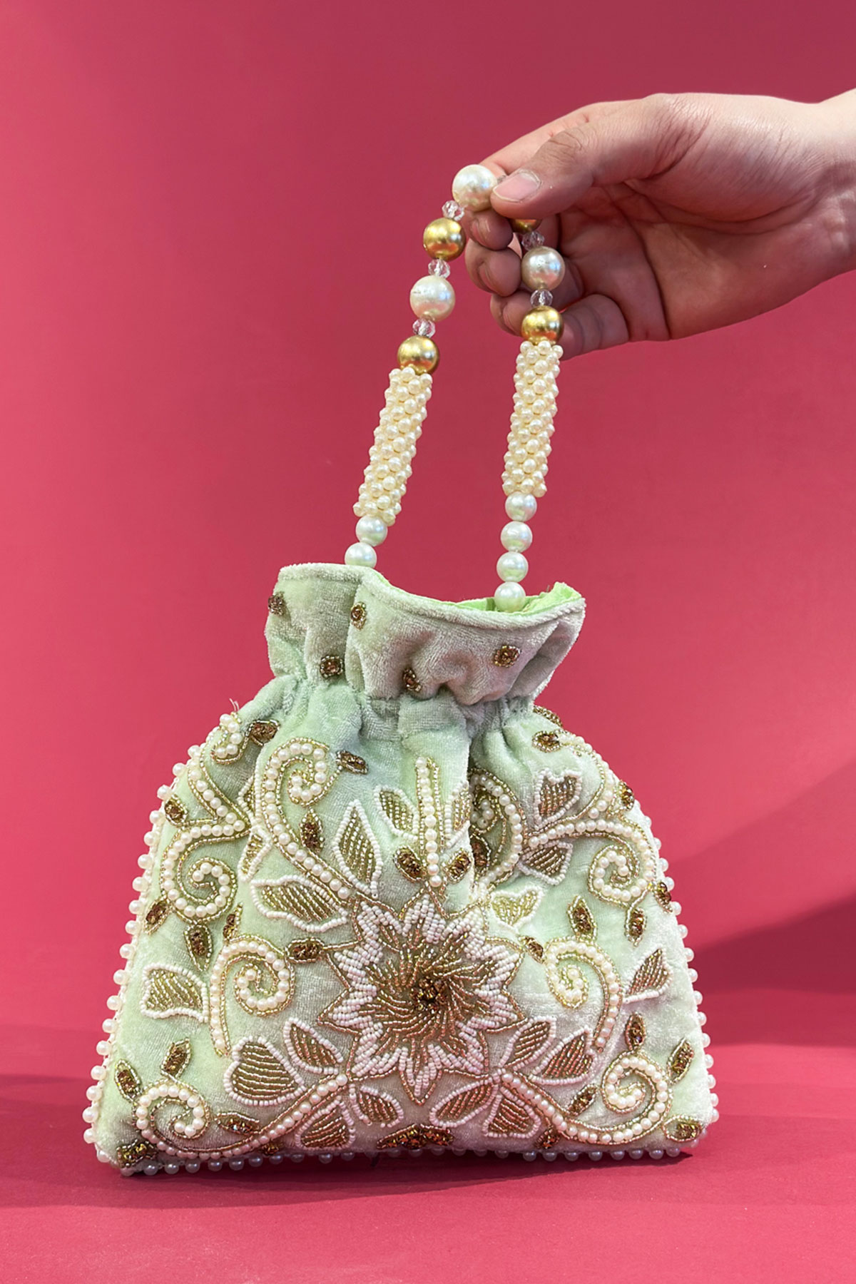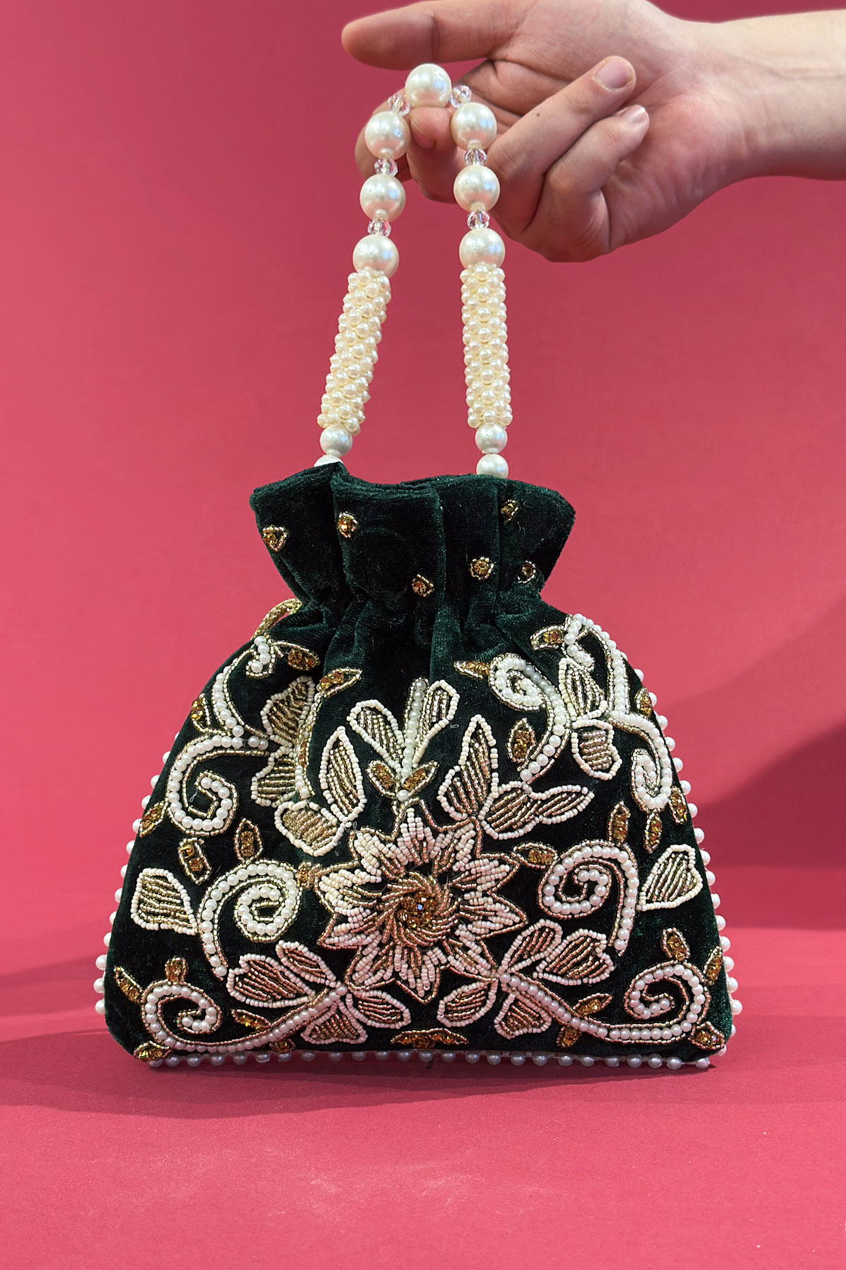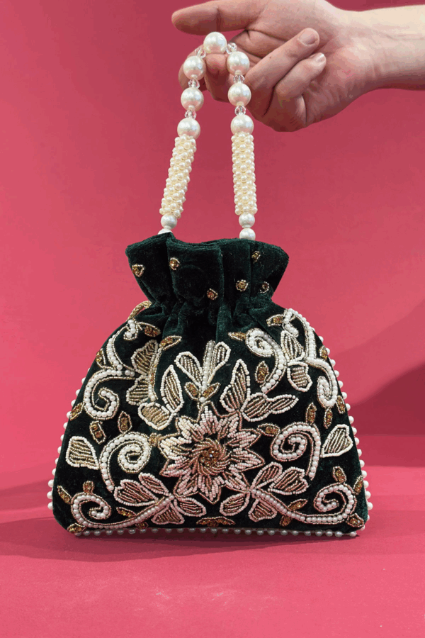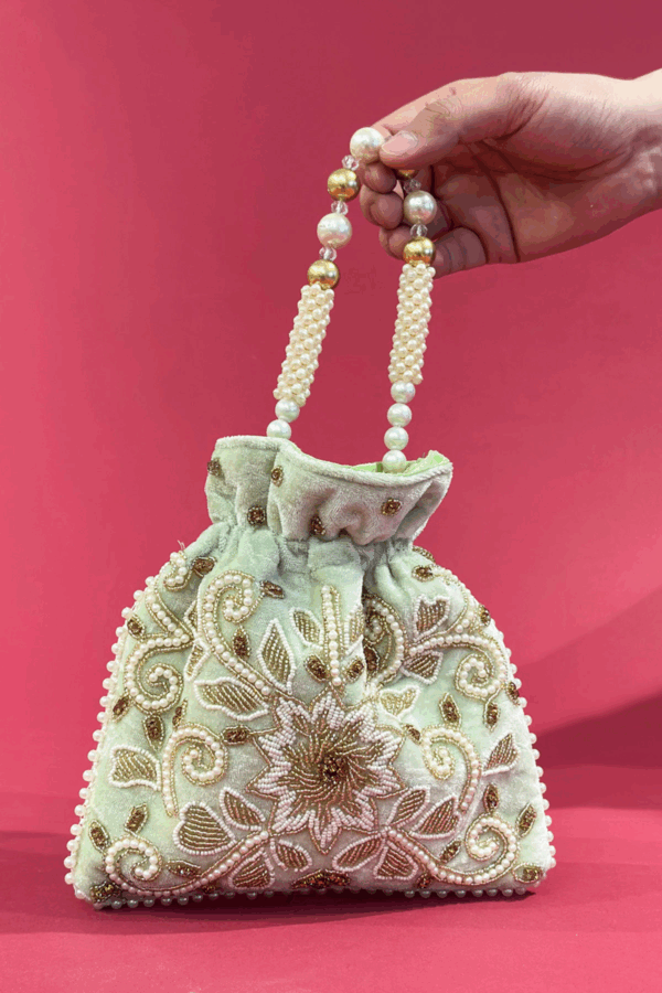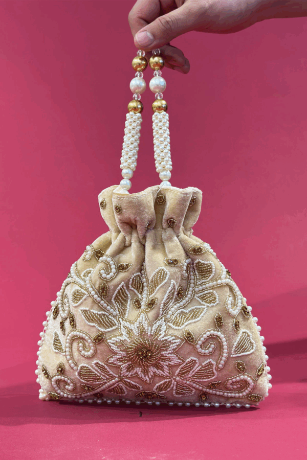 This elegant potli bag is crafted from luxurious velvet, featuring intricate hand-embellished floral detailing with beads and sequins. The delicate pearl tassels add a touch of sophistication, complementing the exquisite craftsmanship. A pearl-adorned handle enhances the overall charm, making it perfect for special occasions. The back of the bag is elegantly finished with ‘Shiffonz’ embroidery, adding a refined signature touch.